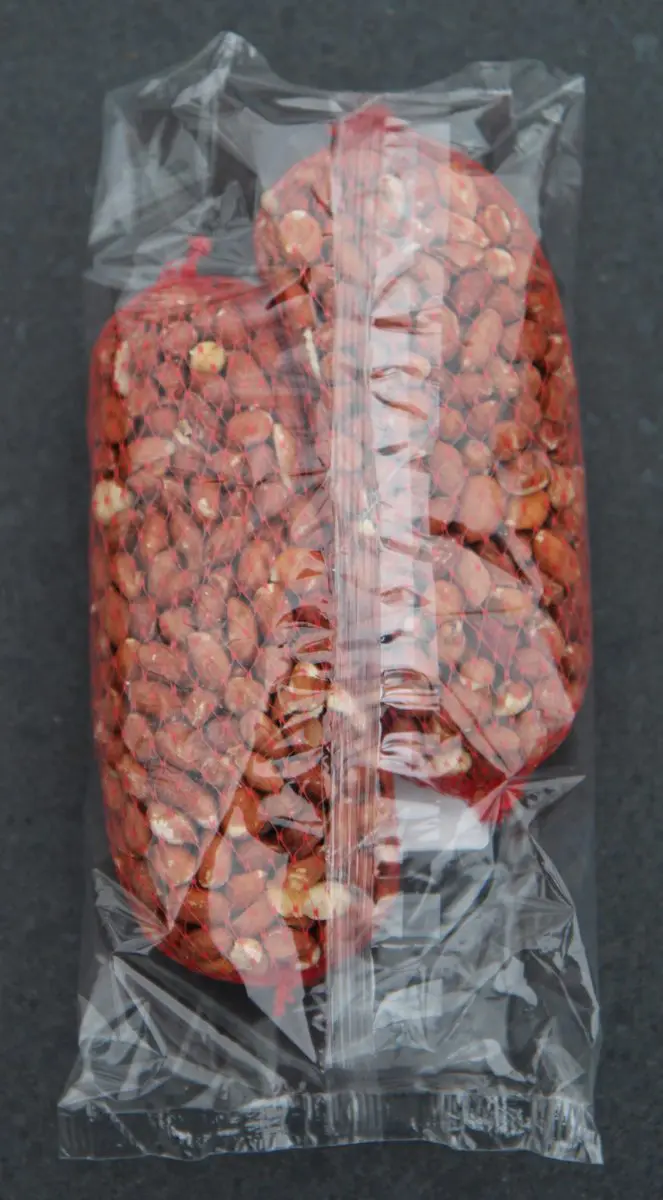 2 netjes met rode gepelde pinda’s in een plastic zak