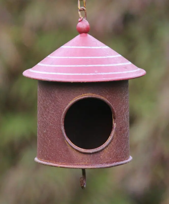 Een rond metalen vogelvoerhanger met de kenmerken van een vogelhuisje.