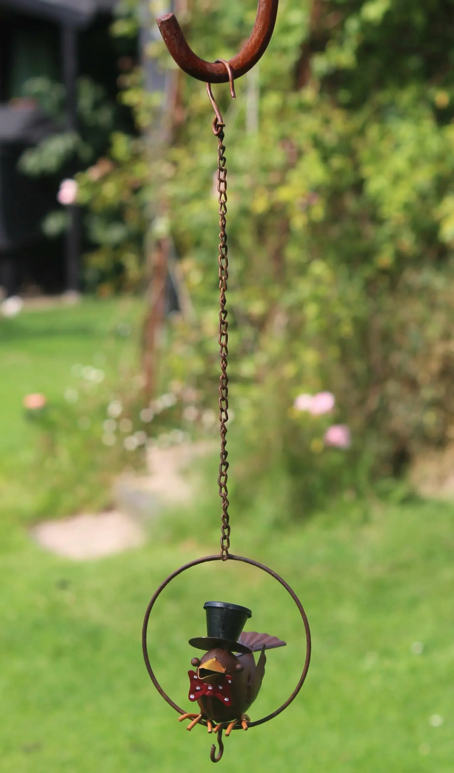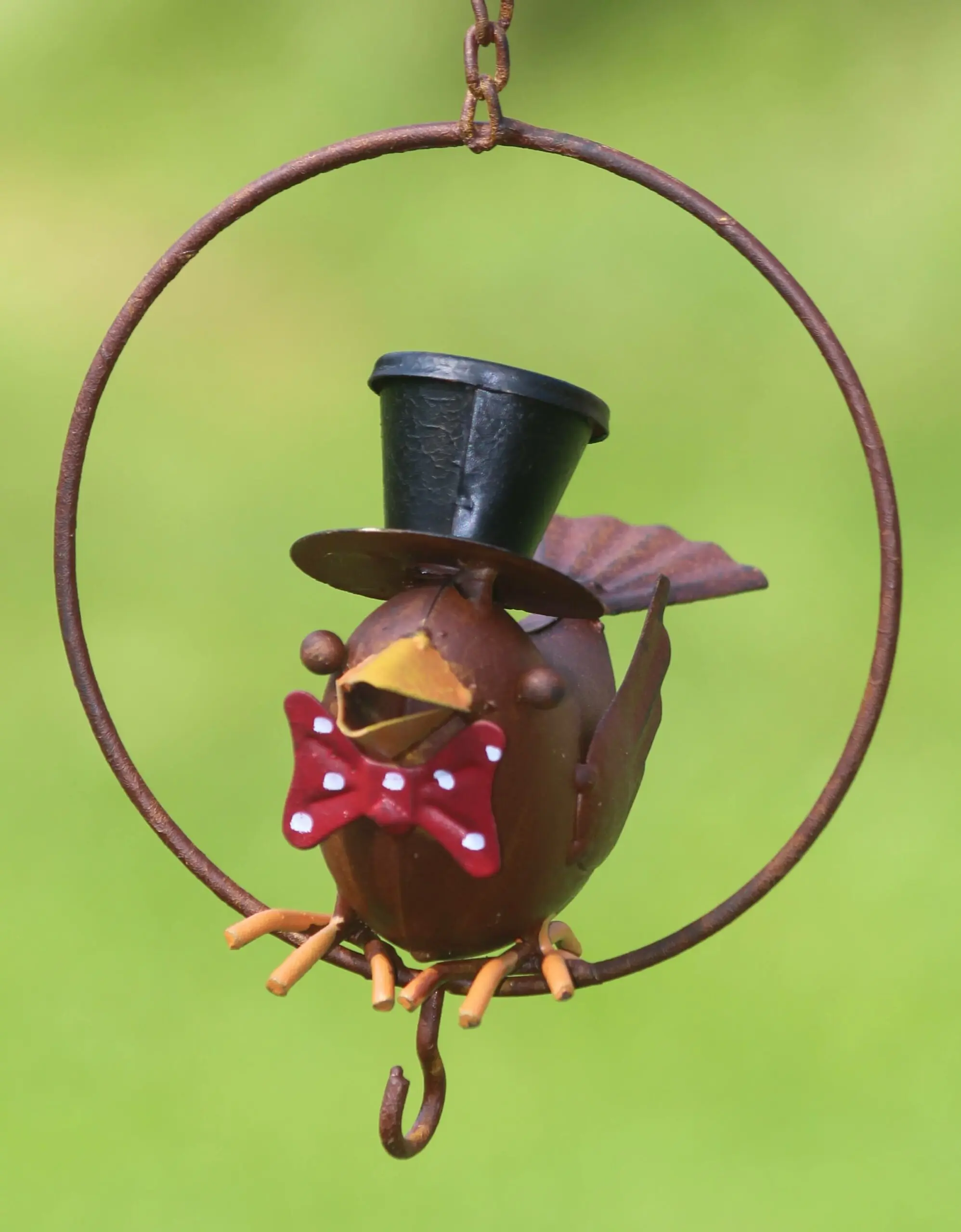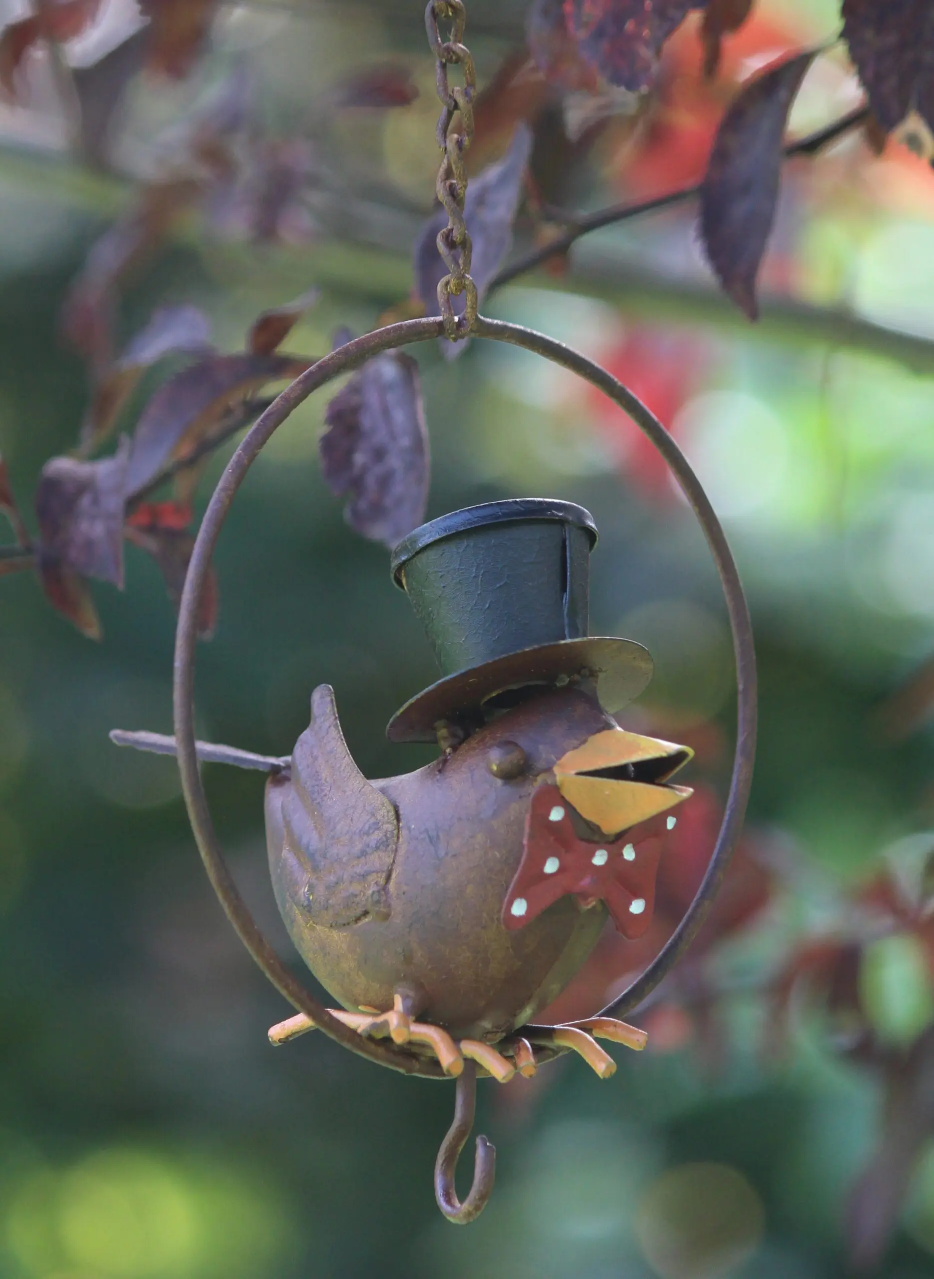 Vetbolhanger, vogelvoerhanger vogel met hoed, bruin, metaal VH262