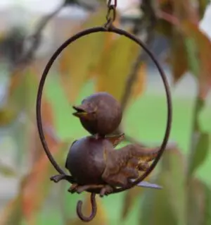 Een ronde donkerbruine metalen vogelvoerhanger met vogel.