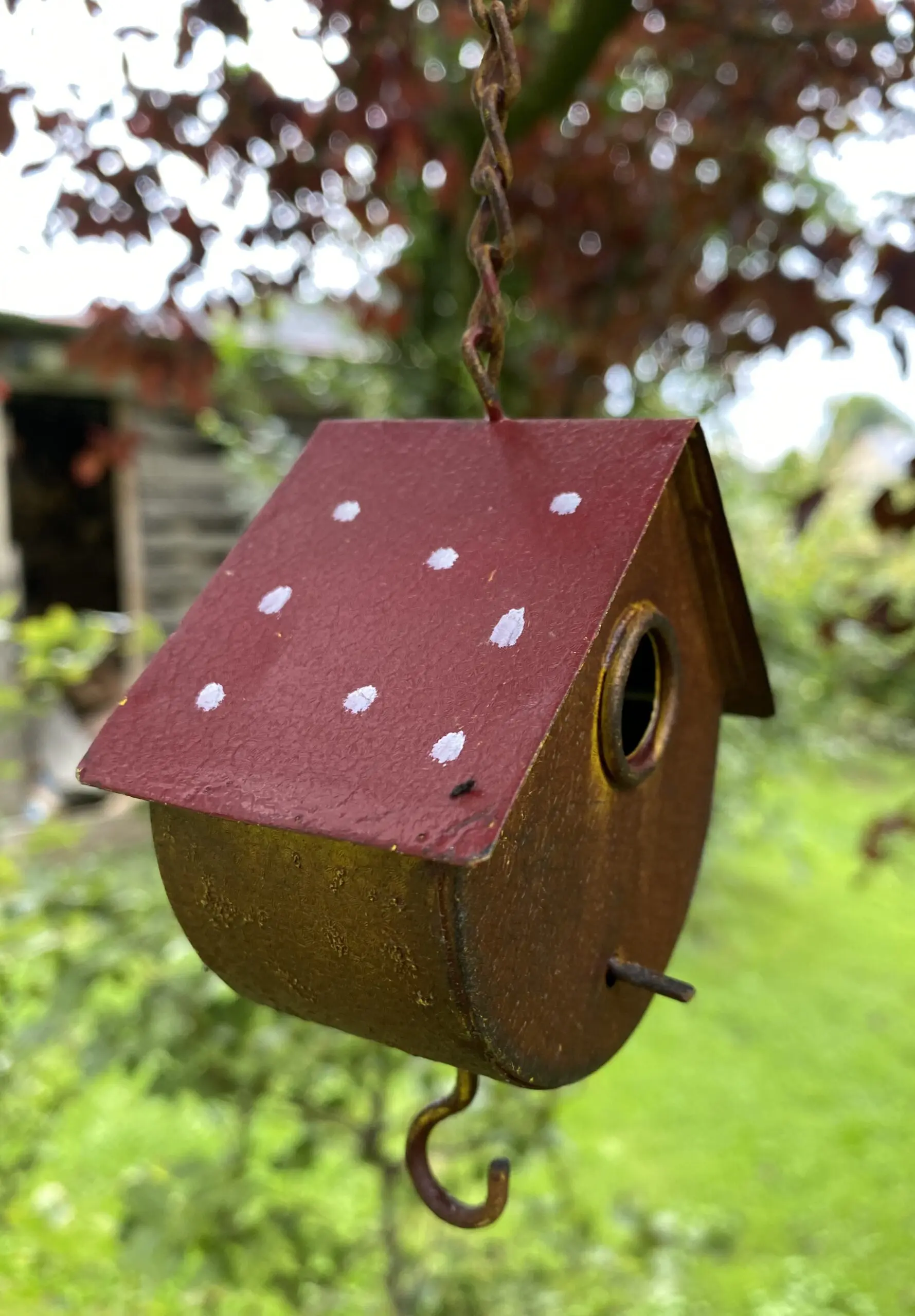 Een halfrond metalen vogelvoerhanger met de kenmerken van een vogelhuisje.