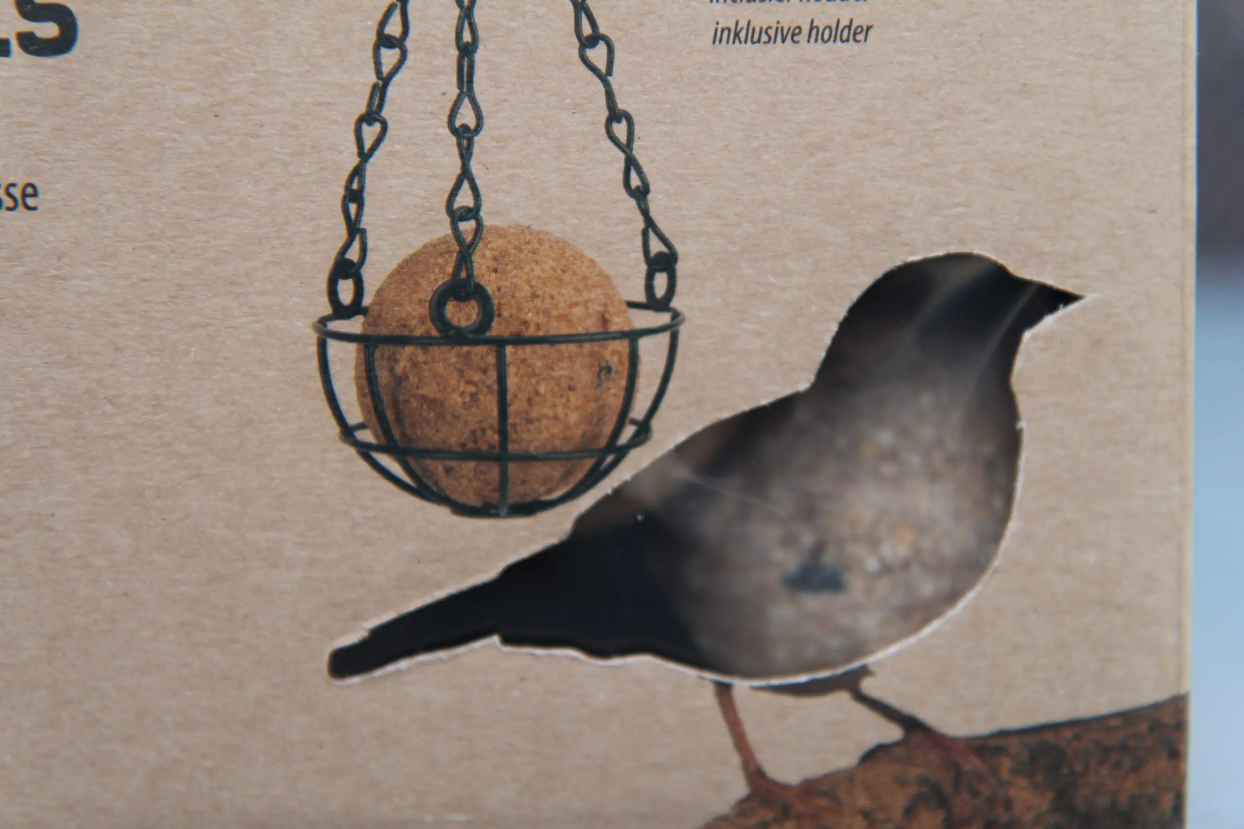 Een recyclebare kartonnendoos met hierin 35 vetbollen en een metalen houder.