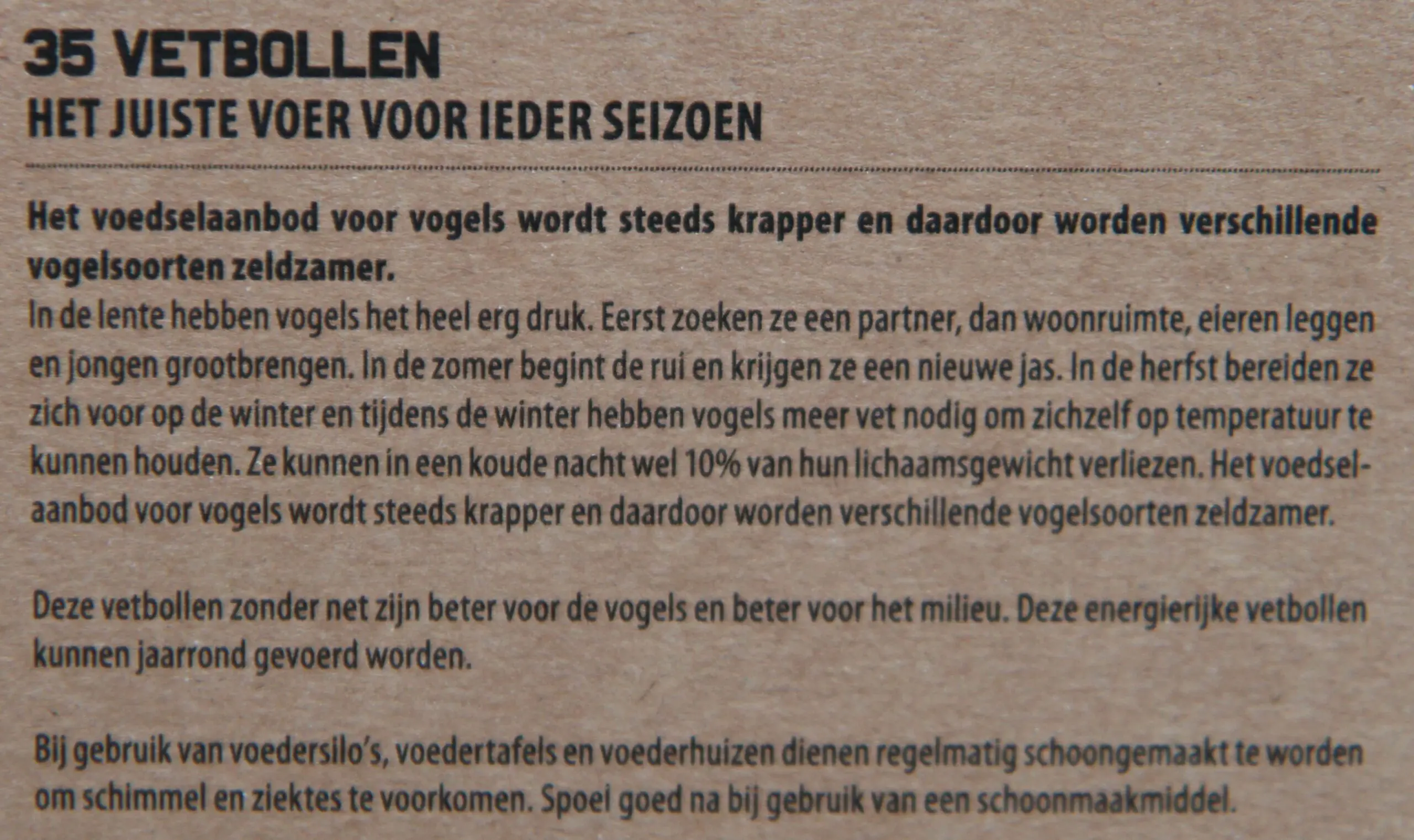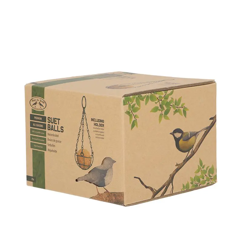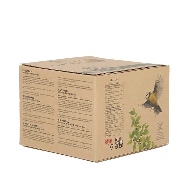Een recyclebare kartonnen doos met 35 vetbollen zonder netje.