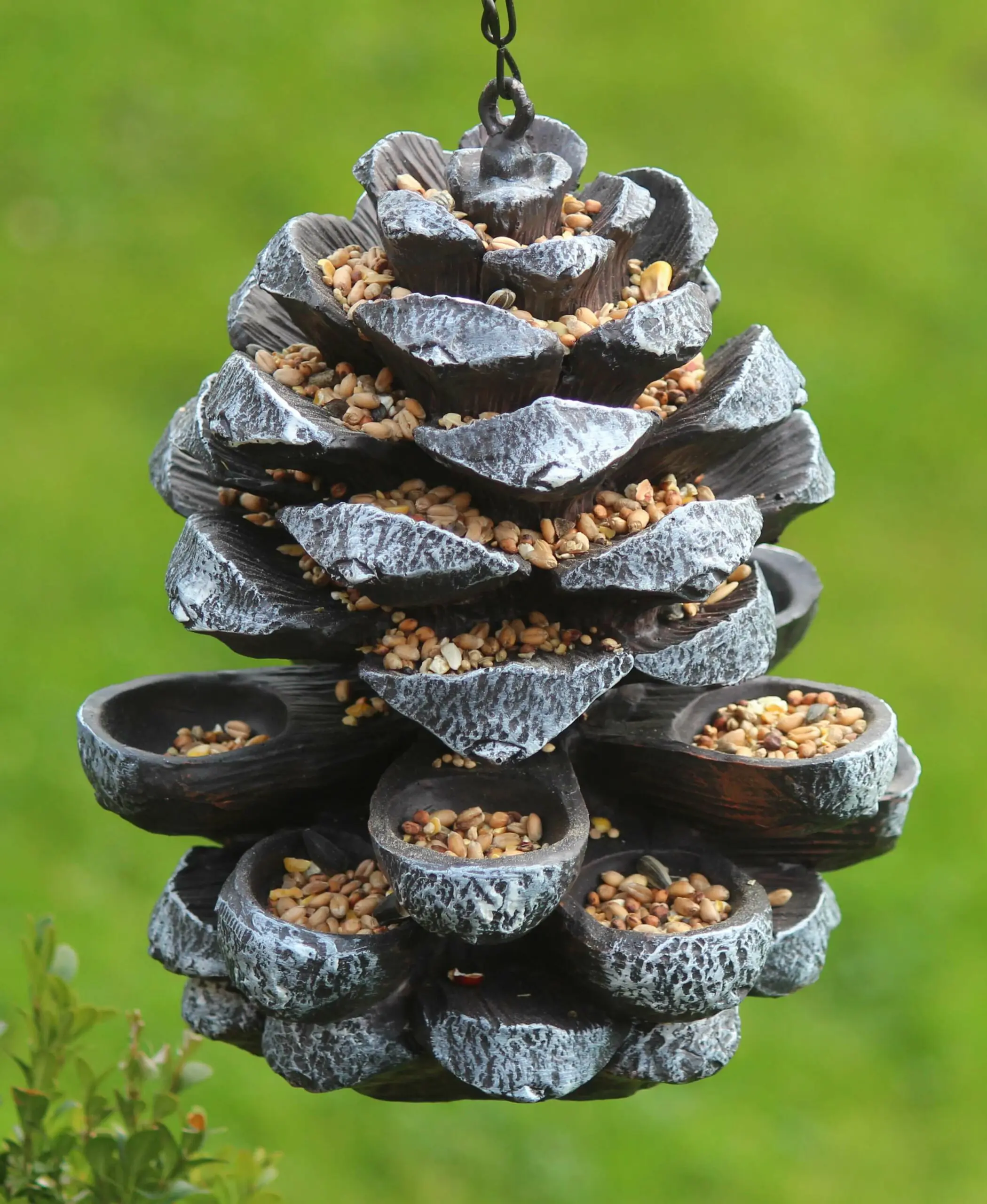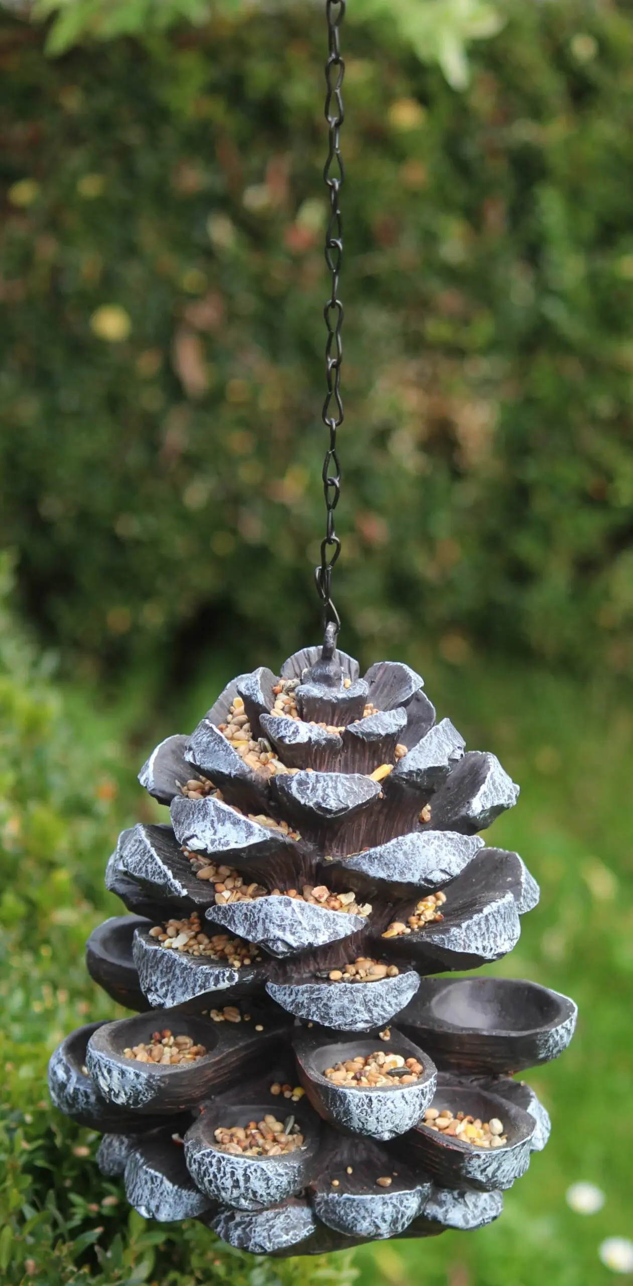 Doordat de bakjes, schaaltjes rondom de dennenappel zitten, geeft het een leuk effect wanneer de vogels het voer eruit pikken.