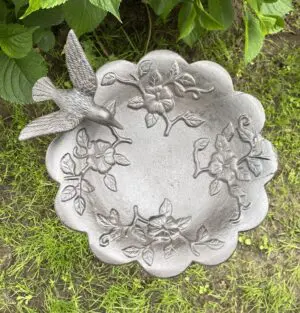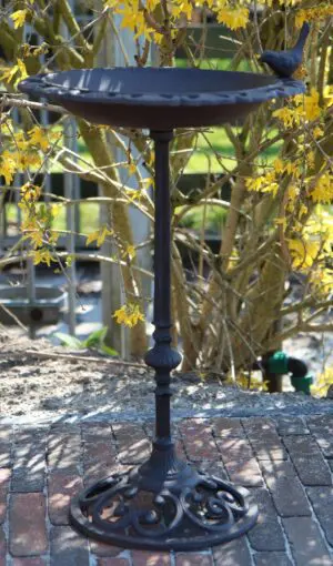 Een gietijzeren vogelschaal met twee vogels op de rand van de schaal.