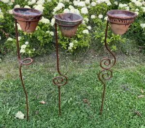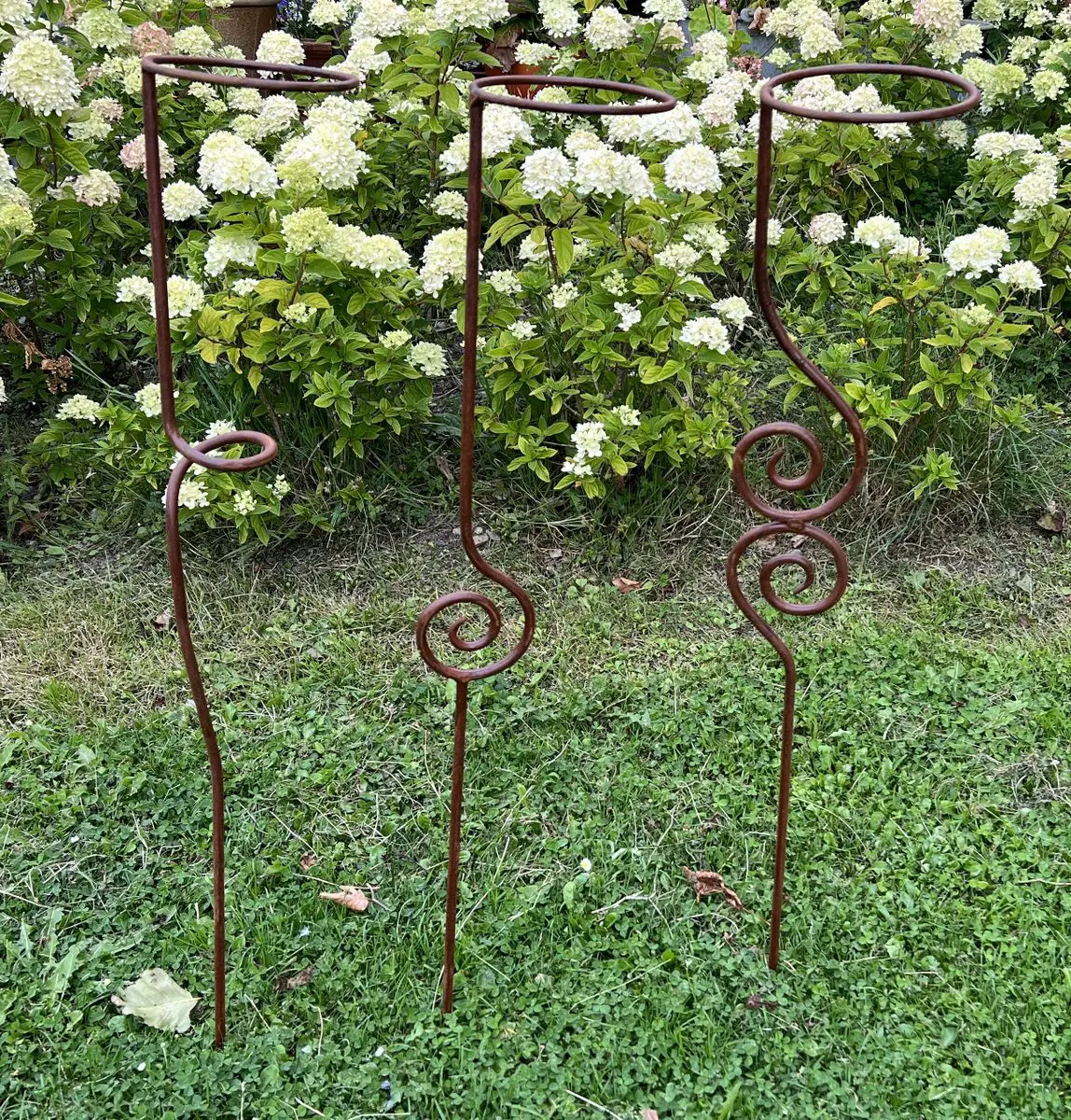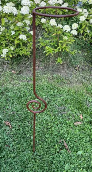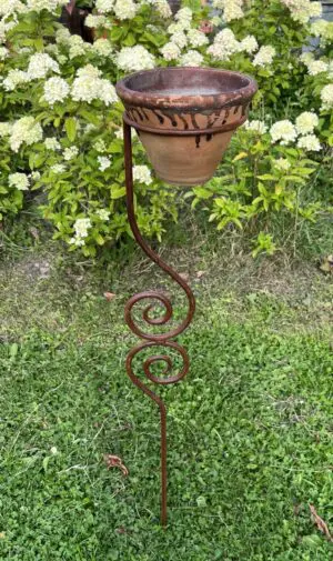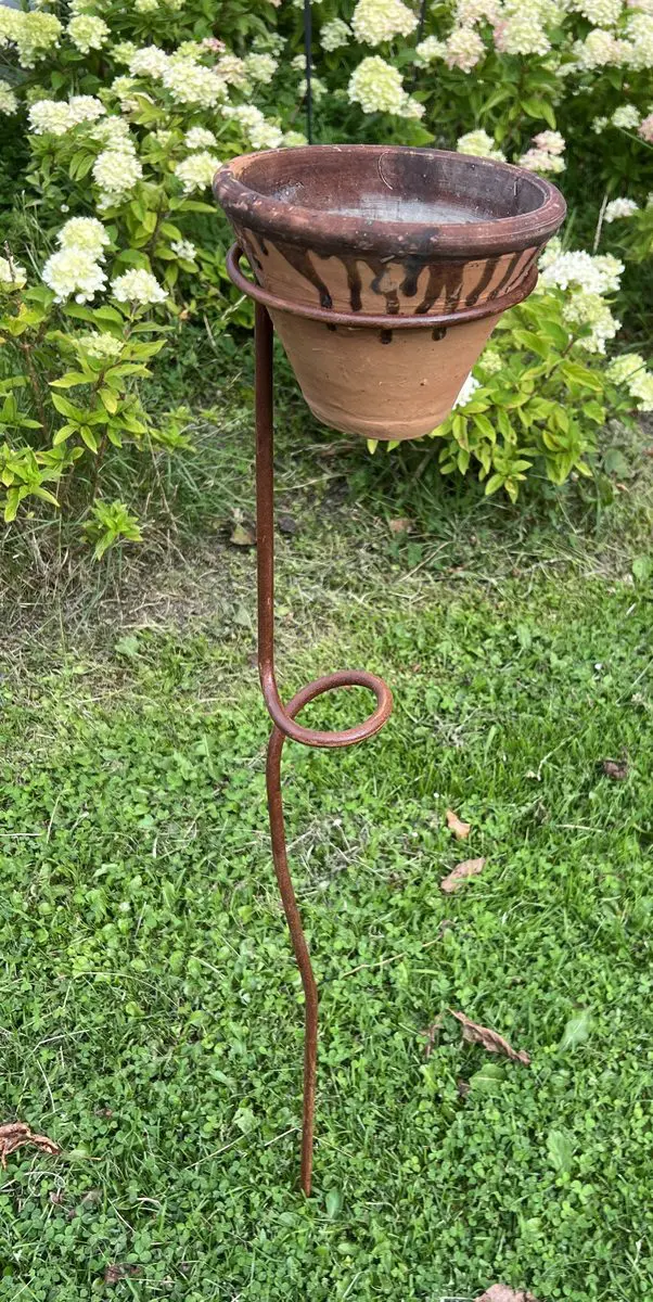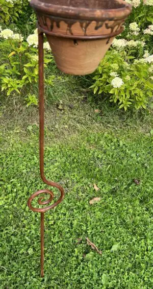 Een sierlijke bloempothouder op een stang/steker.