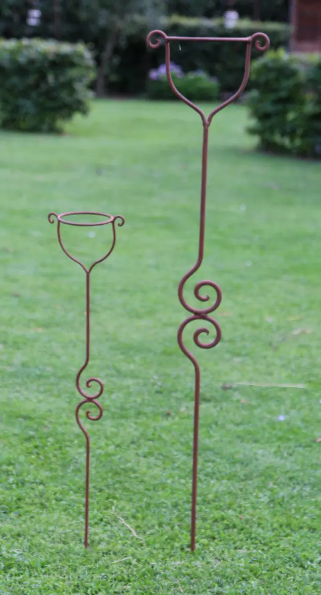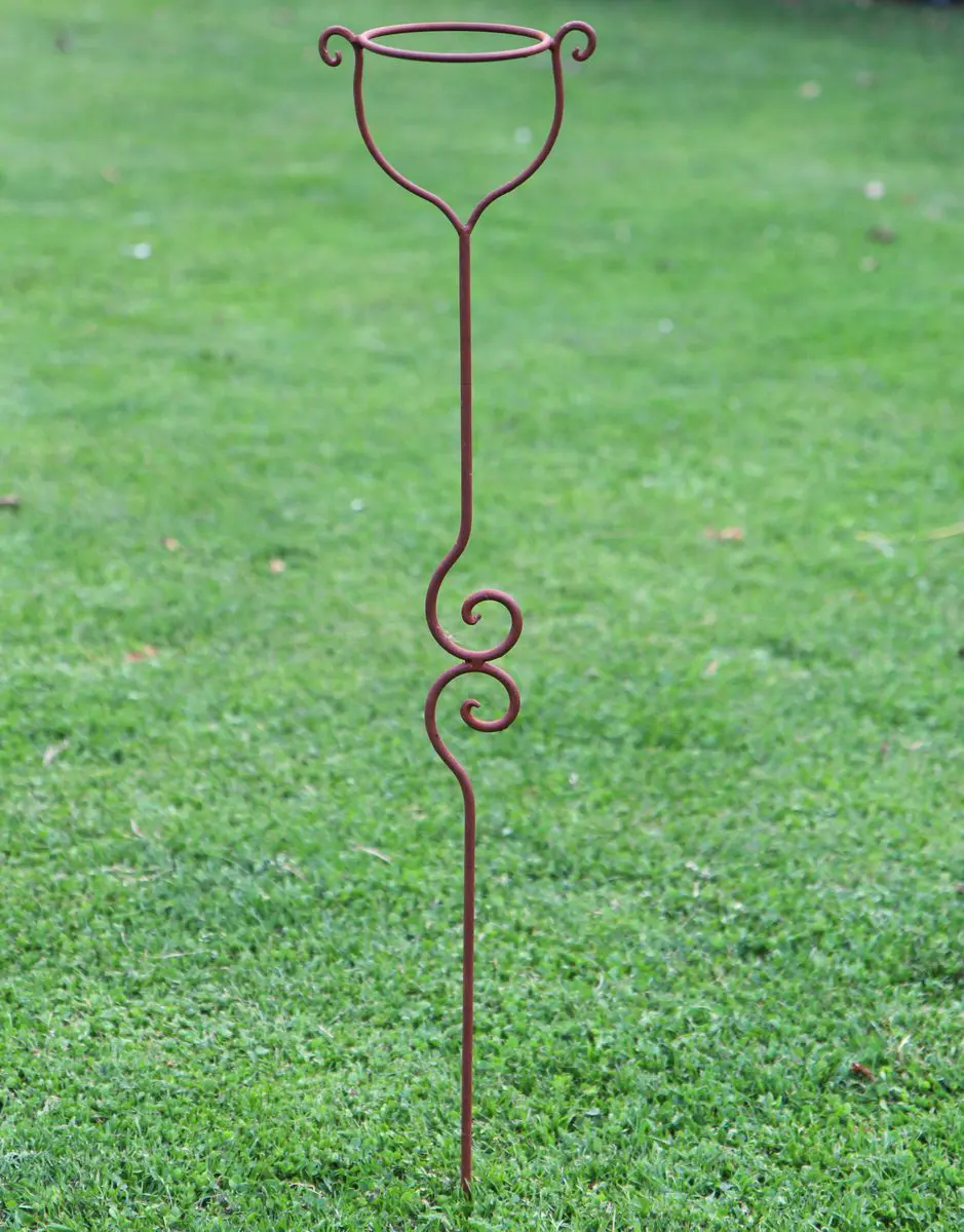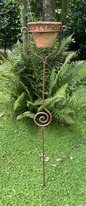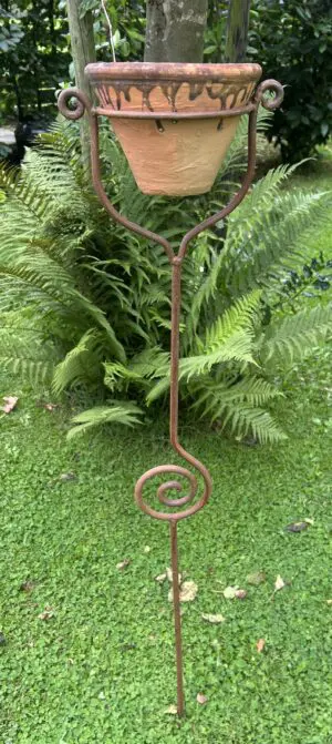 Een sierlijke bloempothouder op een stang/steker.