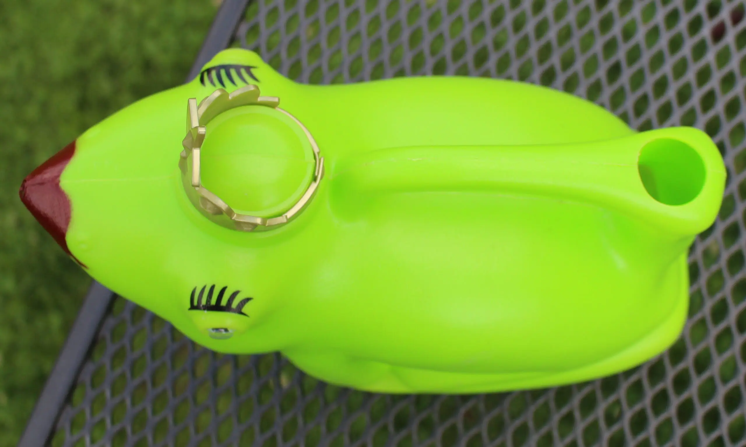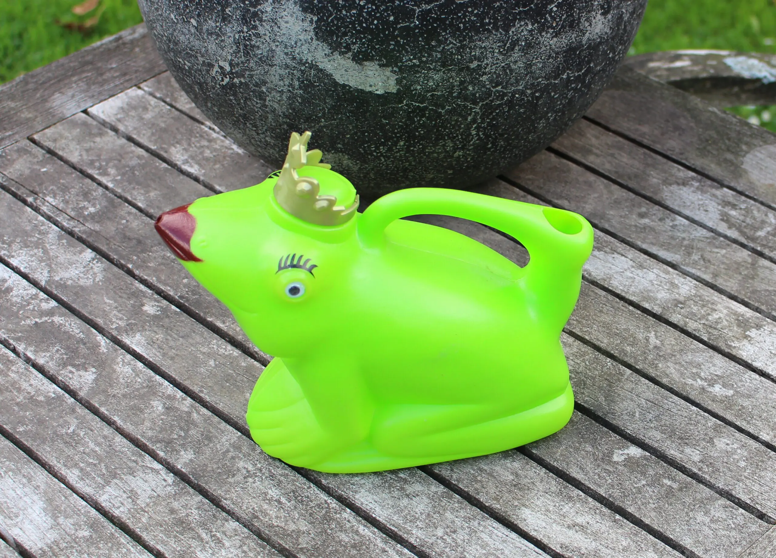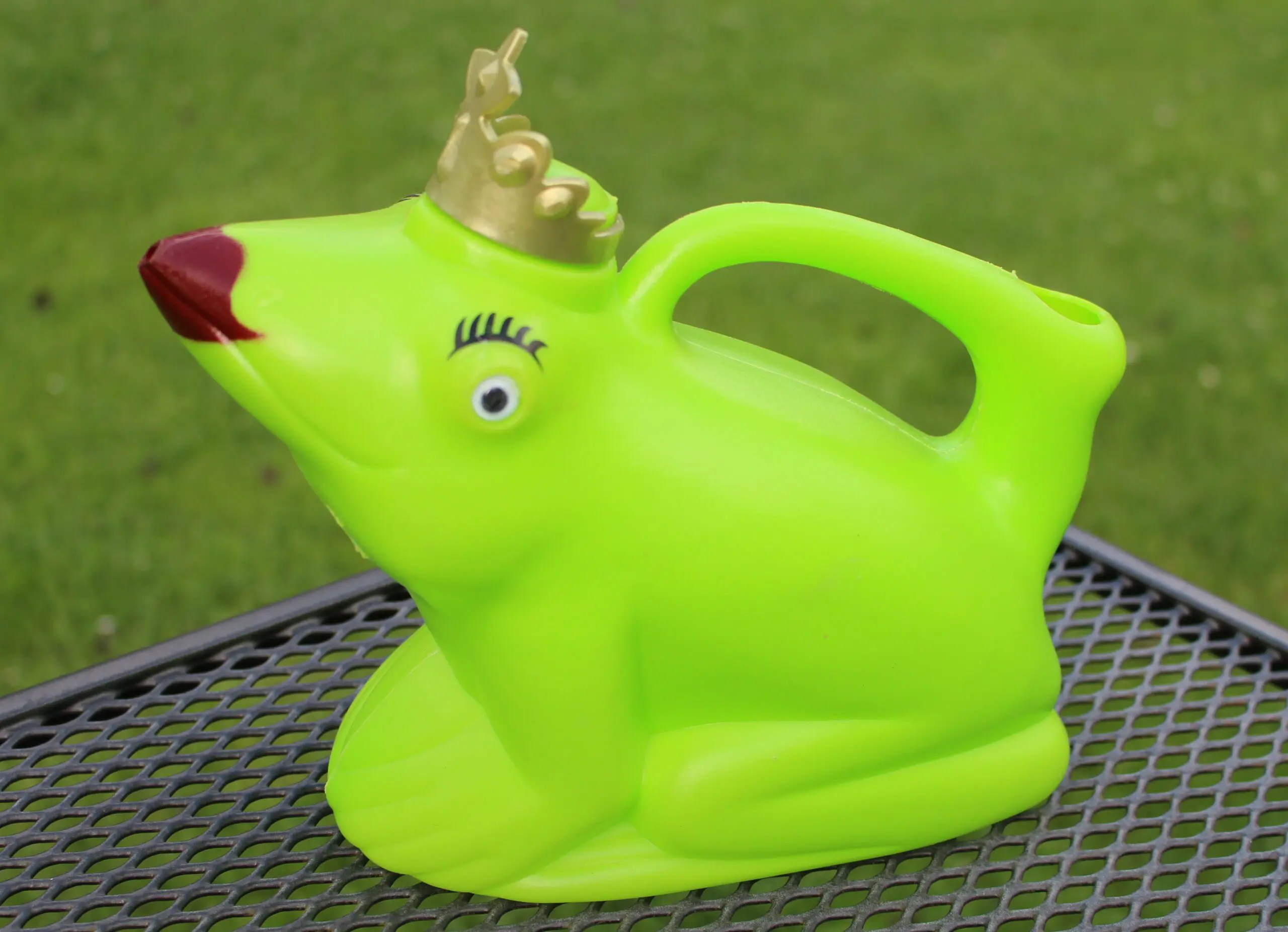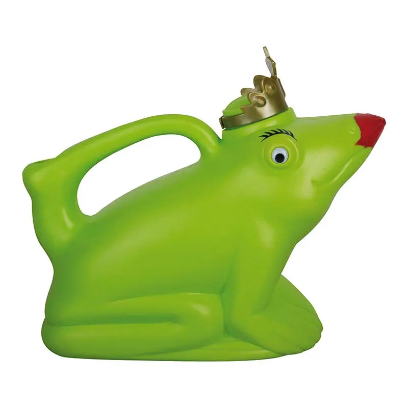 Lichtgroene kunststof gieter met een goudkleurige kroon en donkerrode lippen.