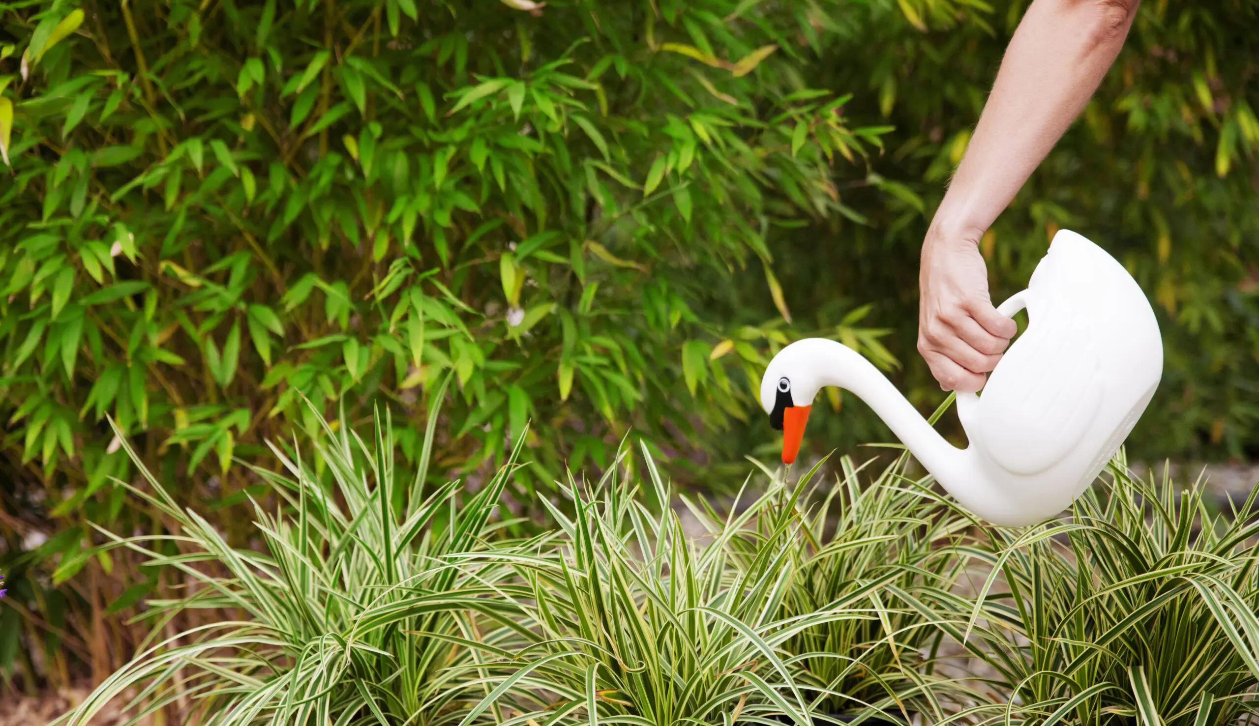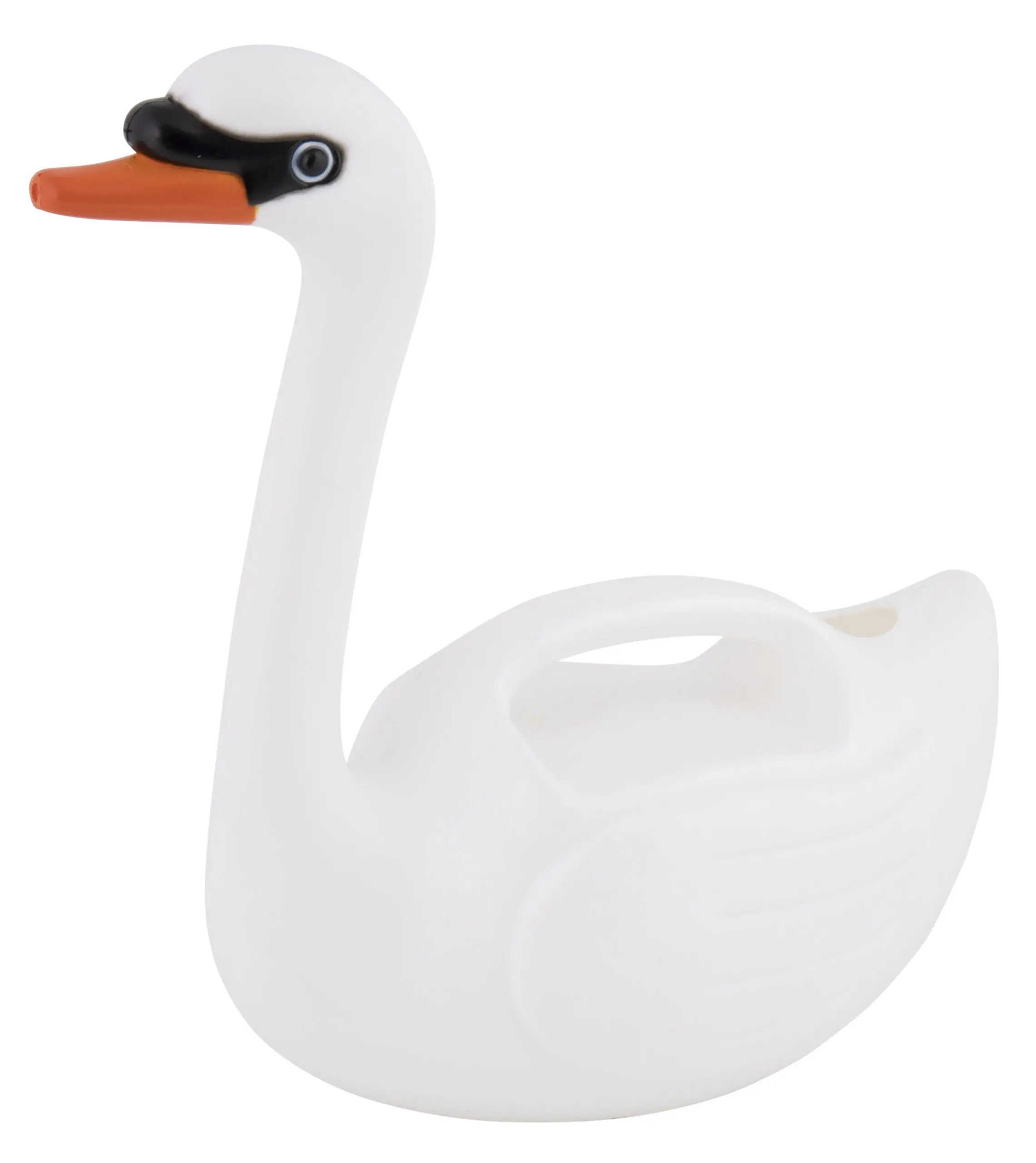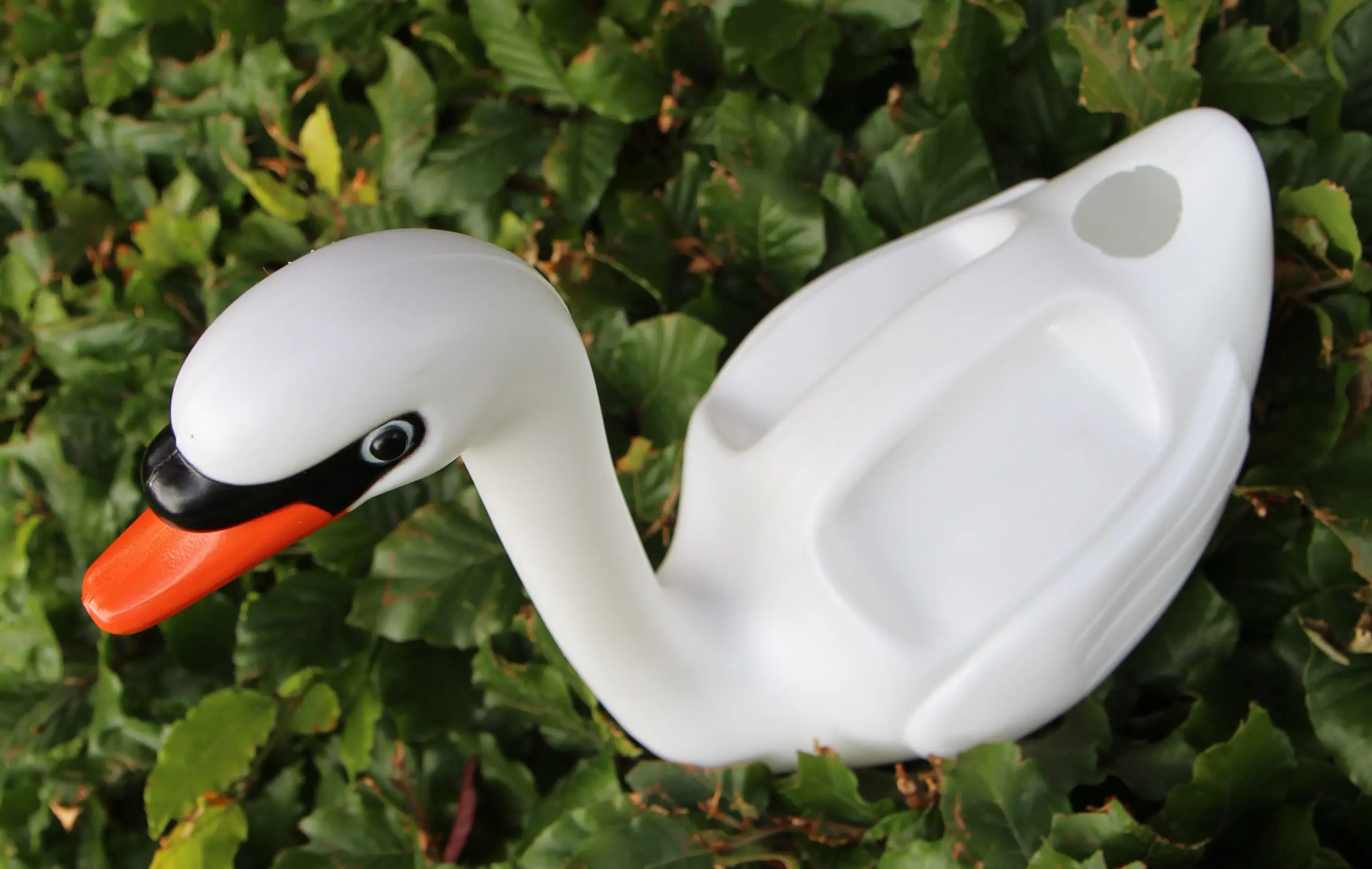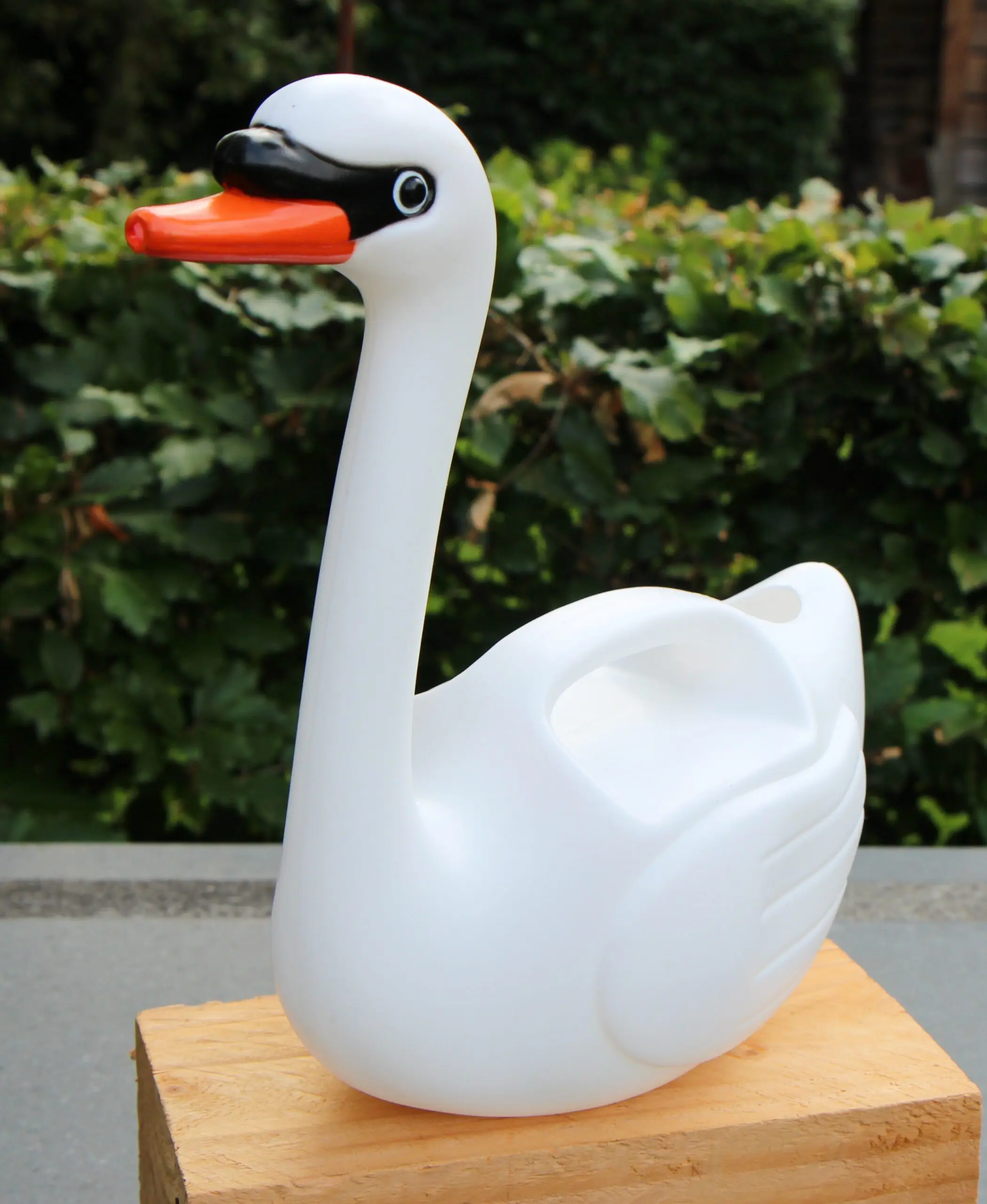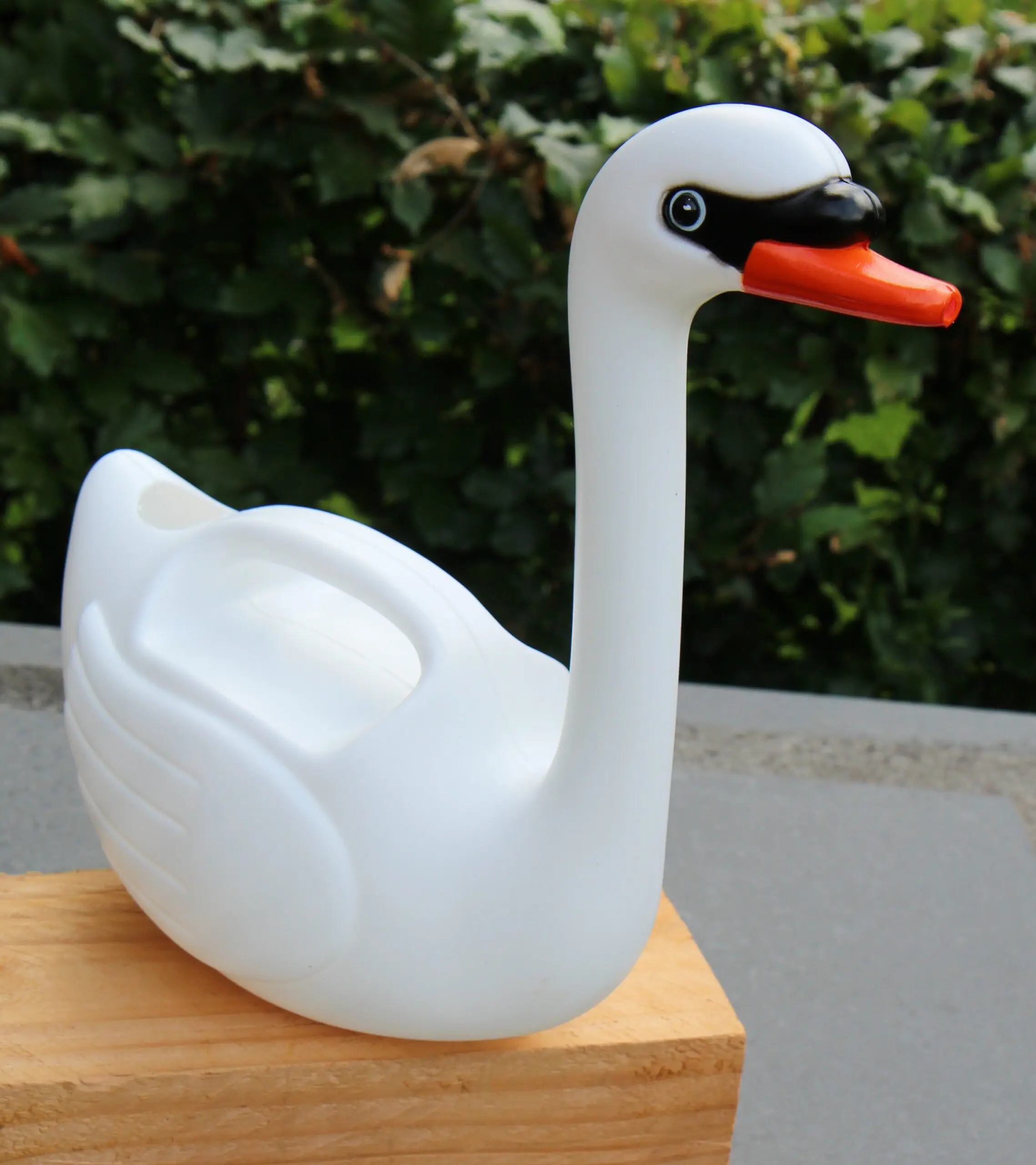 Een witte kunststof gieter zwaan met een oranje snavel.