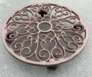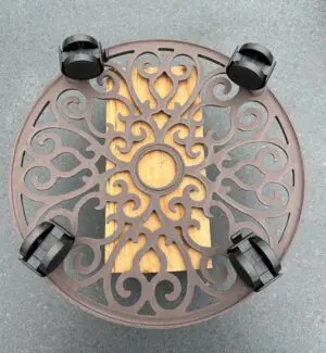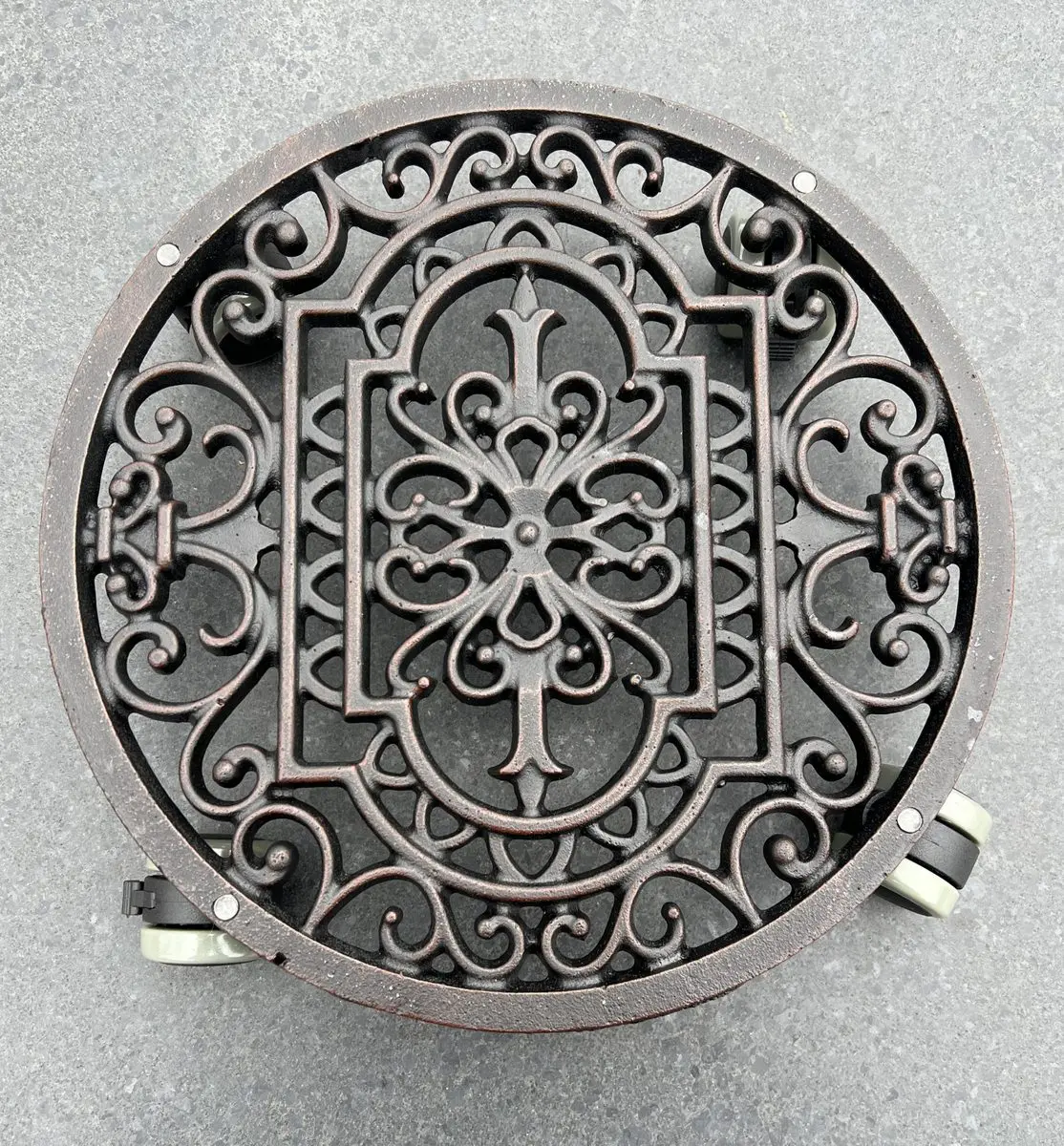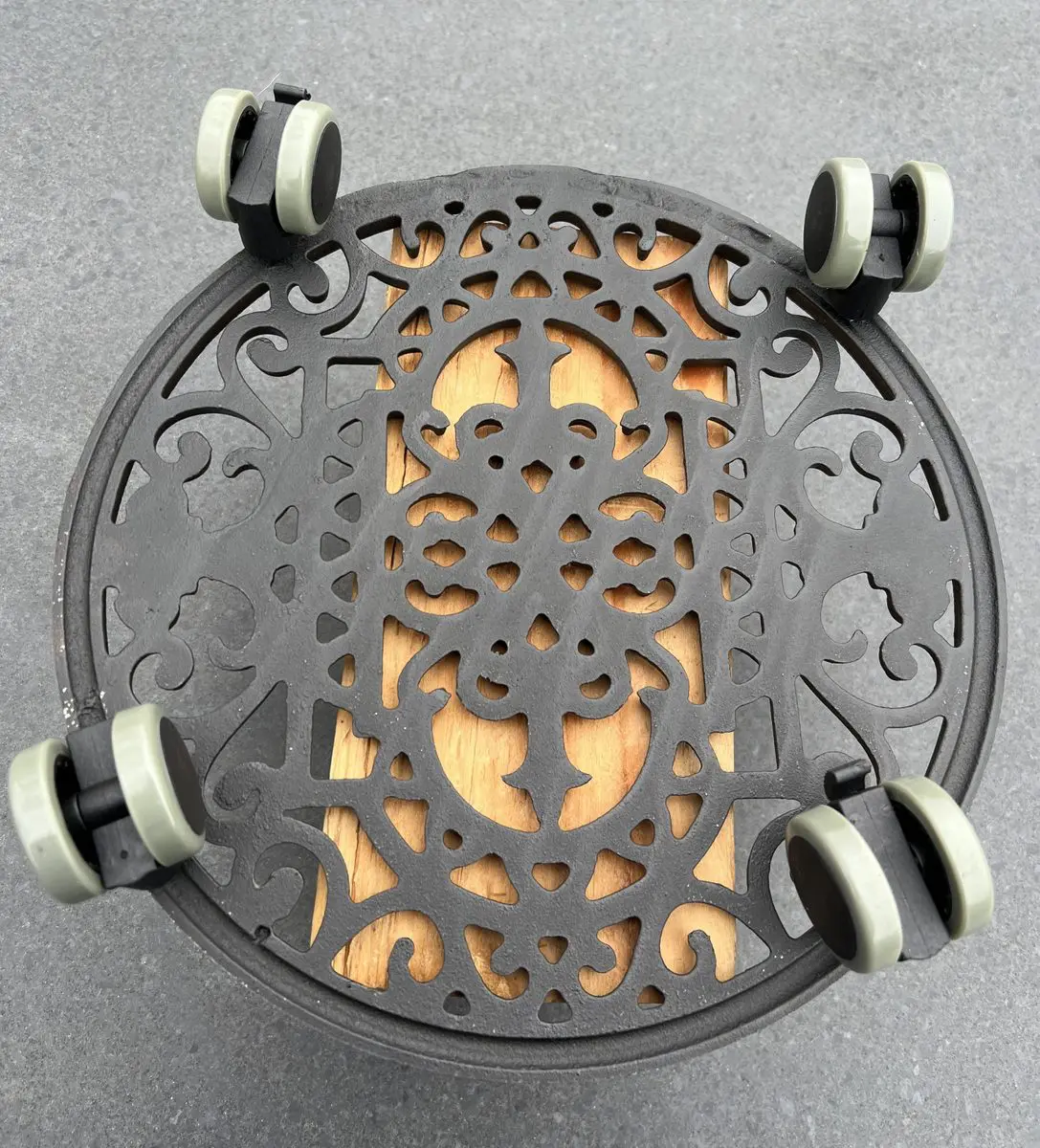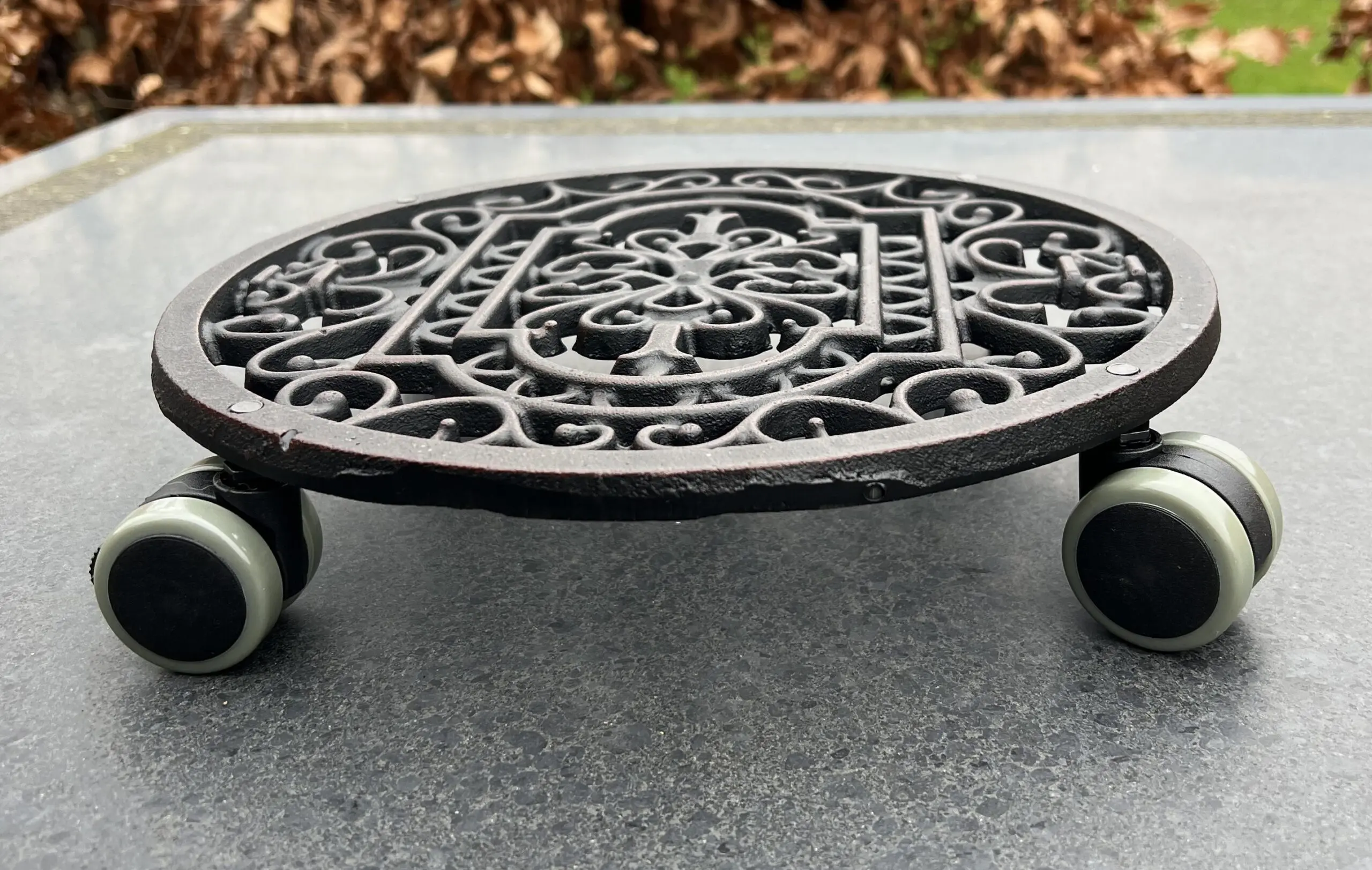 Een ronde Victoriaanse gietijzeren planttrolley met 4 wieltjes.