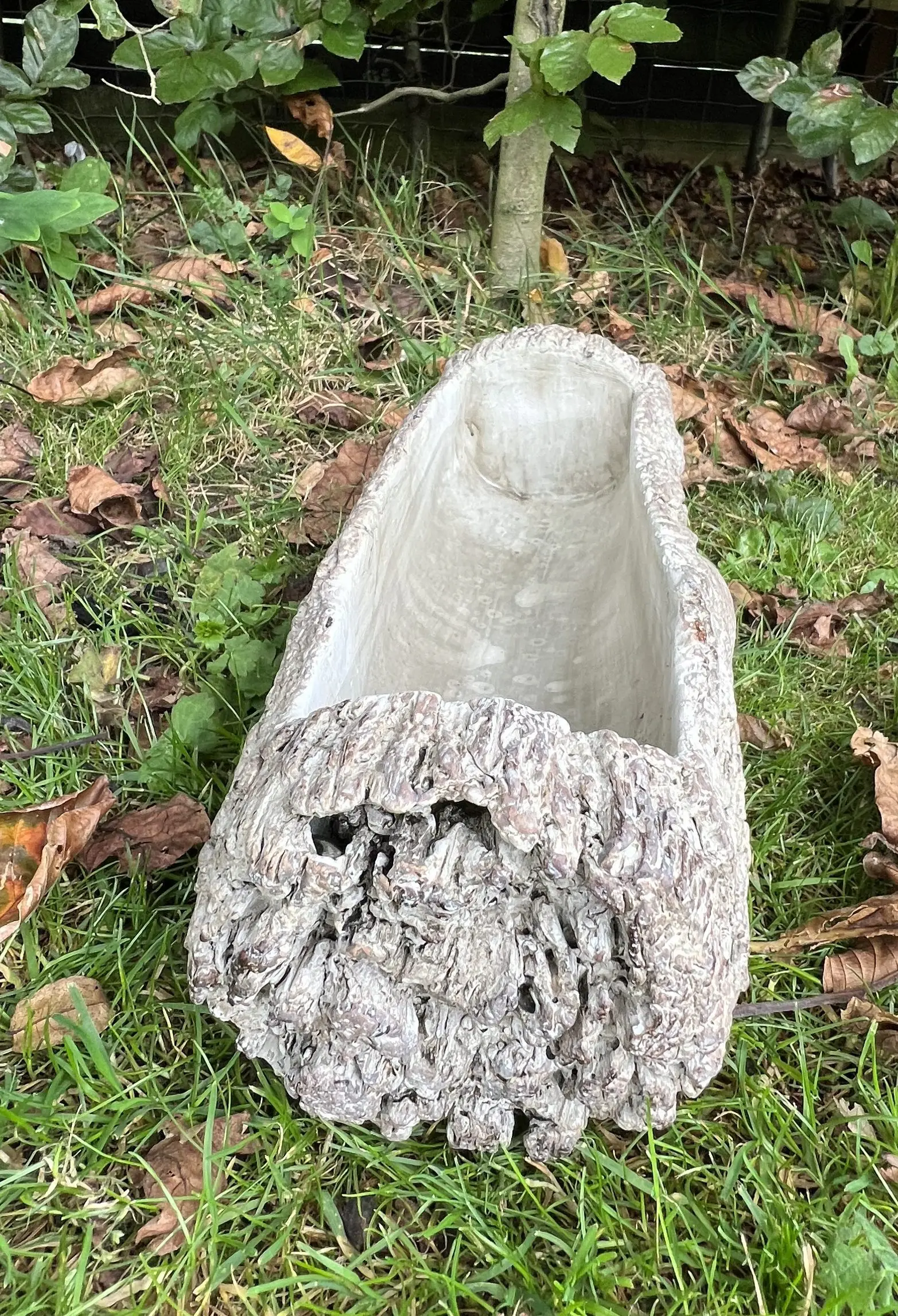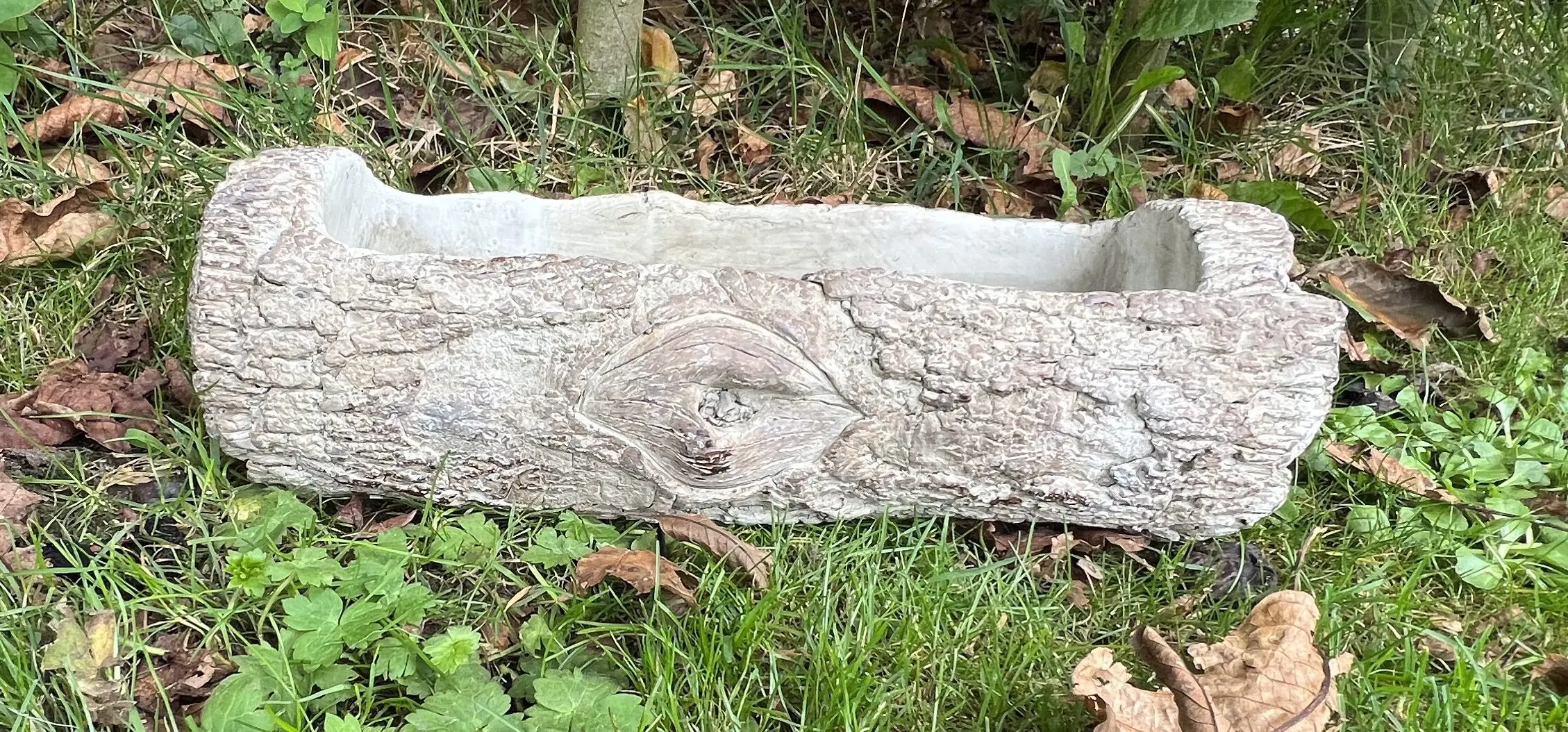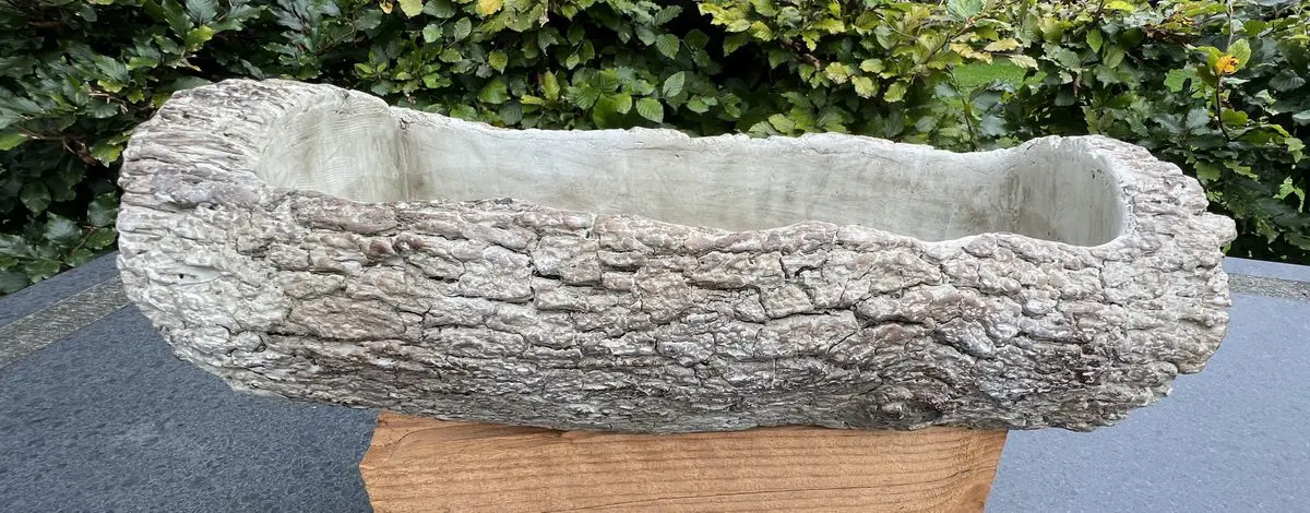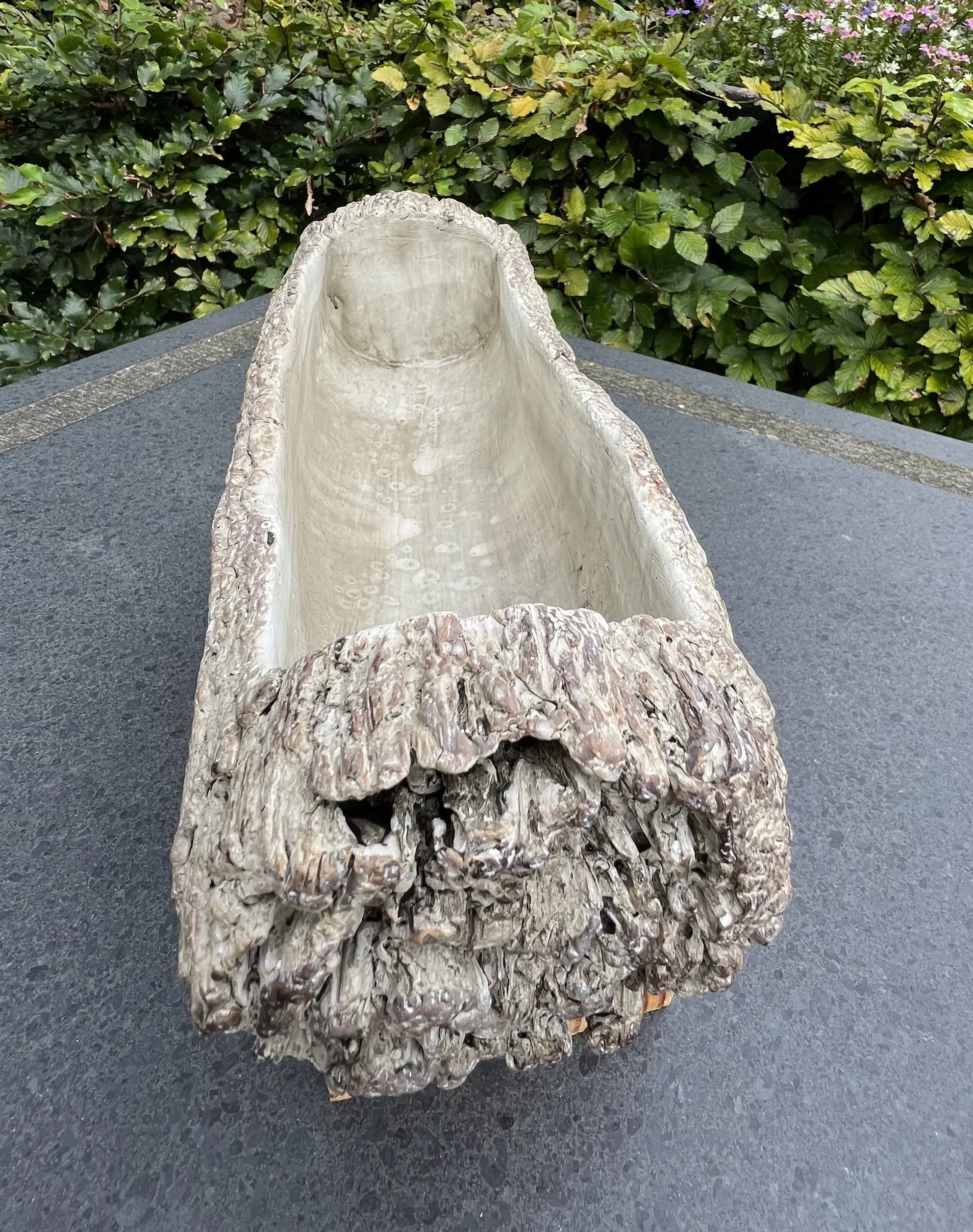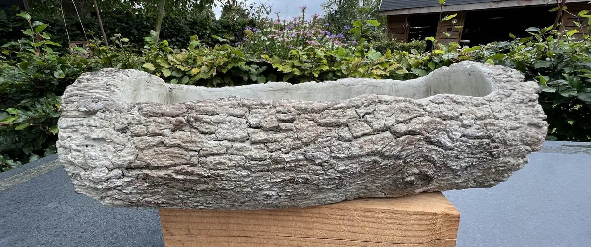 Bloembak, plantenbak uitgeholde boomstam, steen, grijs-wit BPS172