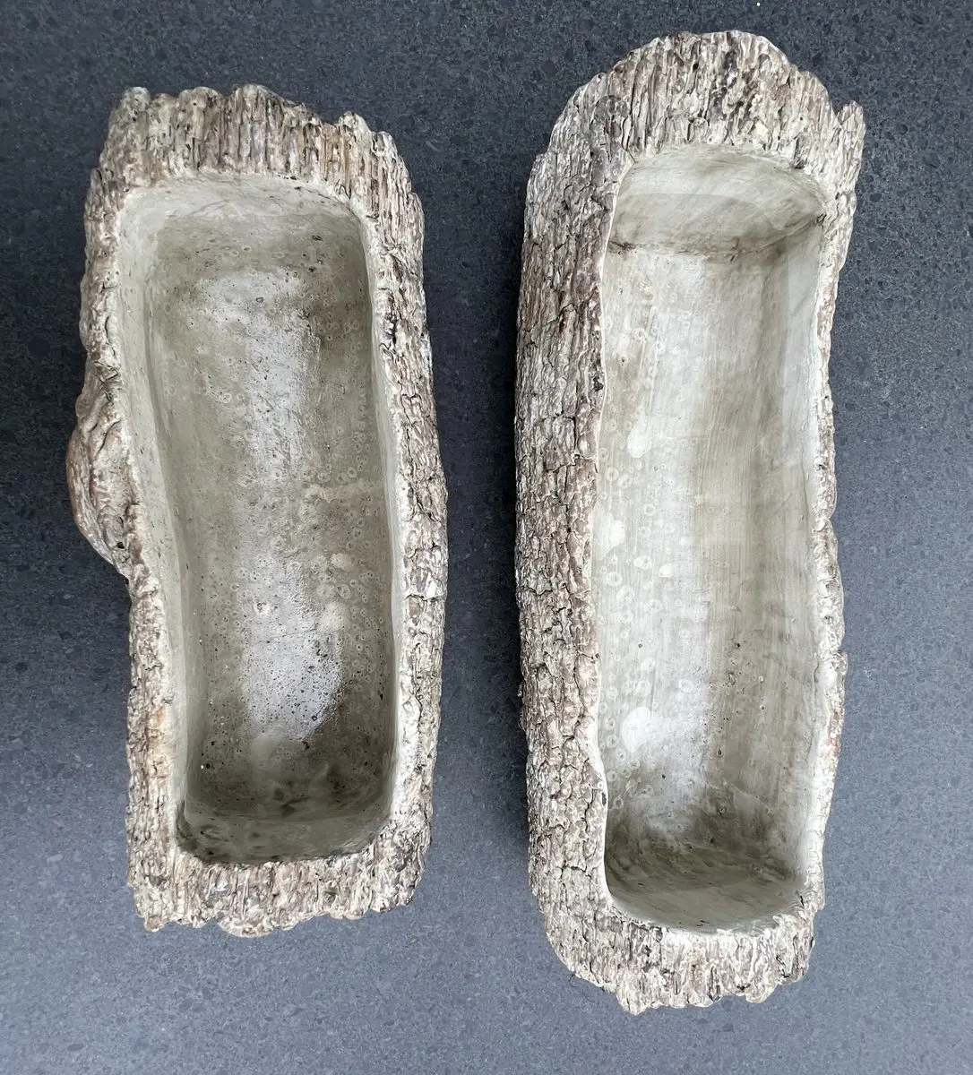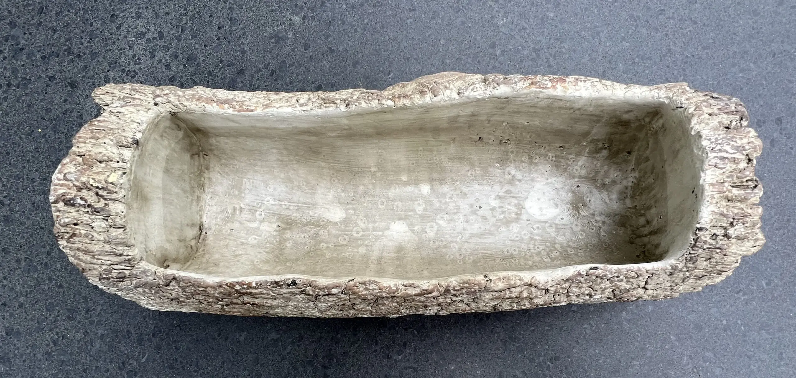 Een ovale schaal van steen in de vorm van een uitgeholde boomstam.