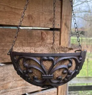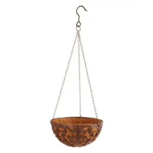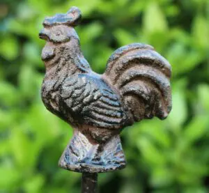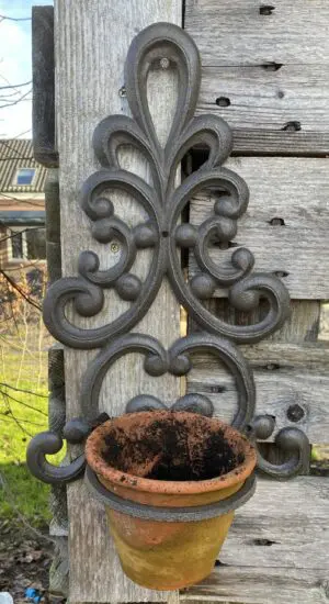 Deze roestig metalen plantensteun is bedoeld om planten mee op te binden.