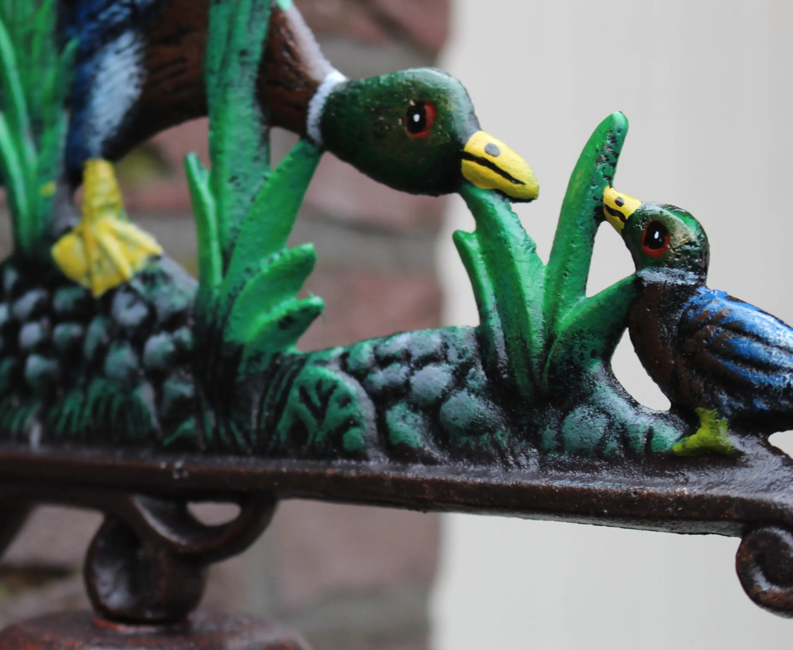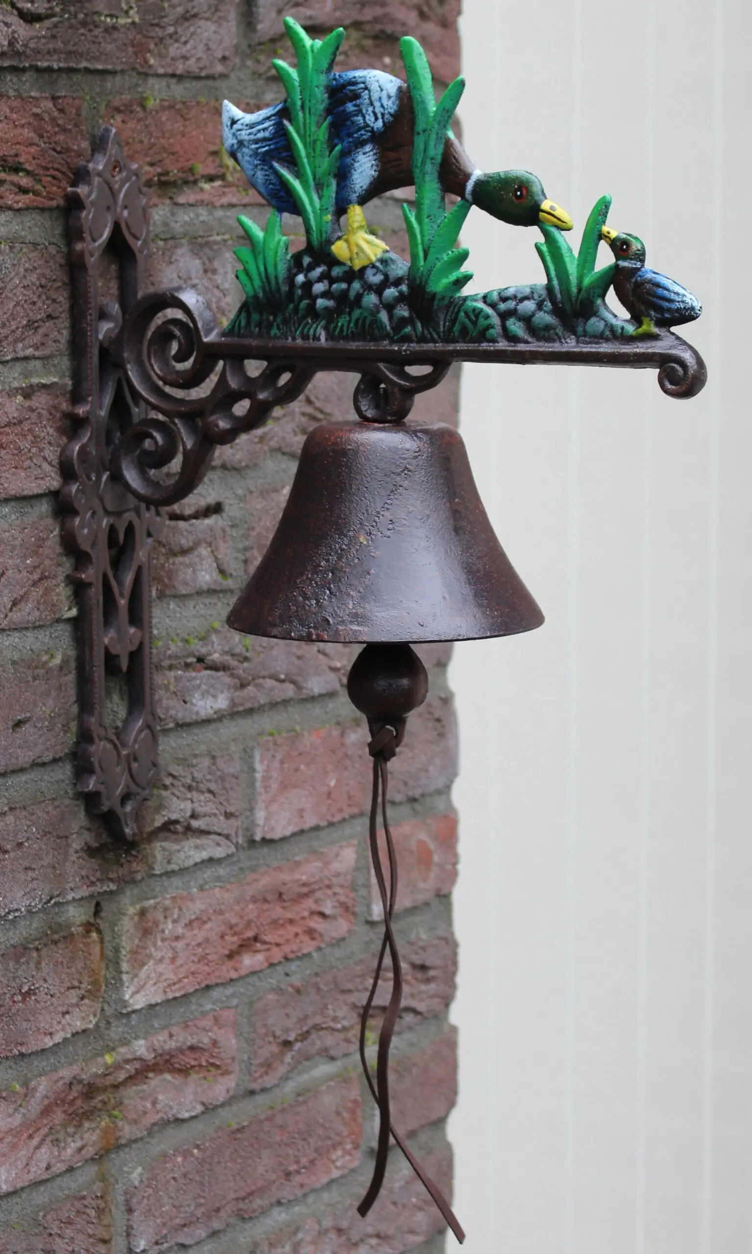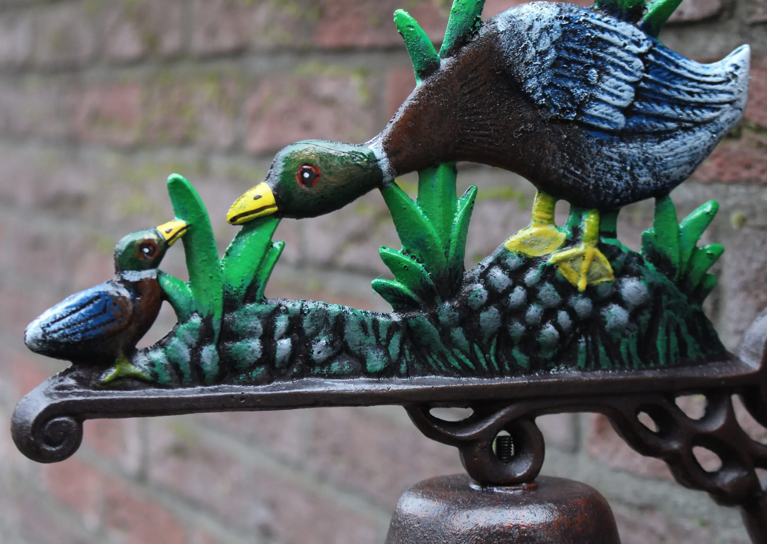 Een gietijzeren deurbel met afbeelding van een eend met een kleinere eend.