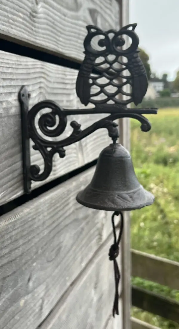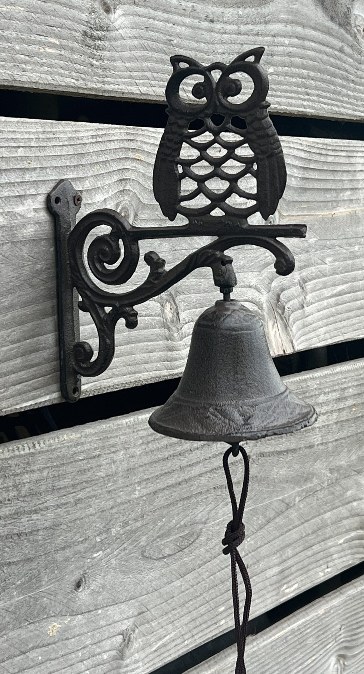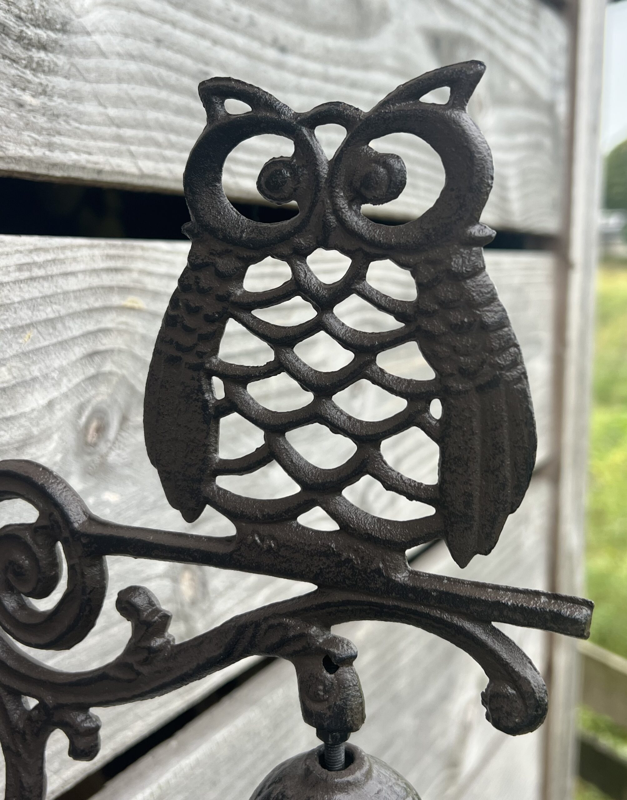 Een decoratieve gietijzeren deurbel met afbeelding van een uil.