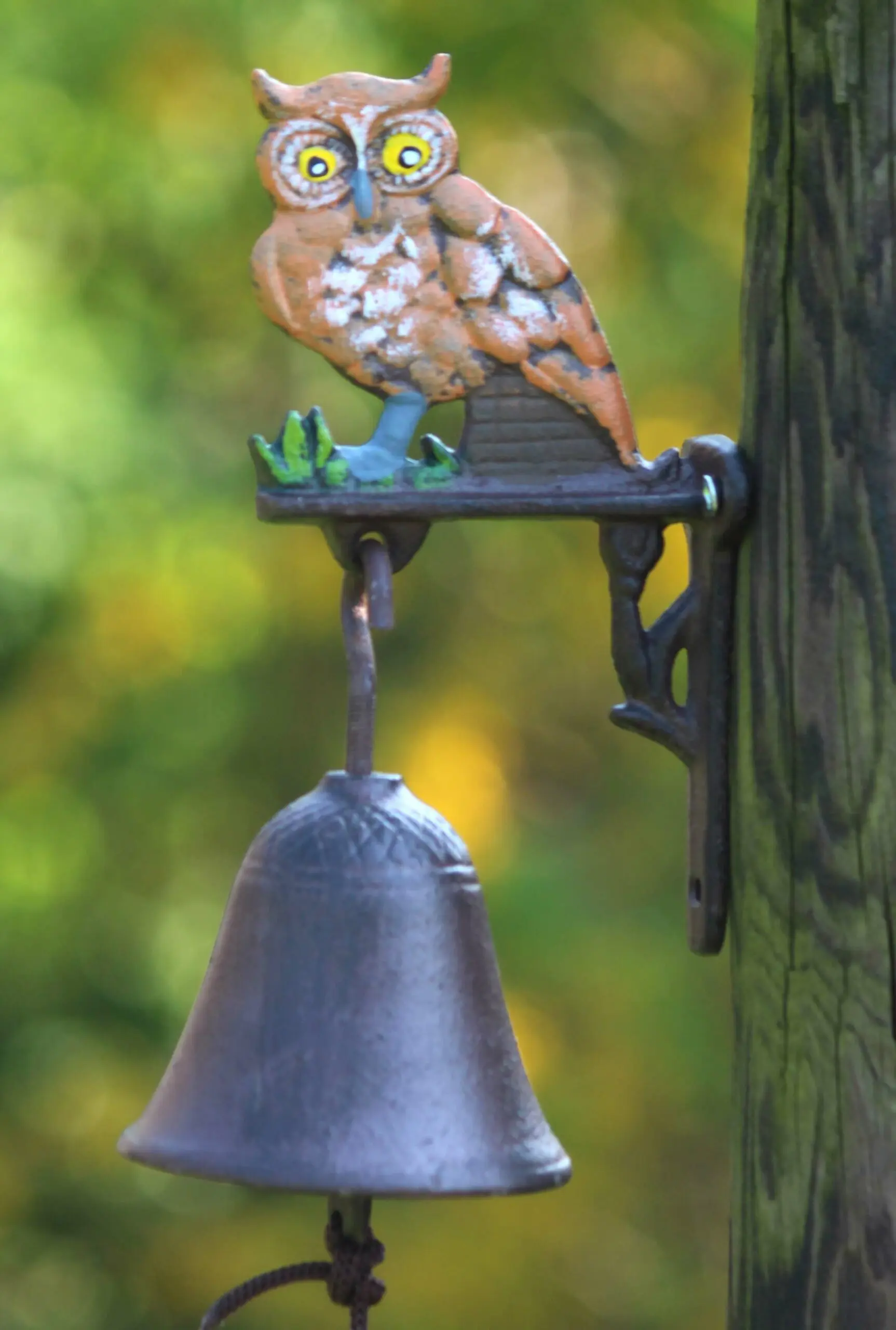 Een decoratieve gietijzeren deurbel met afbeelding van een uil.