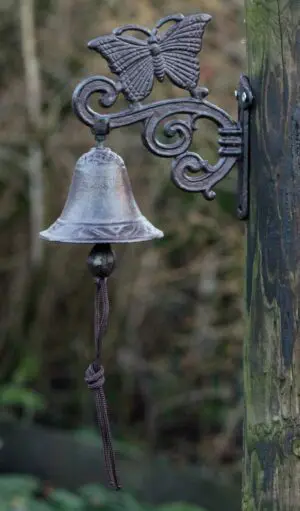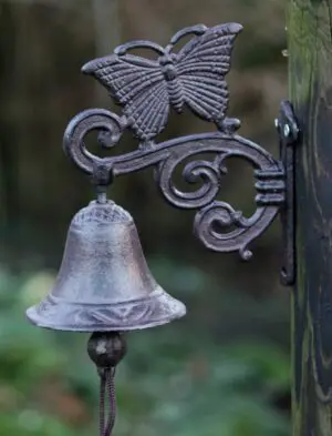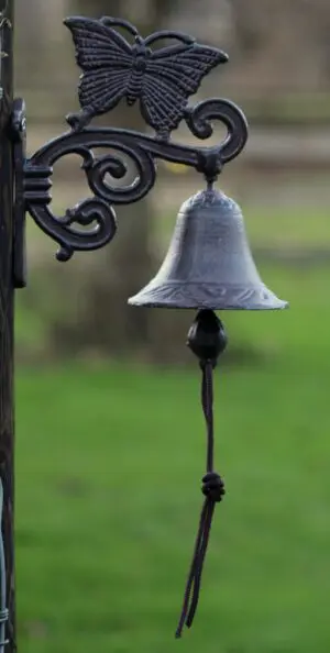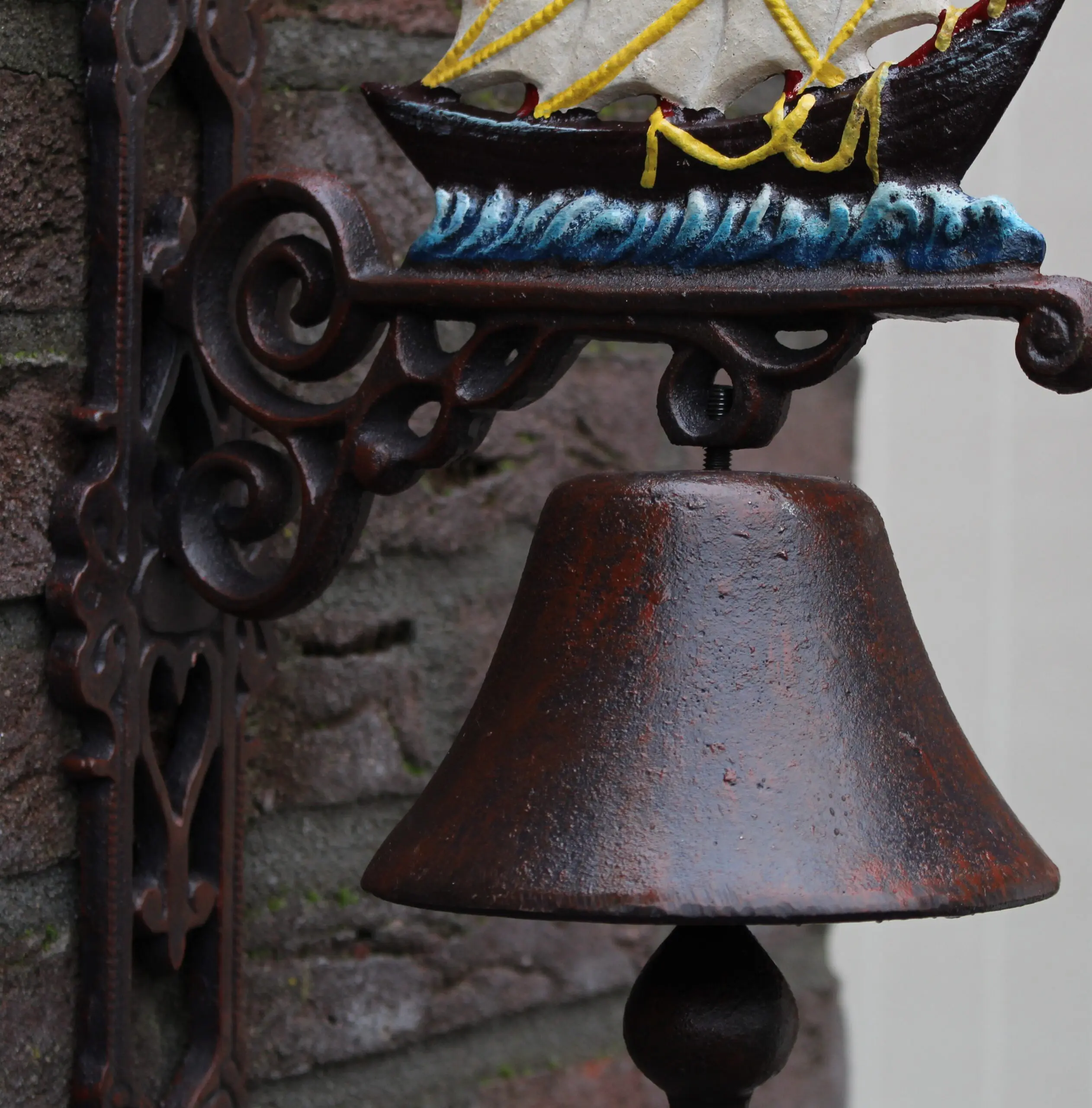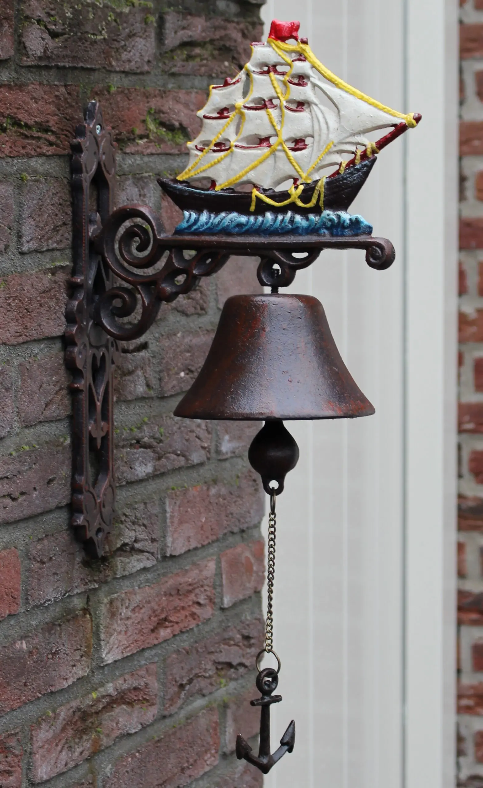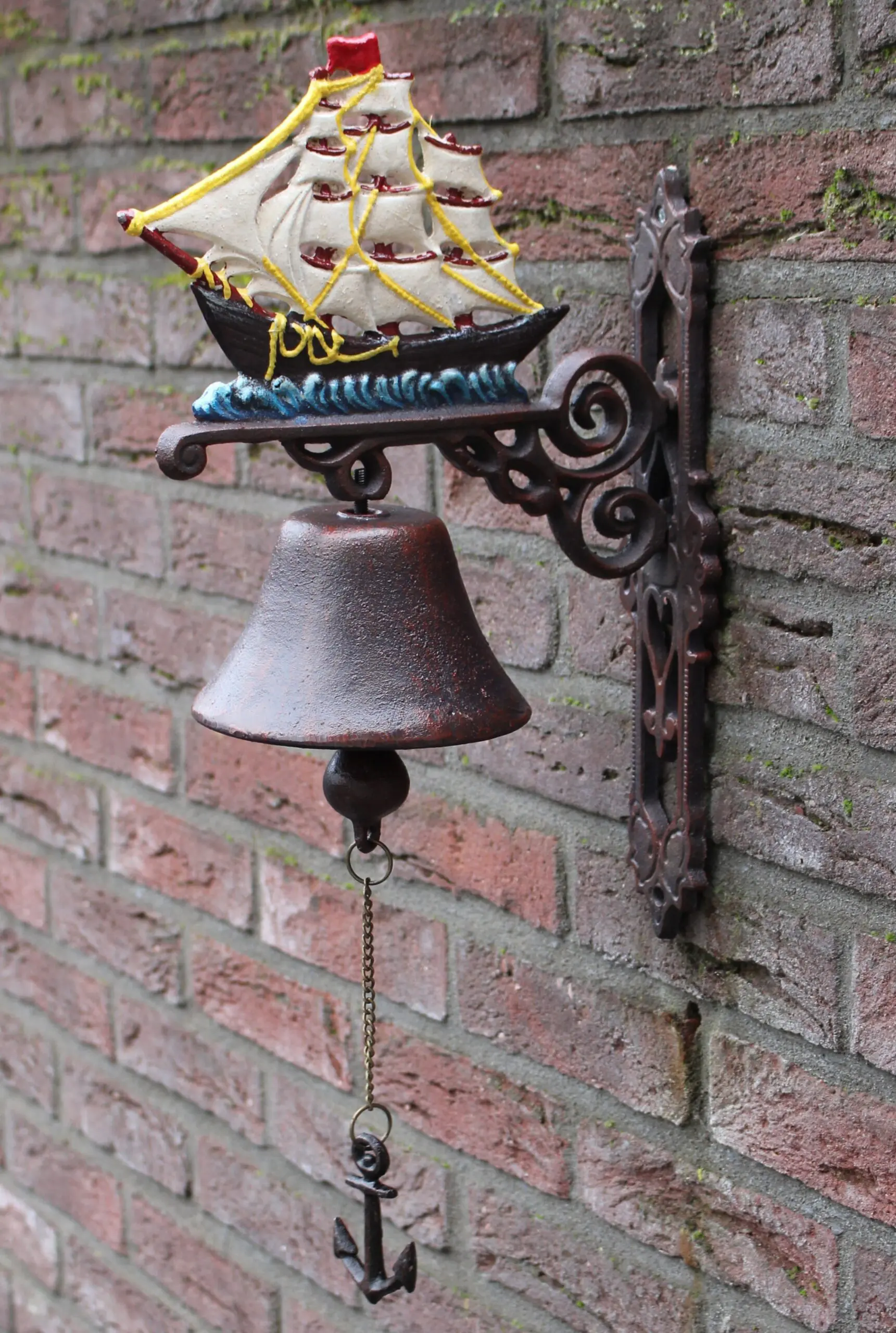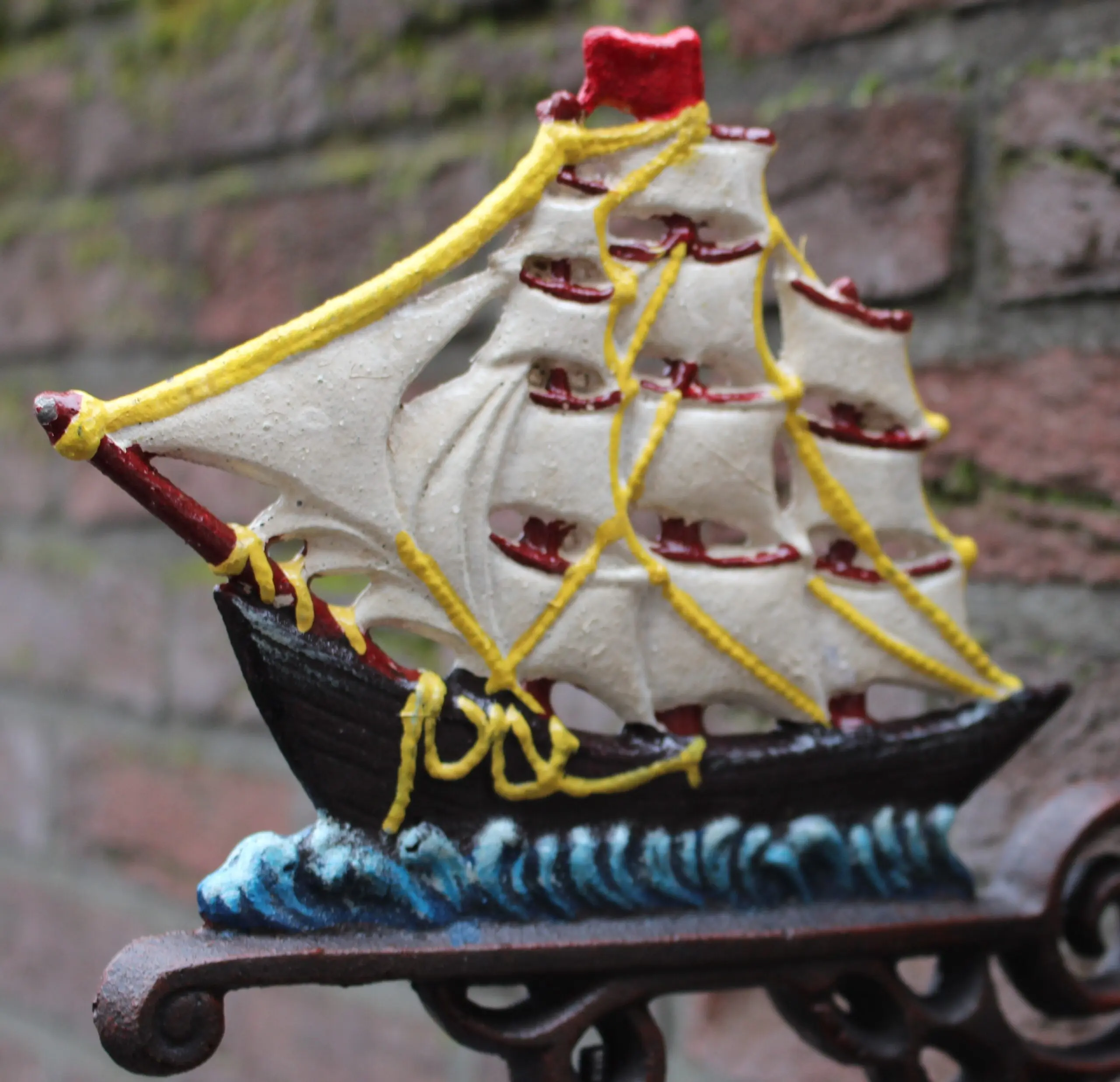 Een gietijzeren deurbel met afbeelding van een zeilschip.
