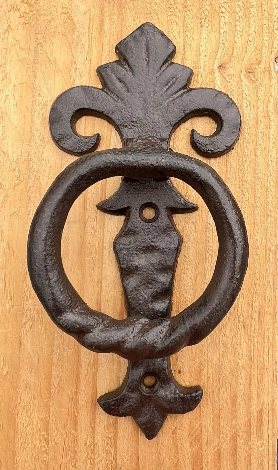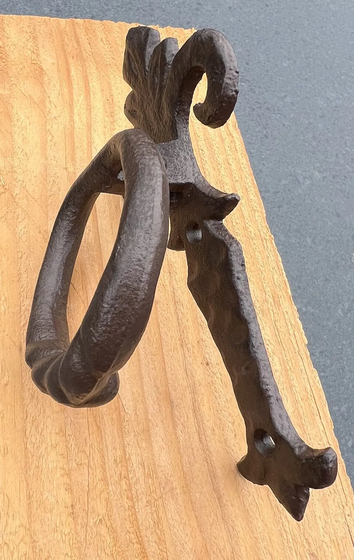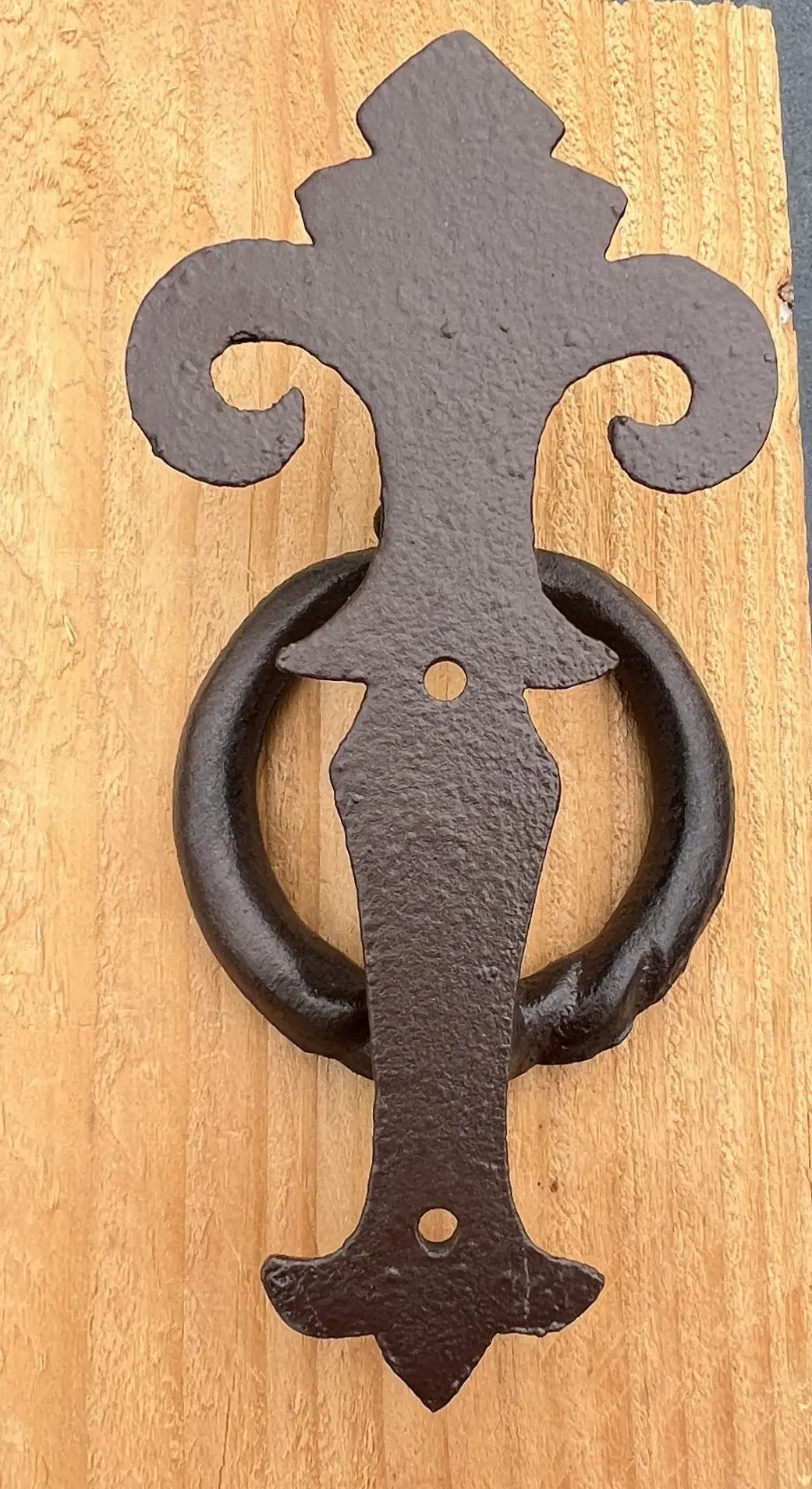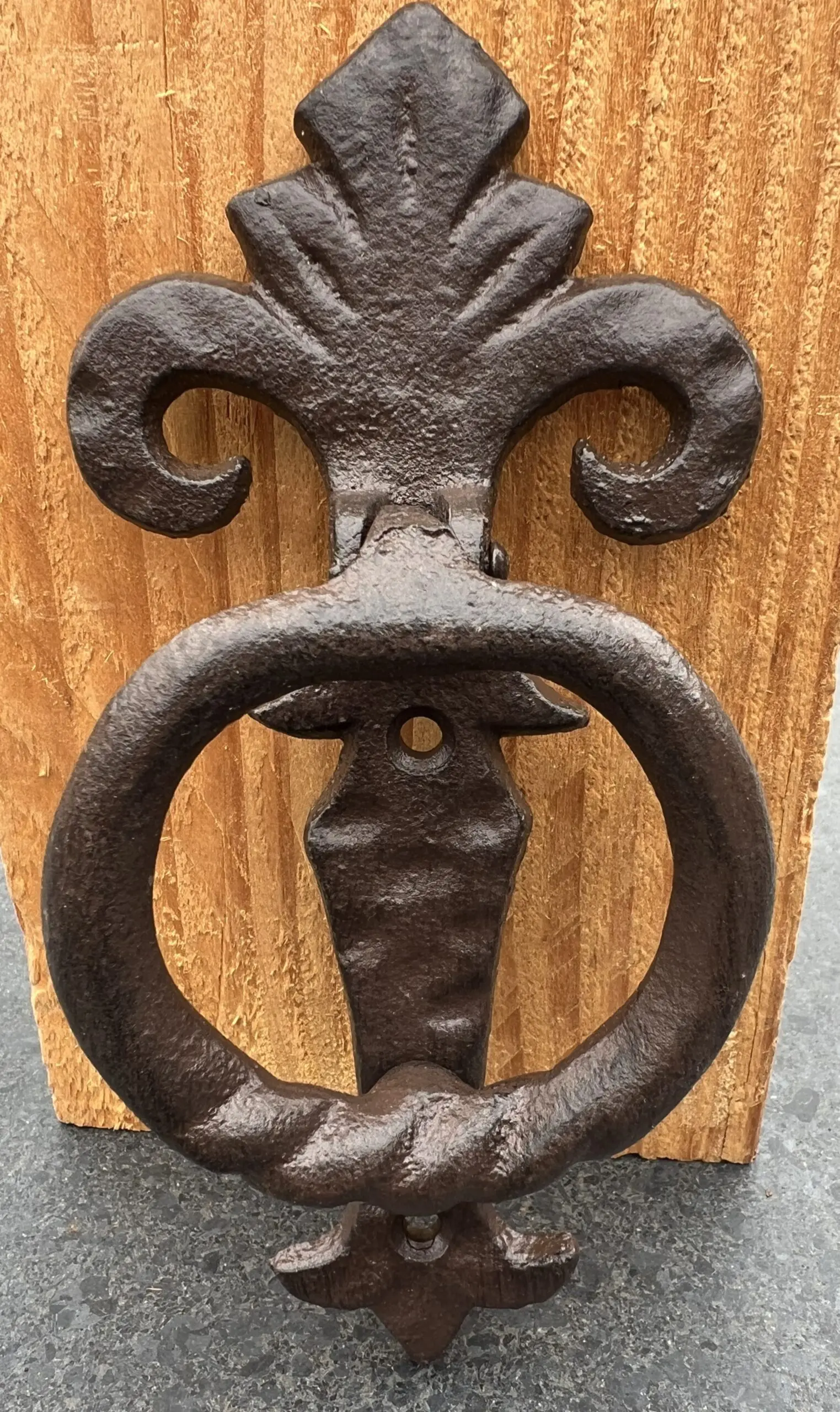 Een donkerbruine gietijzeren deurklopper, model franse lelie