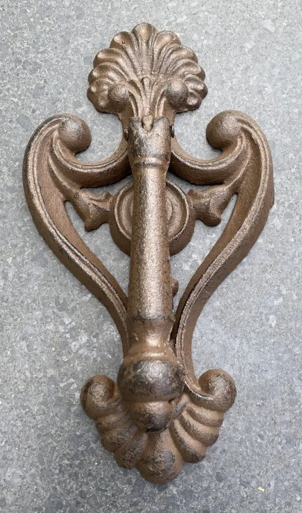 Een zware donkerbruine gietijzeren deurklopper.