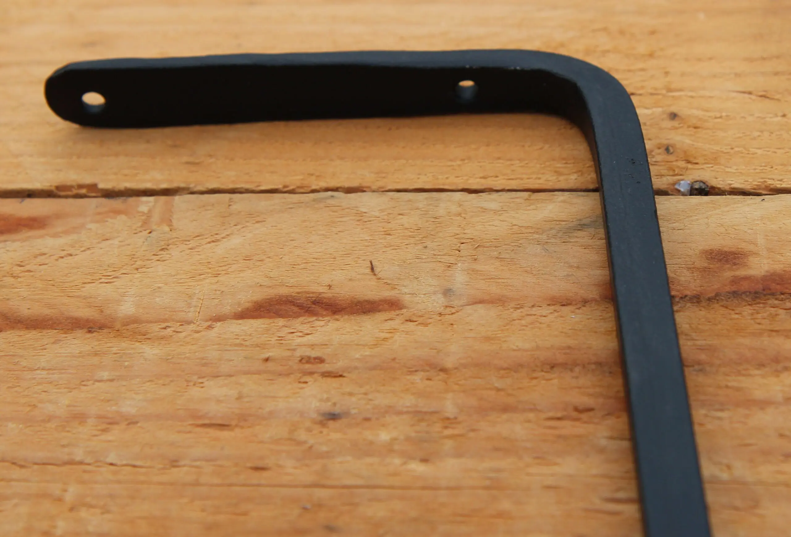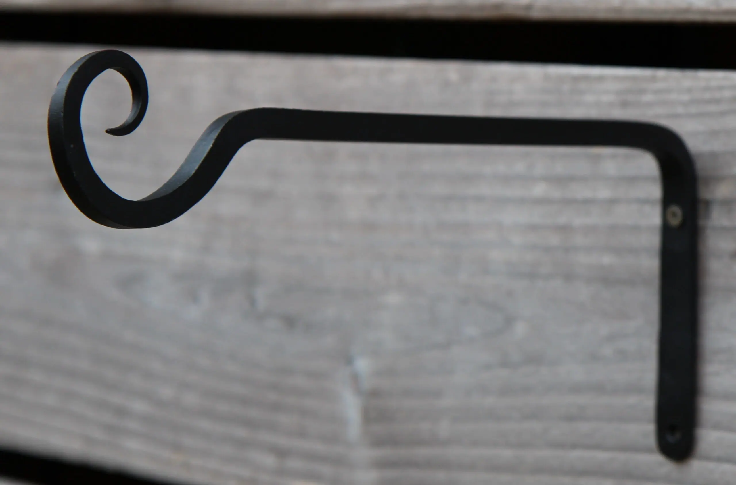 Een strakke eenvoudige wandhaak van gietijzer met aan het einde een sierlijke krul.