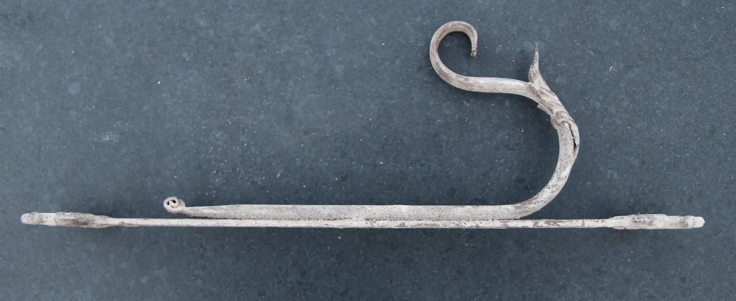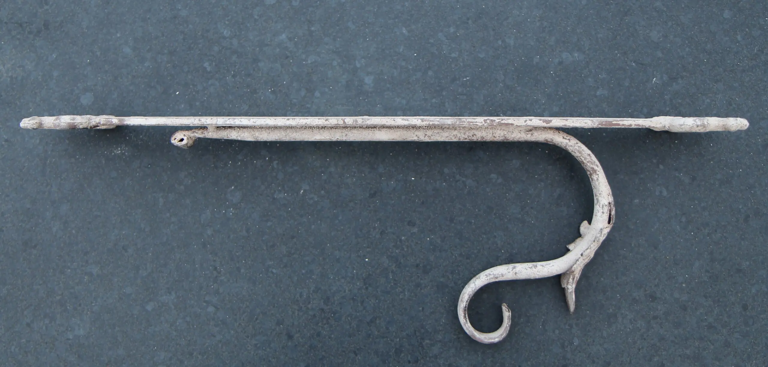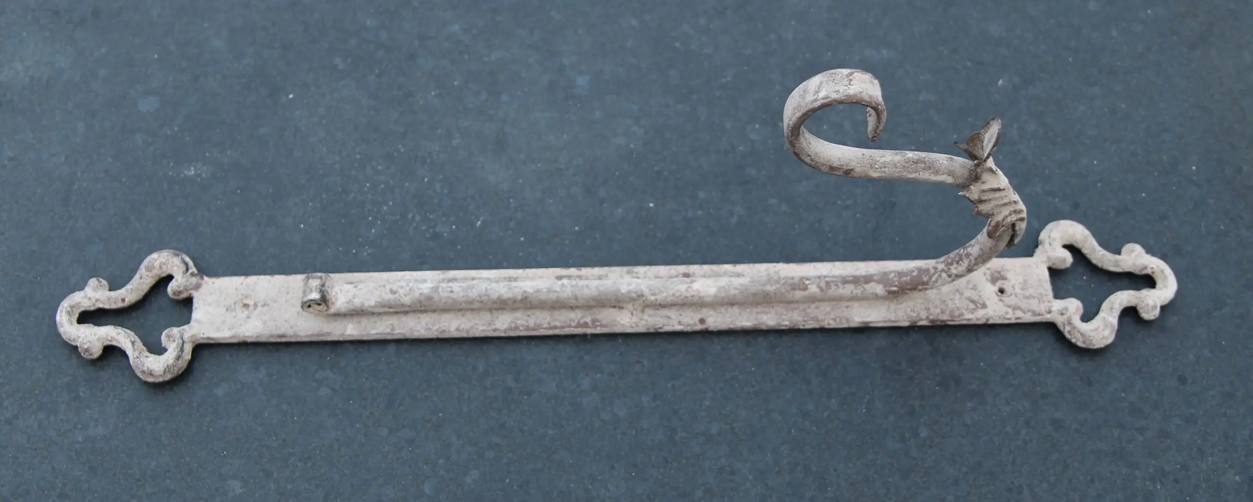 De haak heeft een mooie sierlijke krul met daarbovenop een soort gebogen blad.