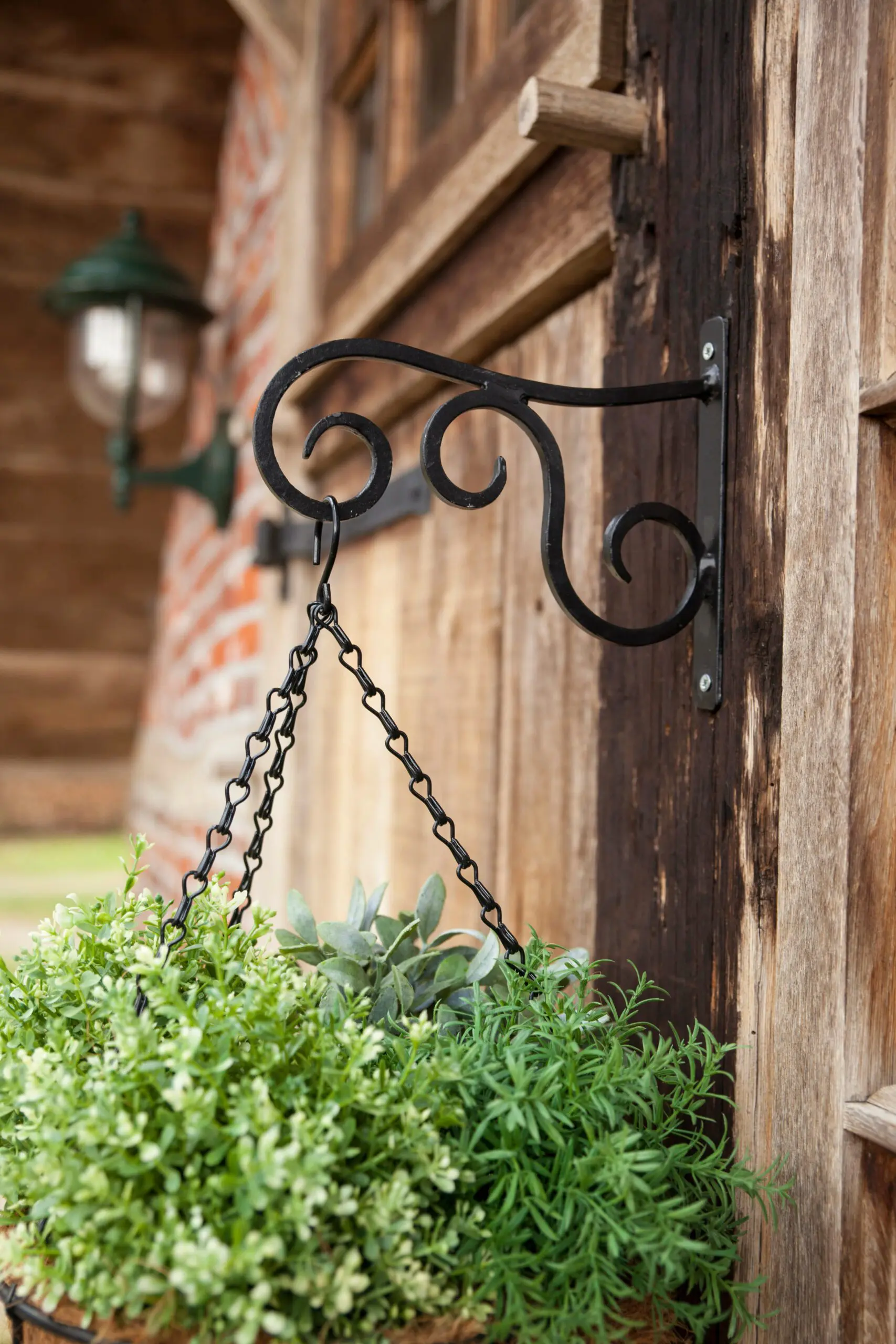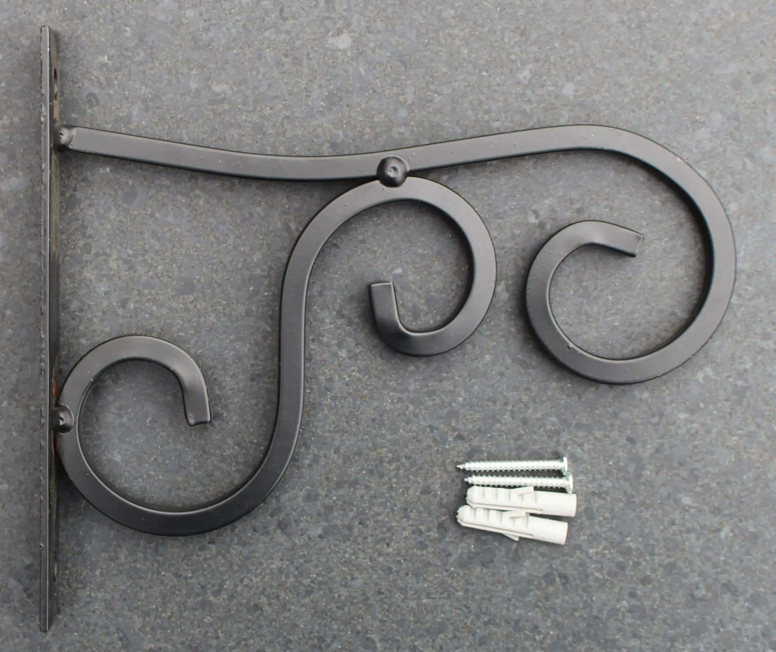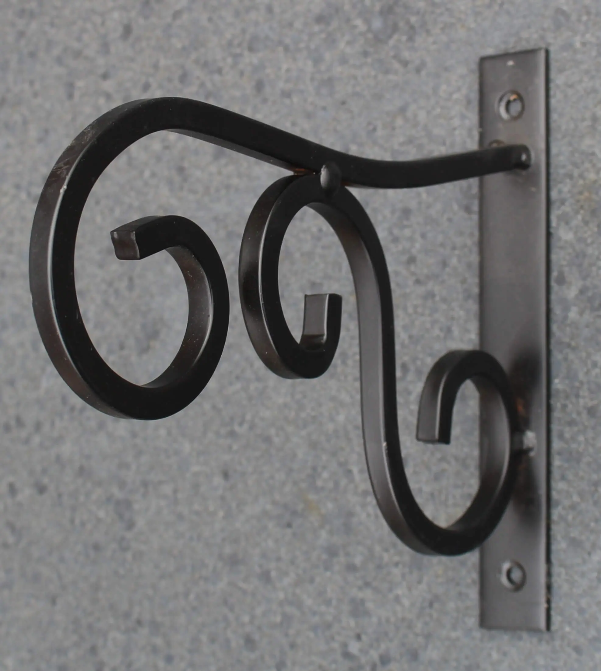 Zwarte gietijzeren wandhaak met sierlijke krullen.