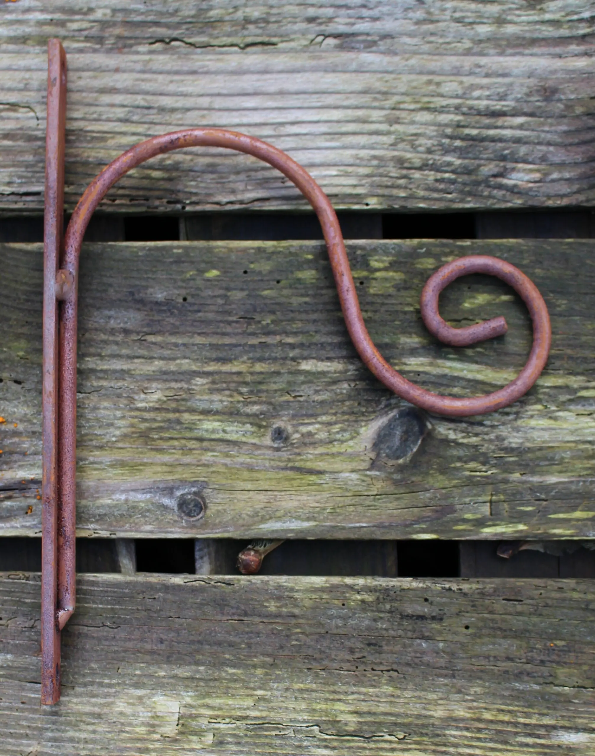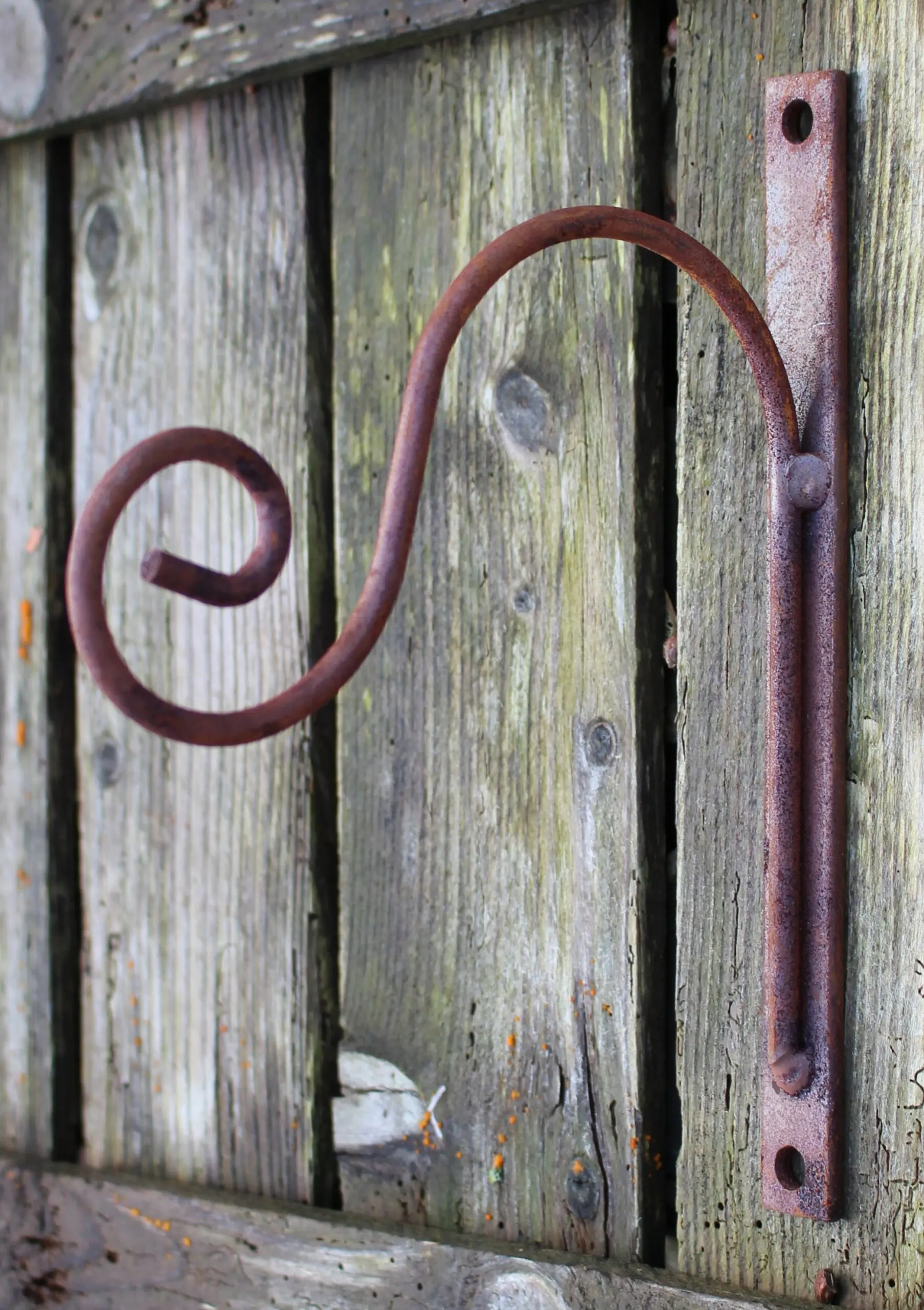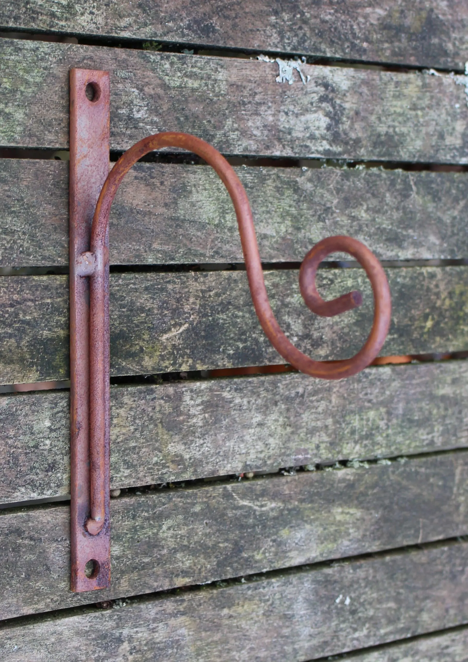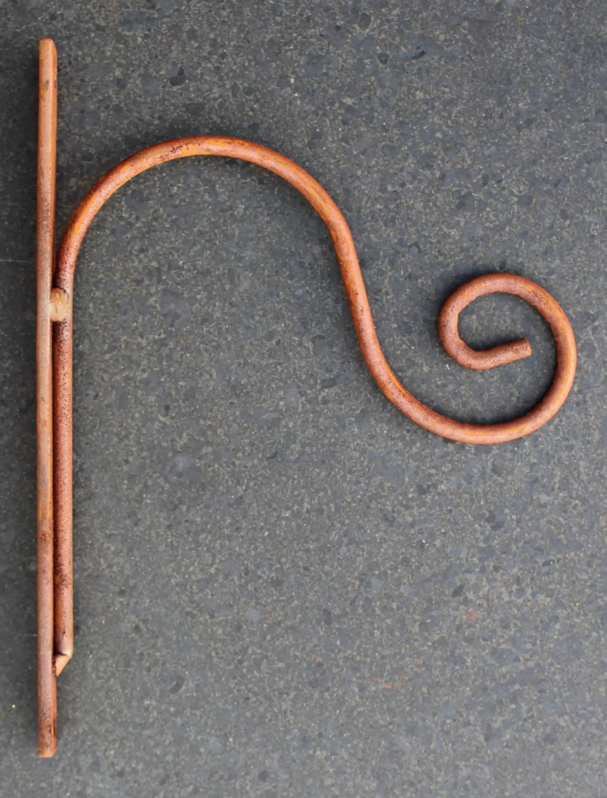 Een sierlijke stevige wandhaak van roestig ijzer.