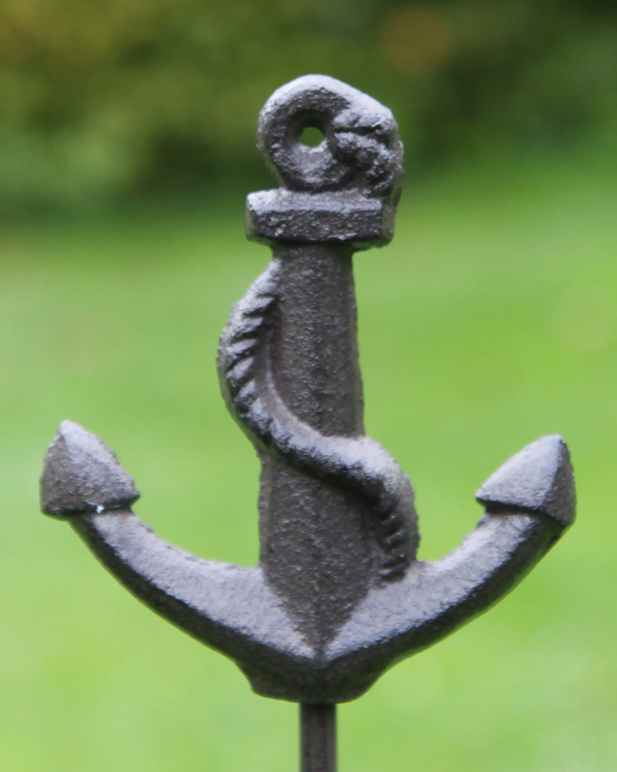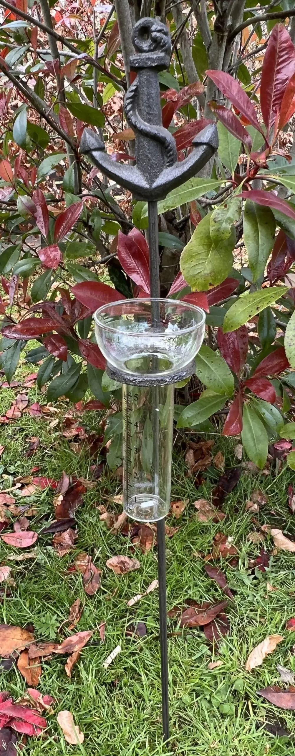 Decoratieve metalen regenmeter met een gietijzeren anker.