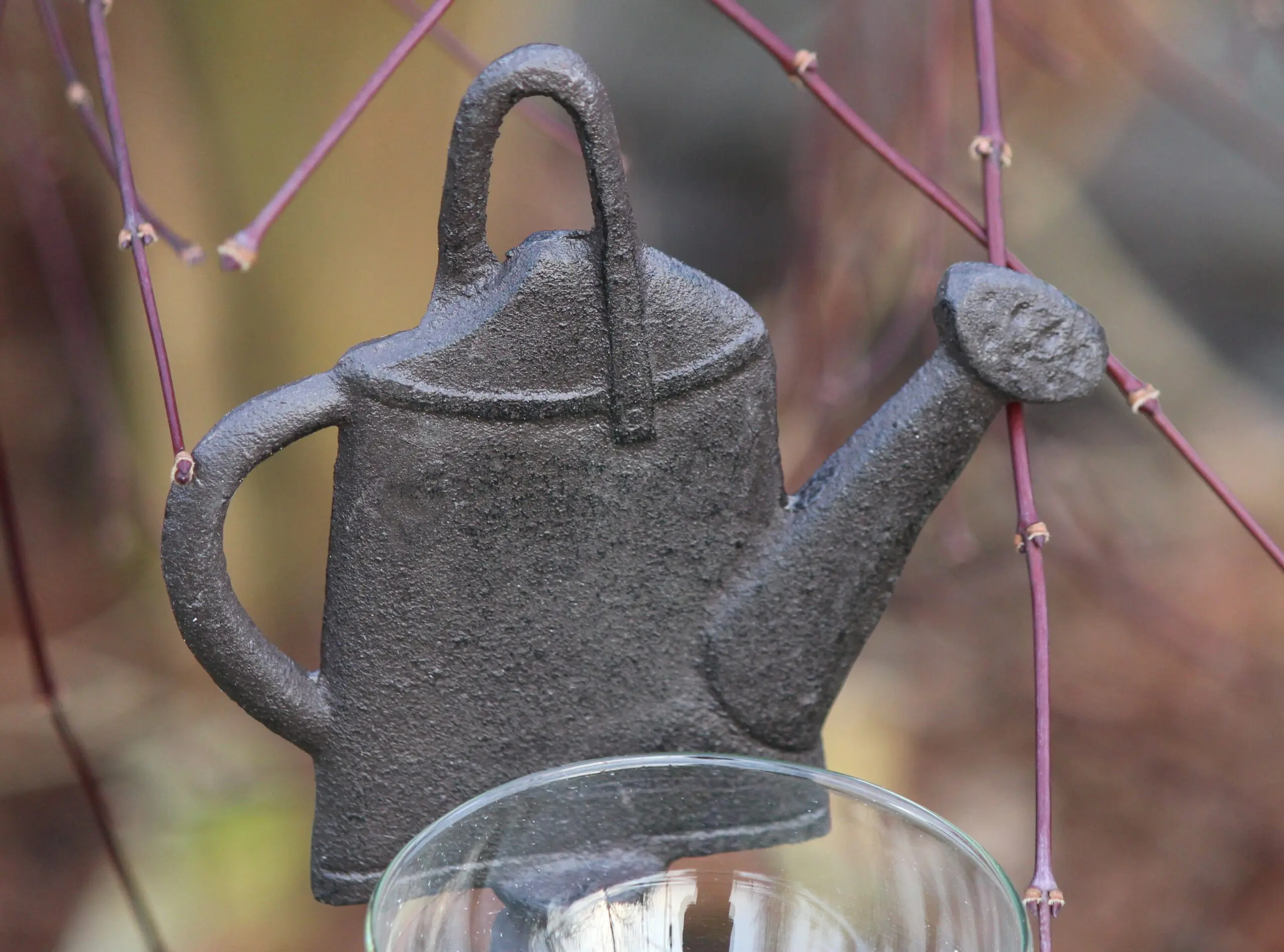 Decoratieve metalen regenmeter met afbeelding van een gieter is een blikvanger in uw tuin.