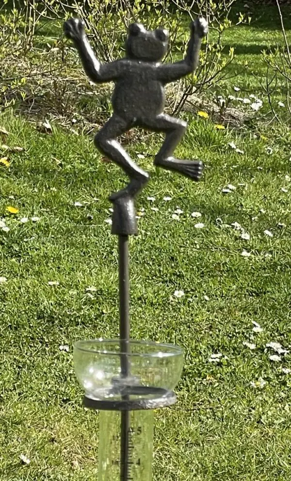 Decoratieve gietijzeren regenmeter met afbeelding van een kikker.