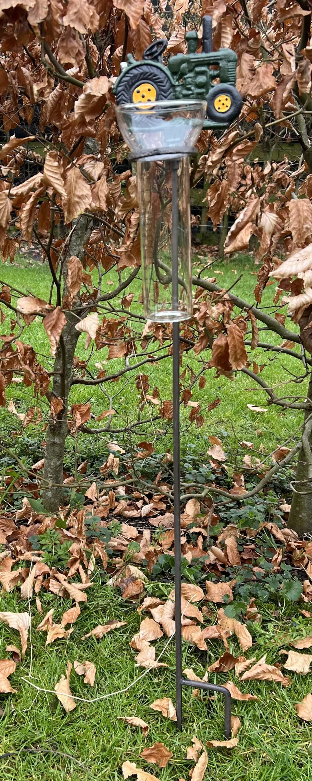 metalen regenmeter met gietijzer tractor en “echt” glas
