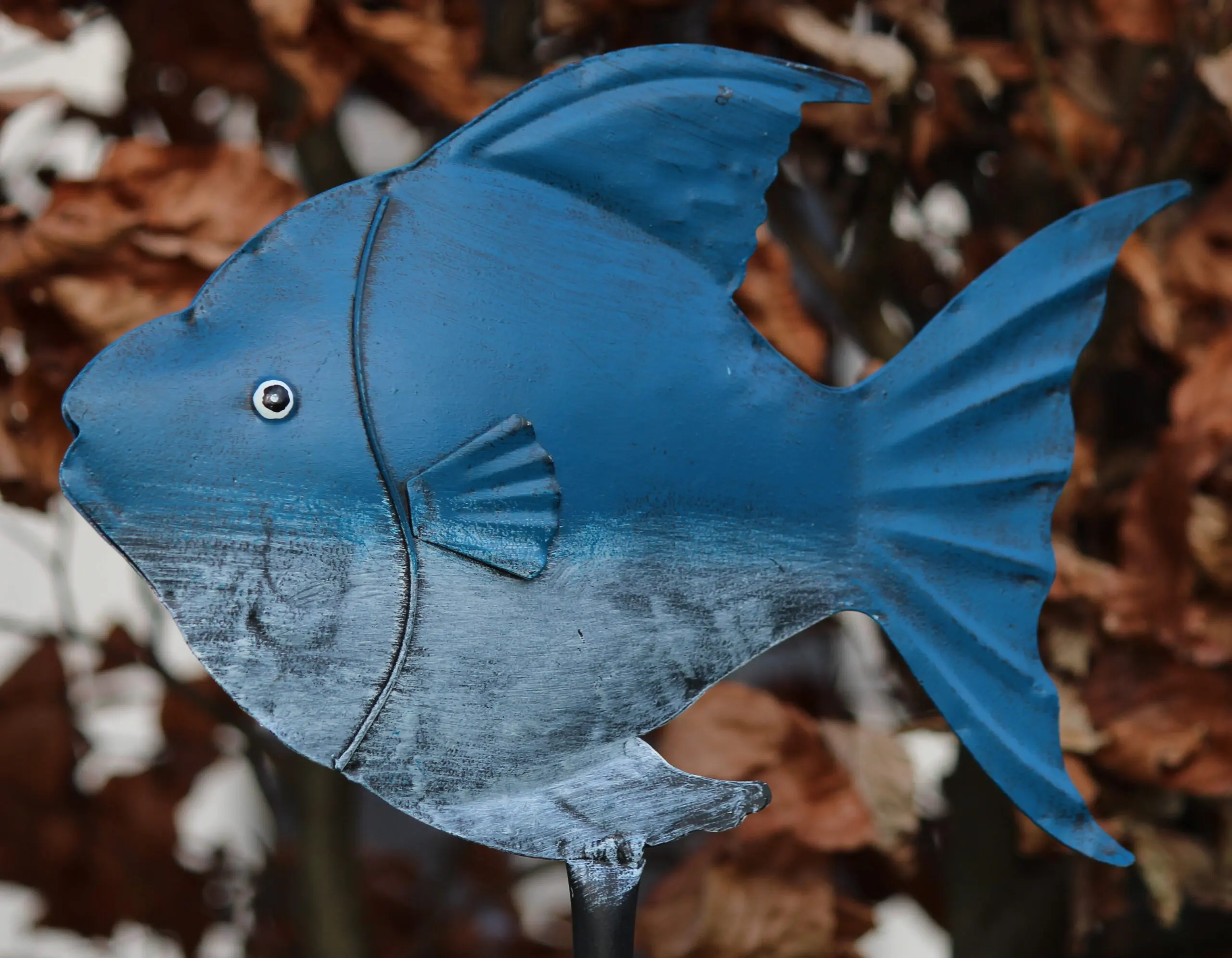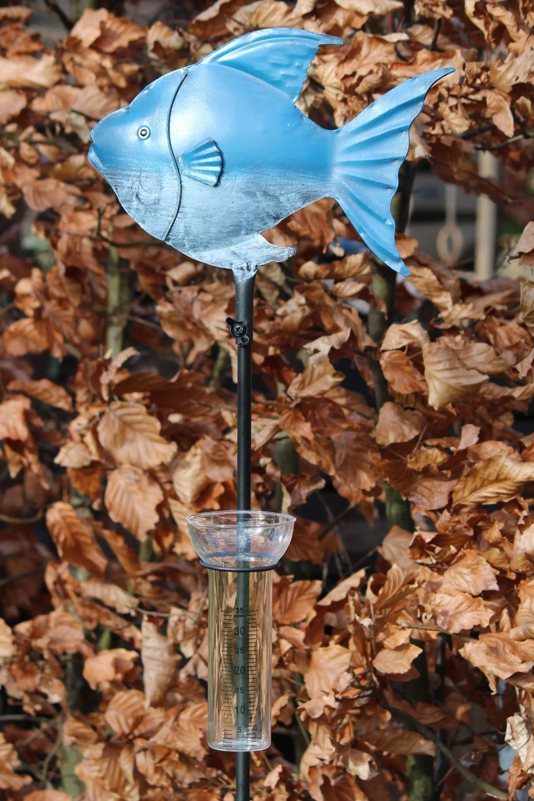 Decoratieve metalen regenmeter met bovenop de steel een vis.