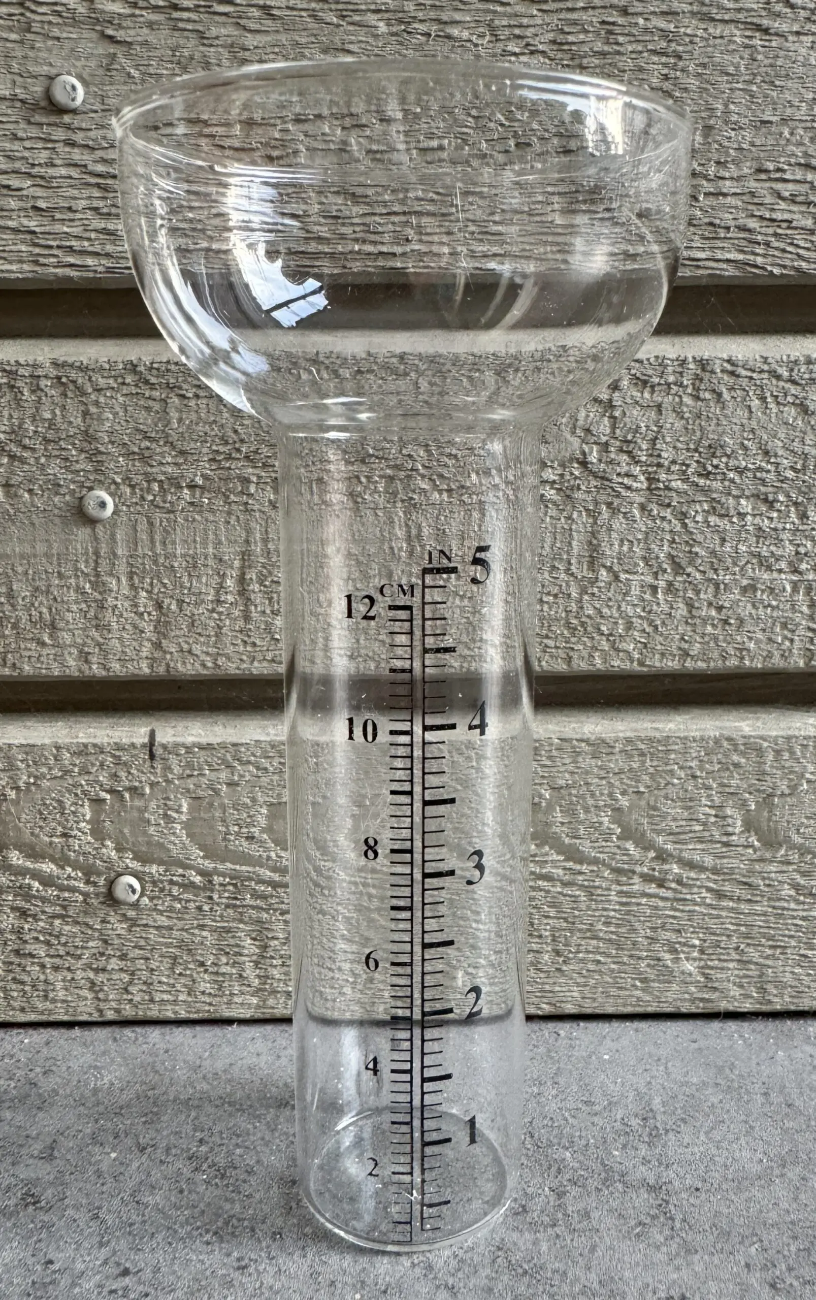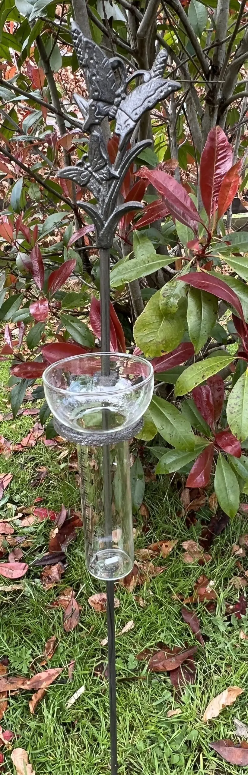 metalen regenmeter met gietijzeren vlindertjes en een glas van “echt” glas donkerbruin