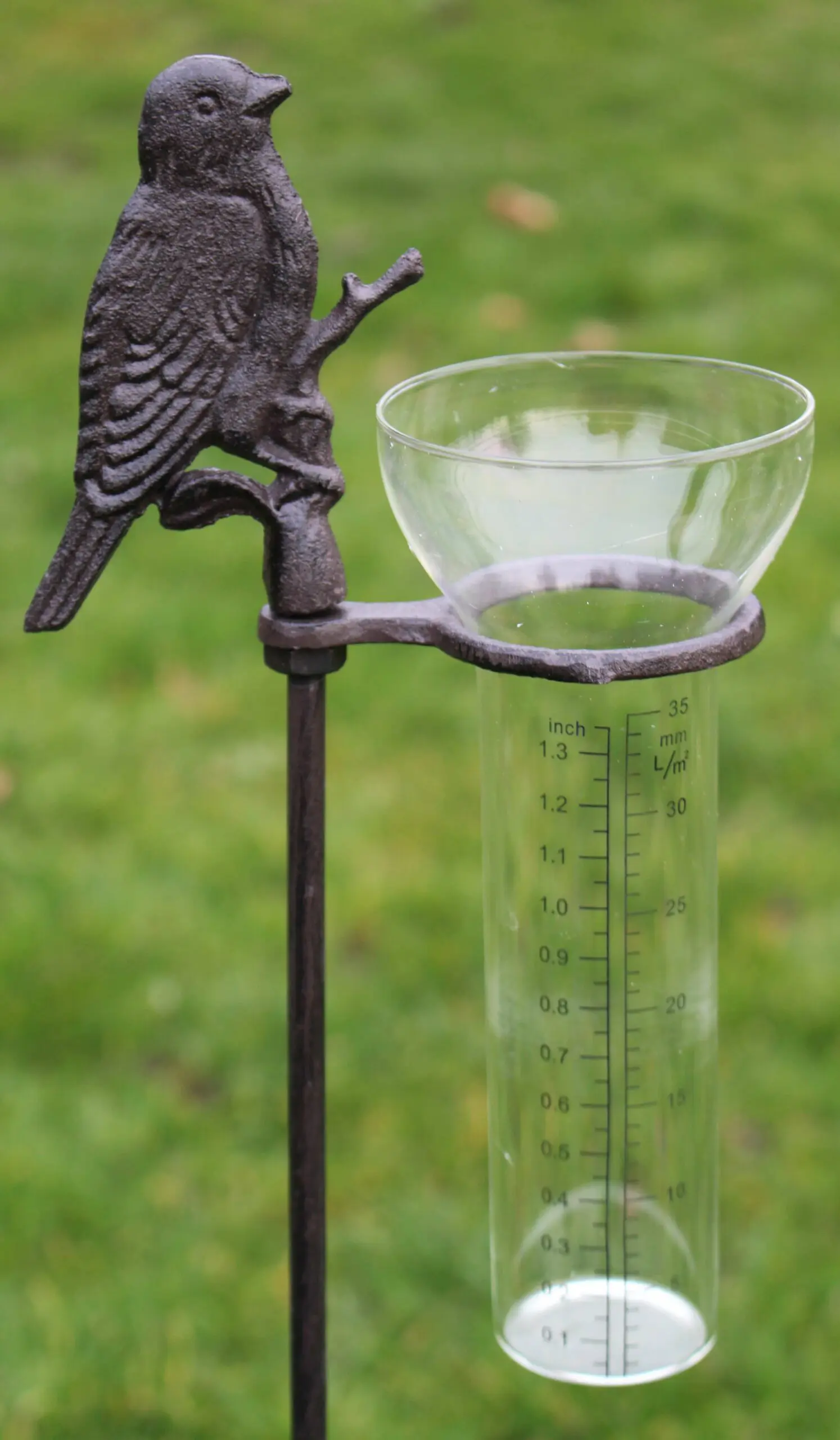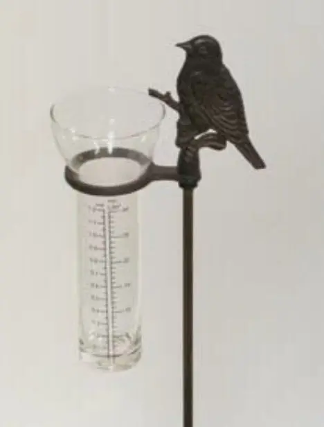 metalen regenmeter met gietijzeren vogel en een glas van “echt” glas donkerbruin