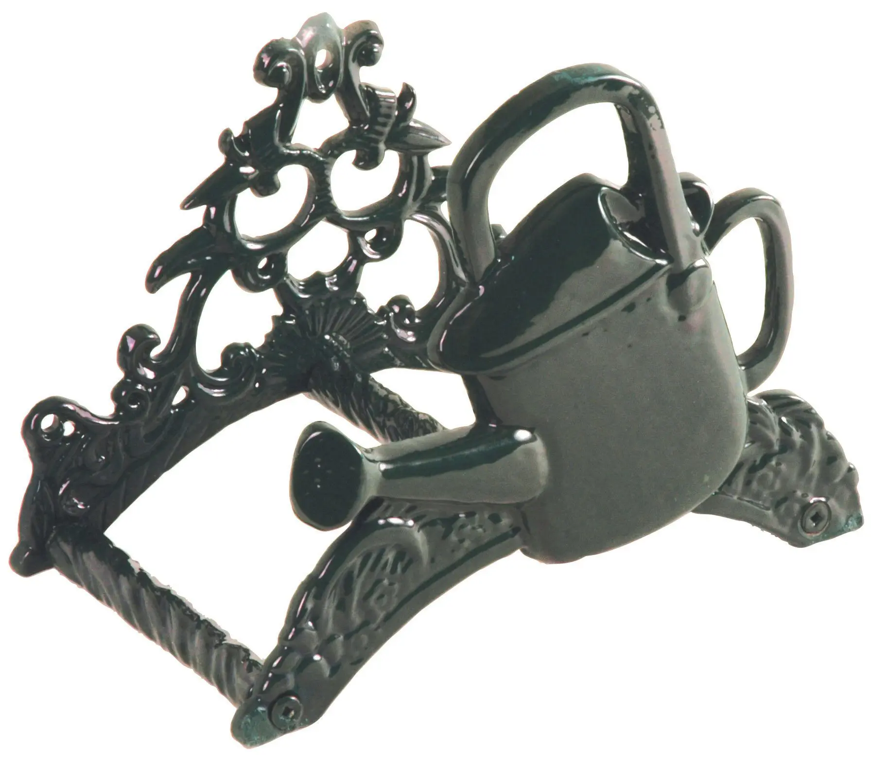 Een groen gepoedercoated gietijzeren tuinslanghouder.