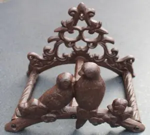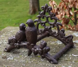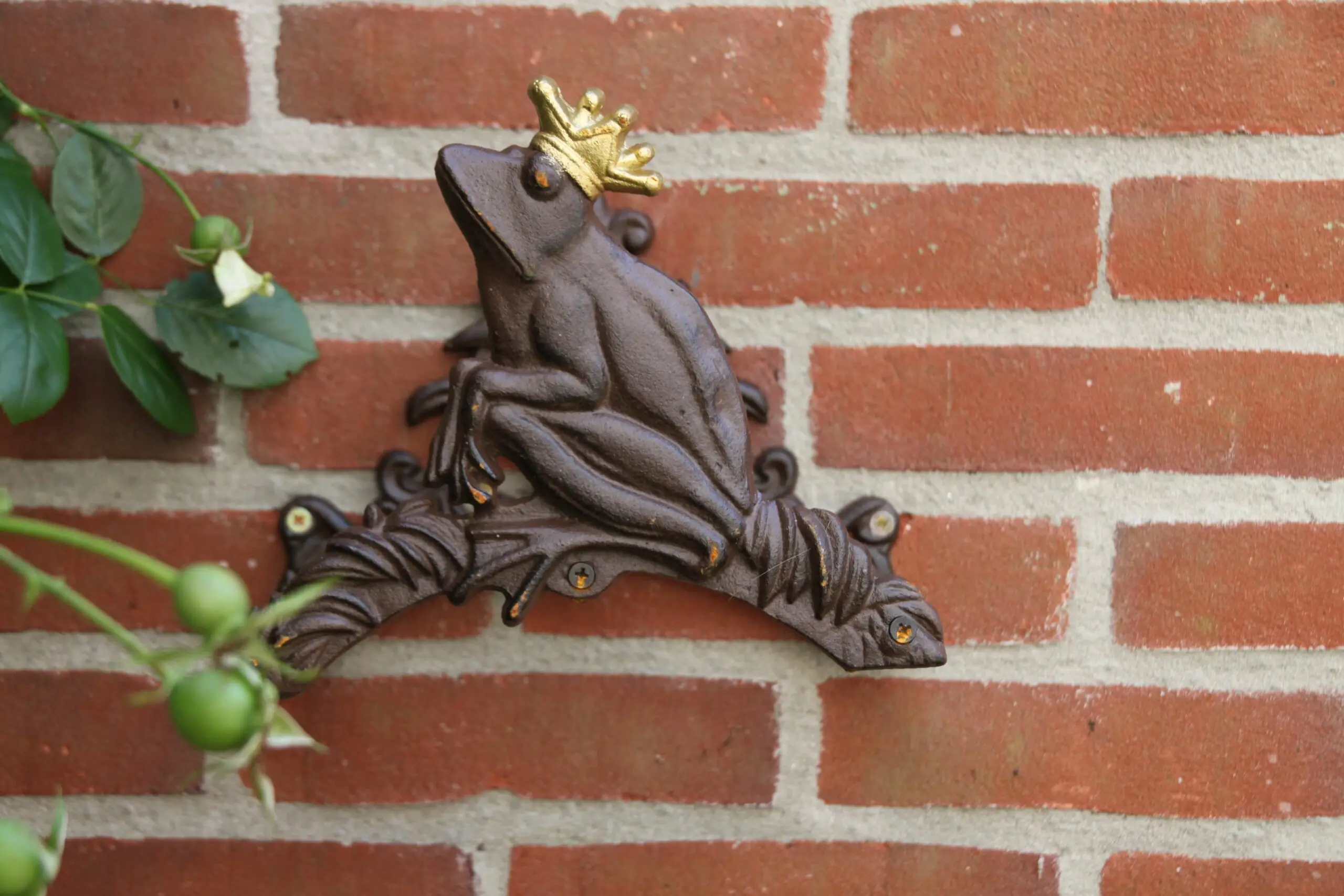 De gietijzeren tuinslanghouder, uitgevoerd met een kikkerkoning motief.