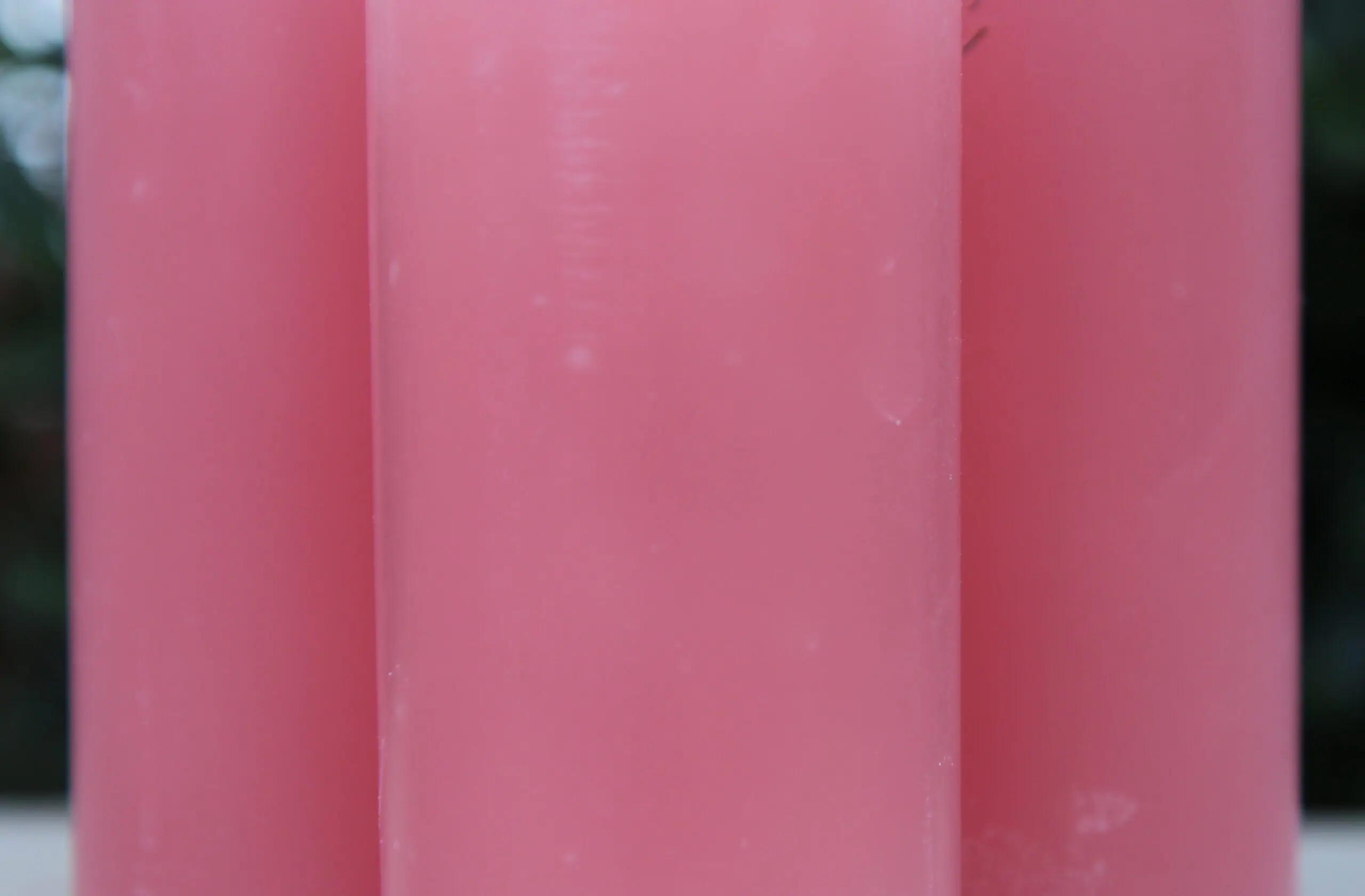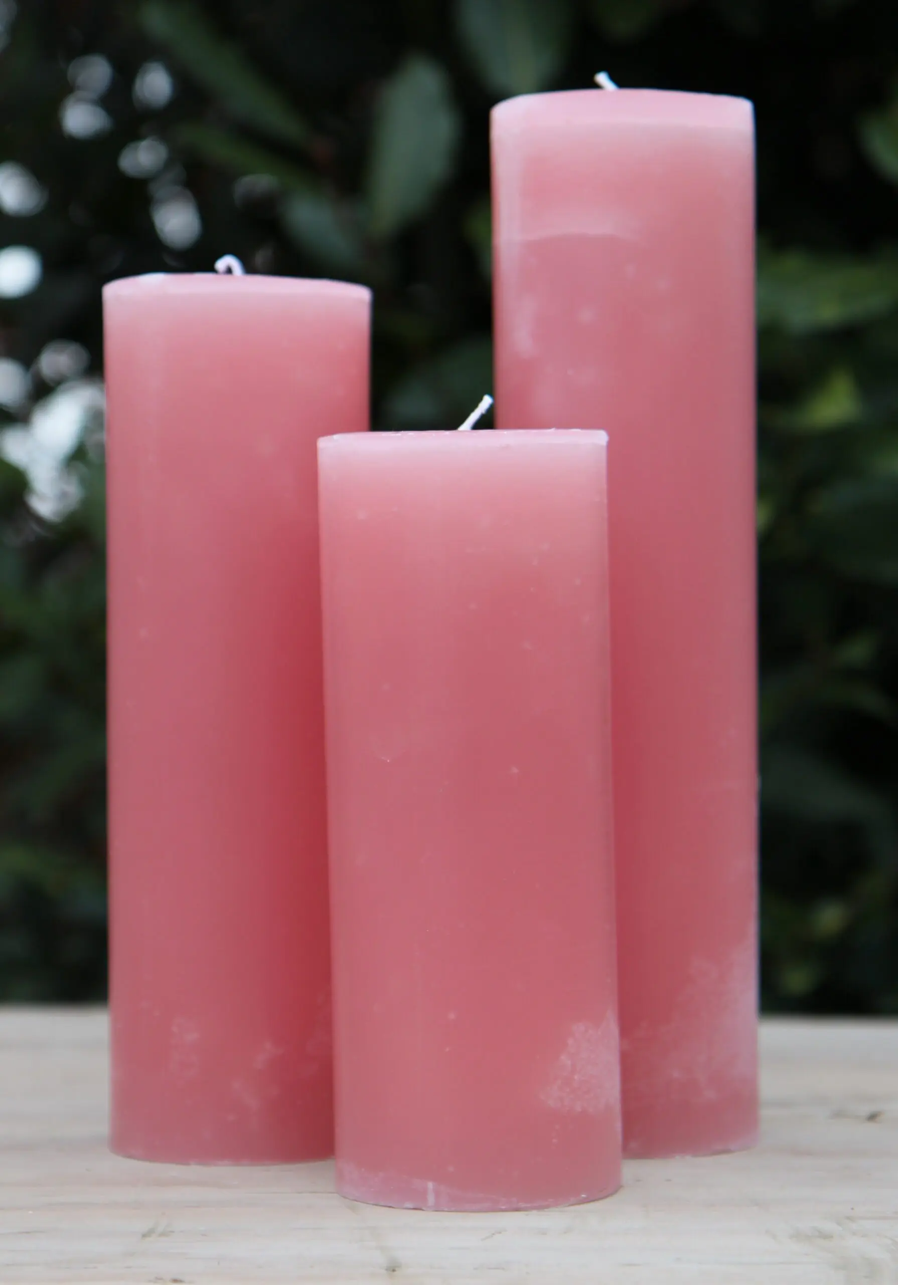 Pakket van 3 Maria Buytaert/Bika kaarsen in de kleur baksteen, een soort licht rood en glad afgewerkt.