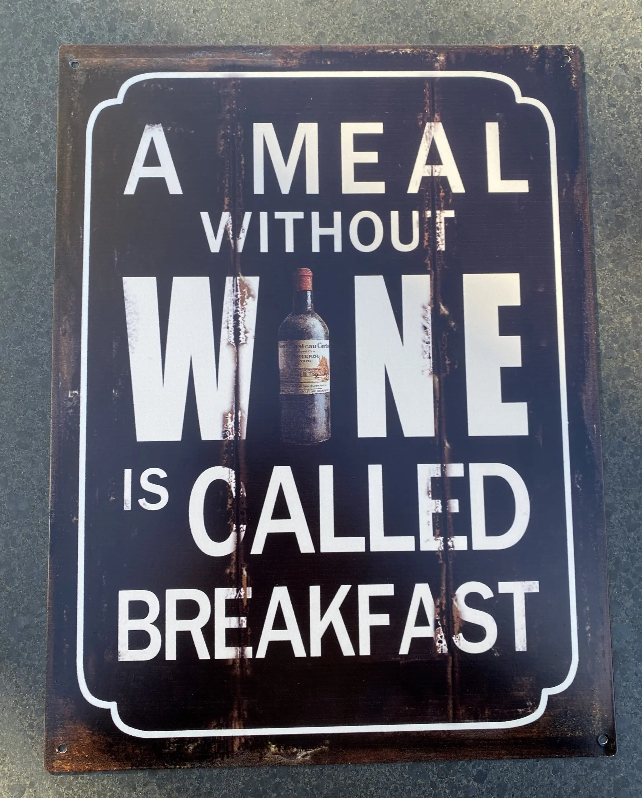 metalen tekstbord: “A meal without wine is called breakfast”