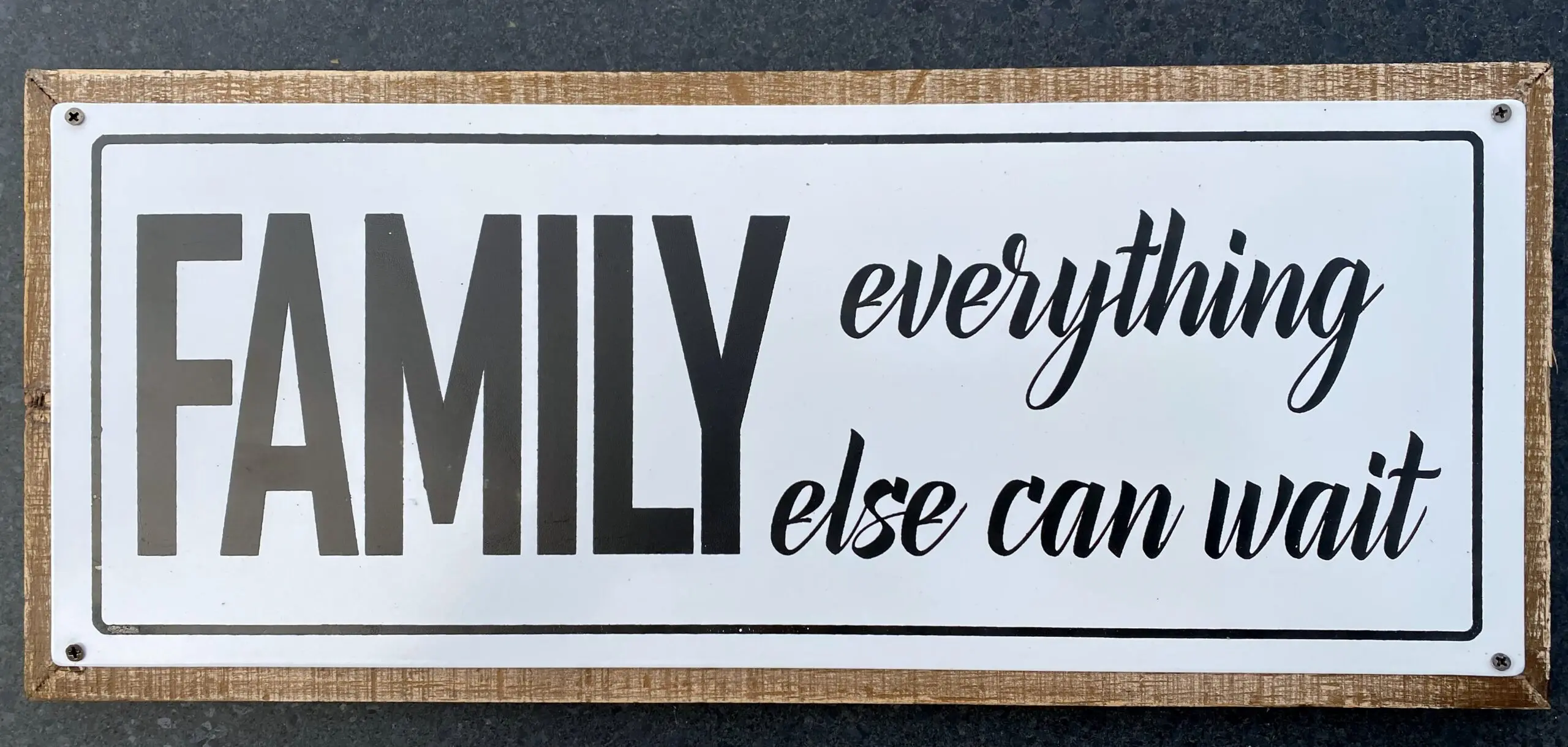 Een langwerpig metalen tekstbord met houten lijst; “family everything else can wait”