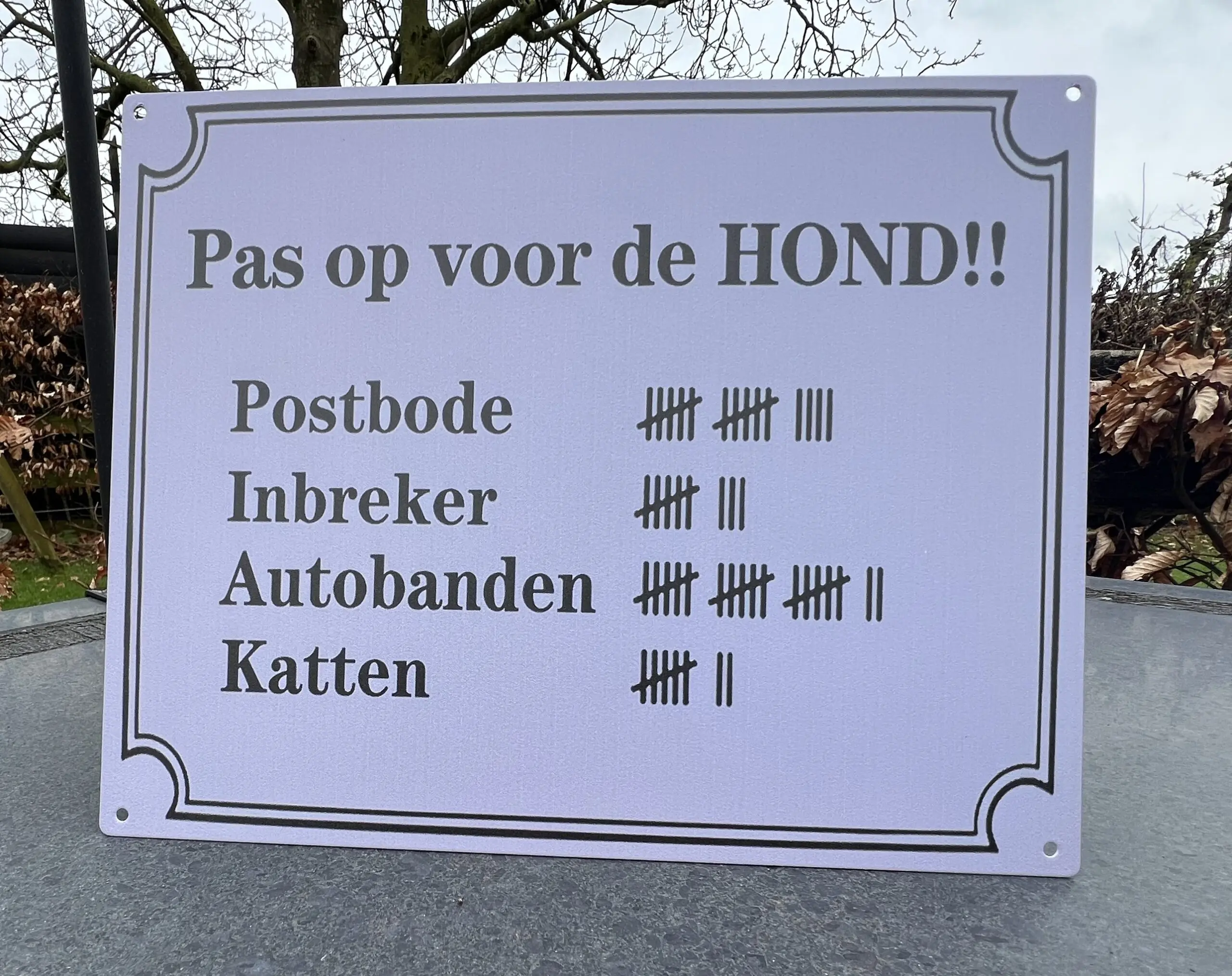 metalen tekstbordje “pas op voor de hond” grijs/blauw en zwart