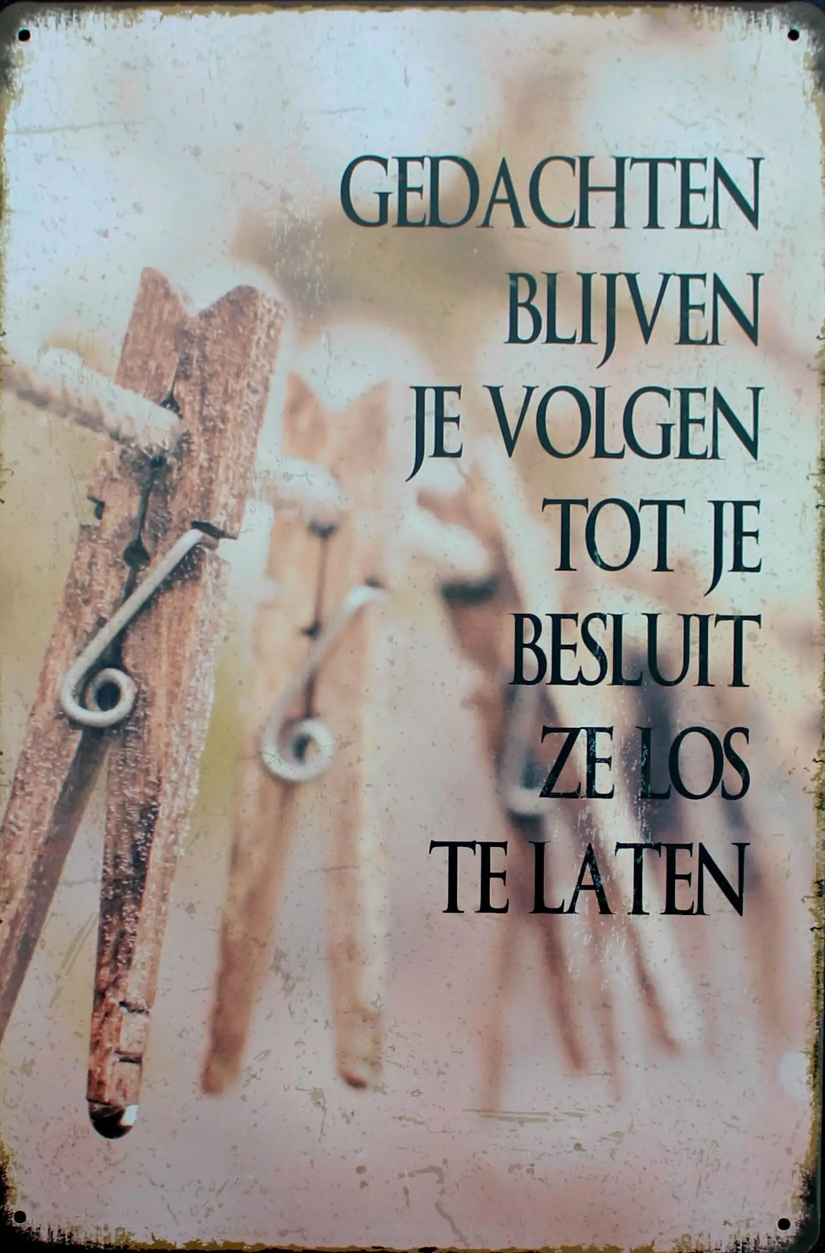 metalen tekstbord “gedachten blijven je volgen tot je besluit ze los te laten”