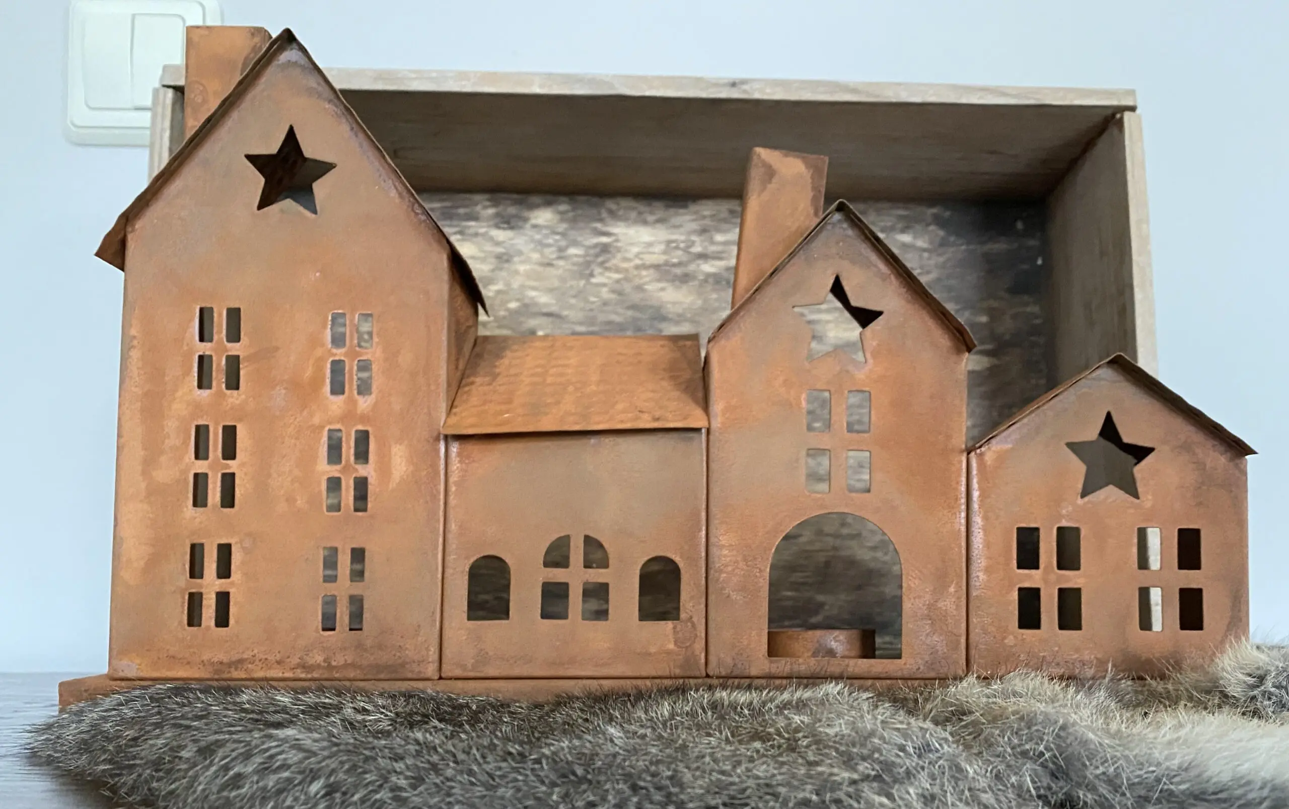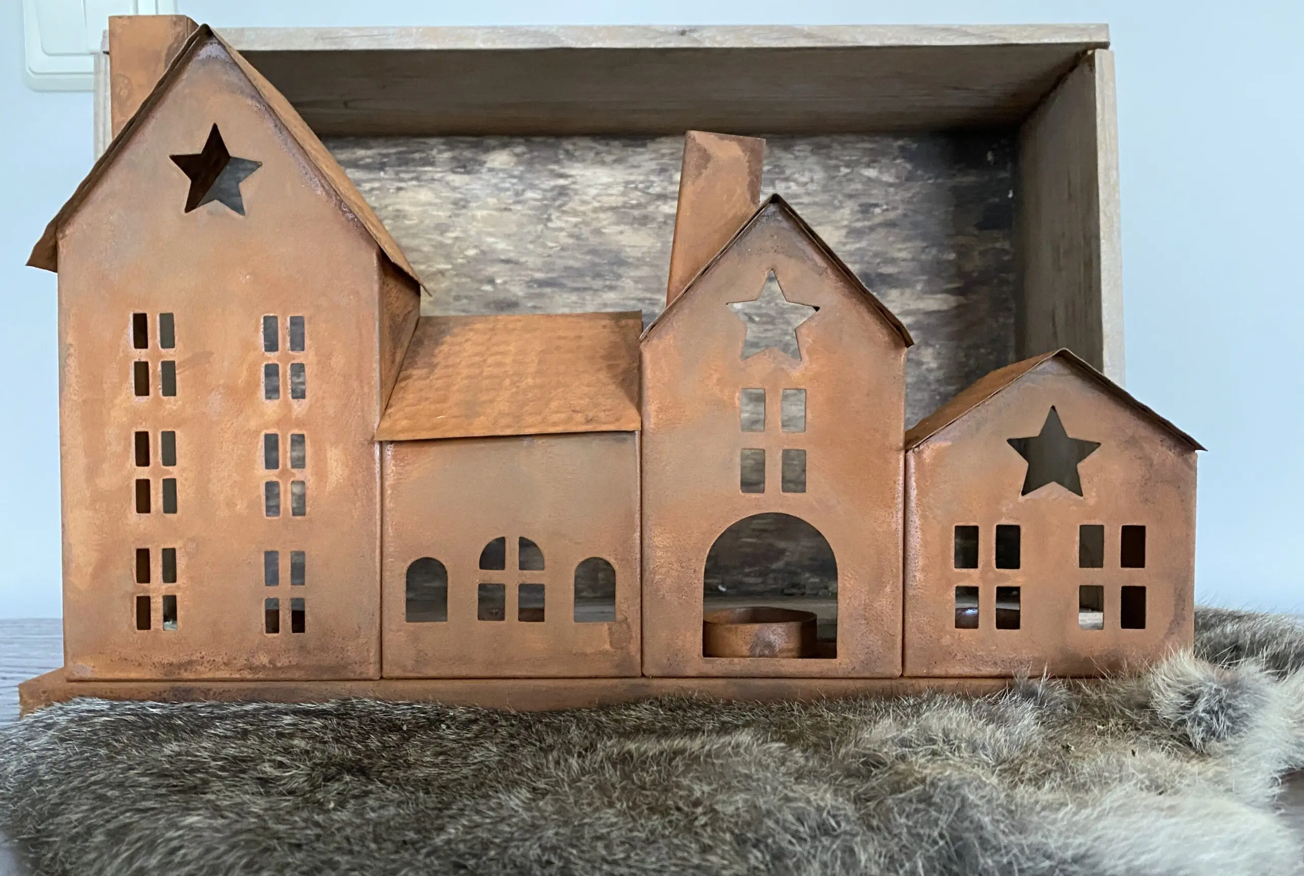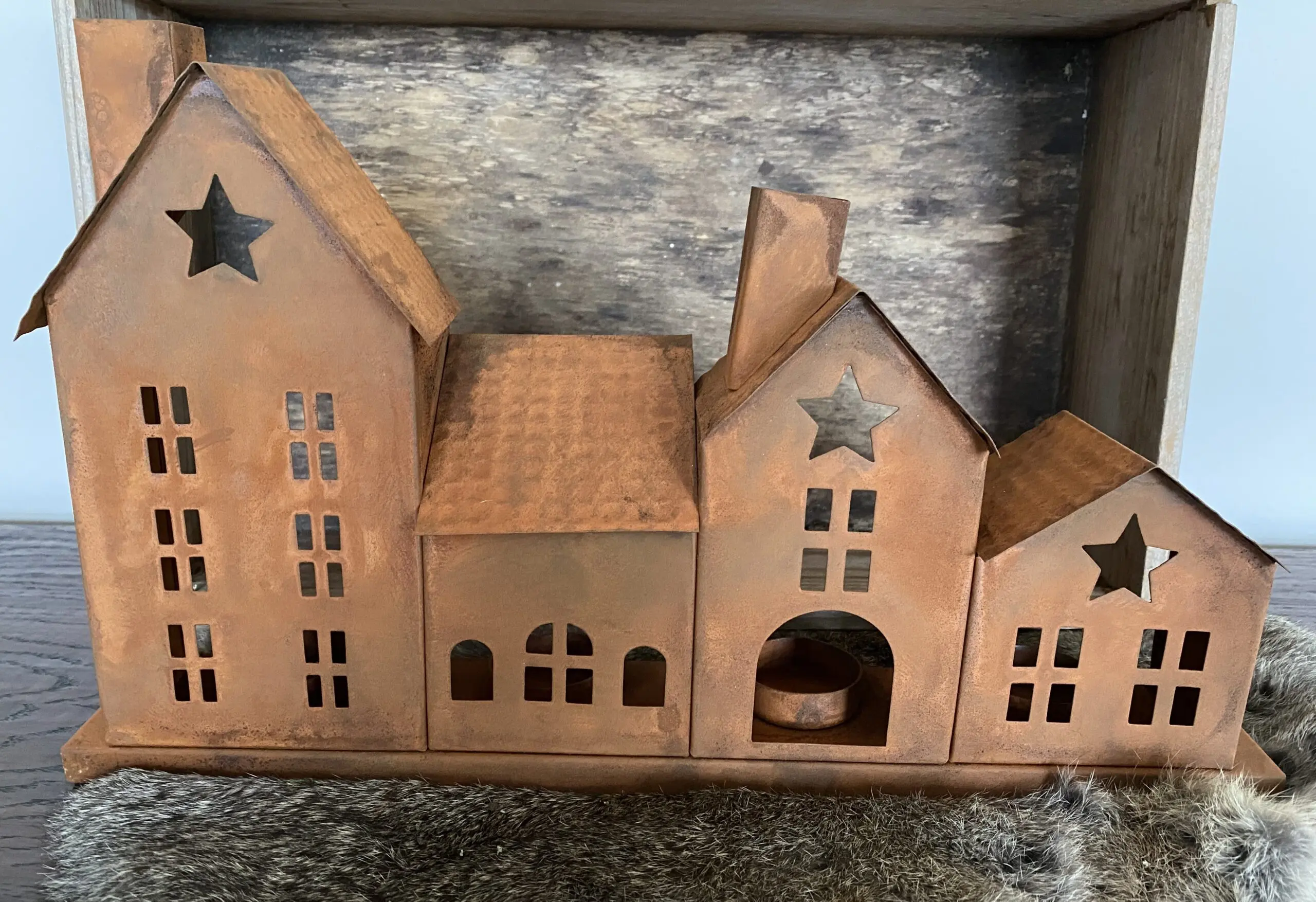 4 metalen roestige huisjes aan elkaar met waxinelichthouder