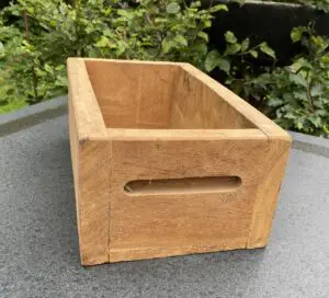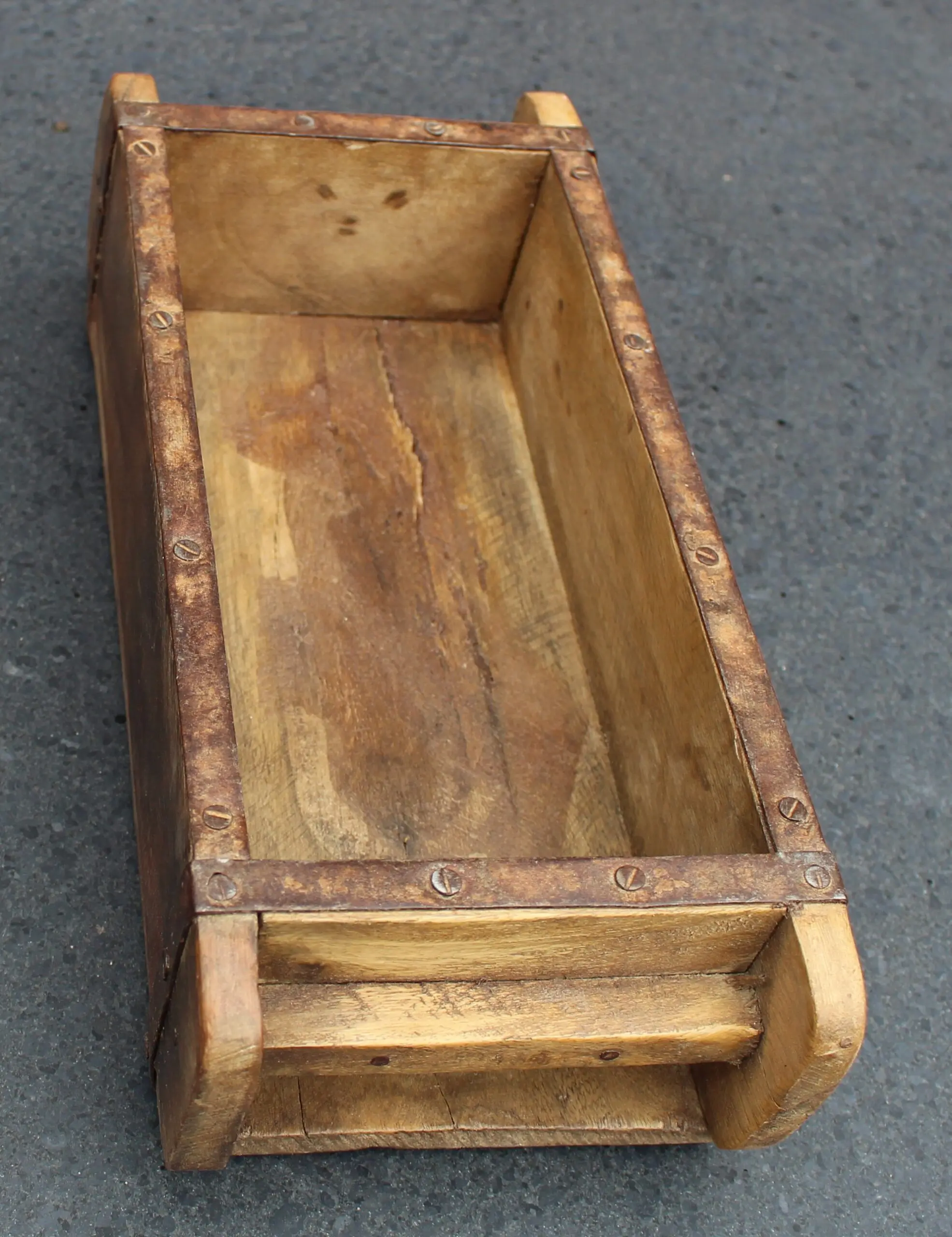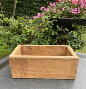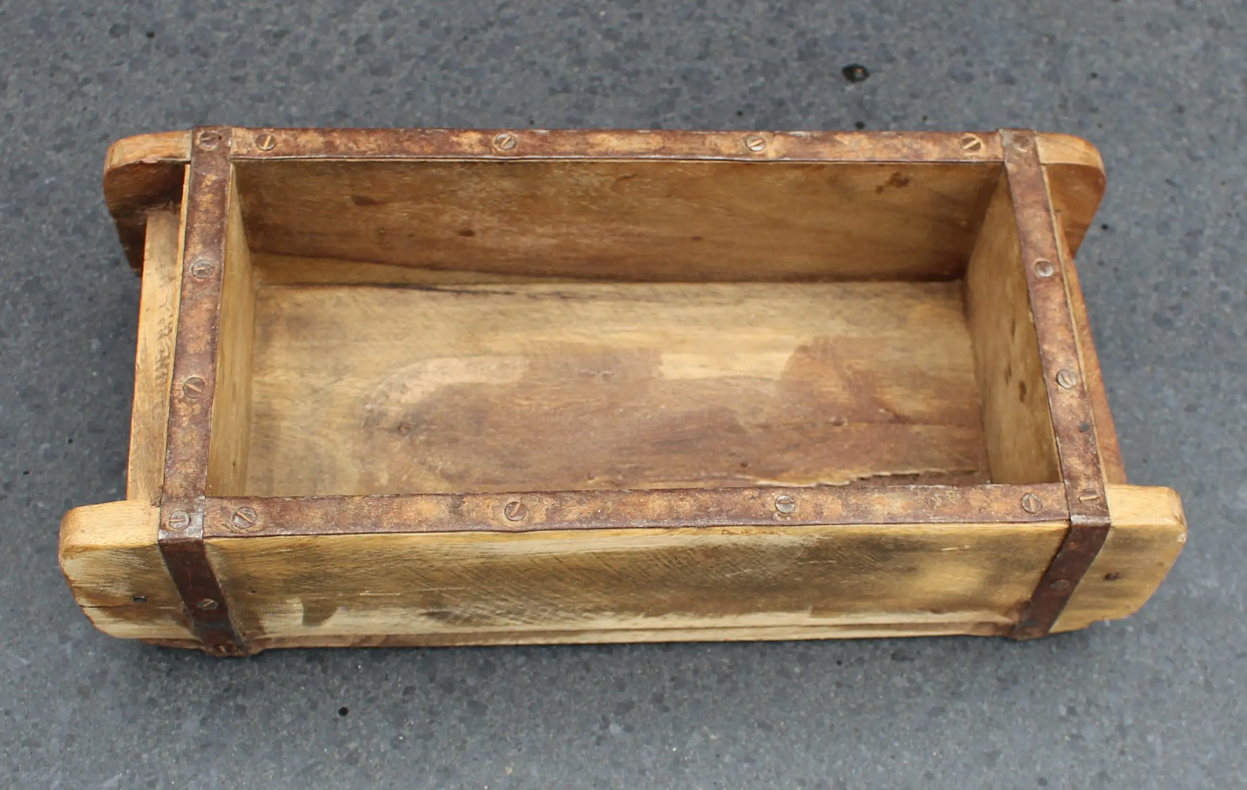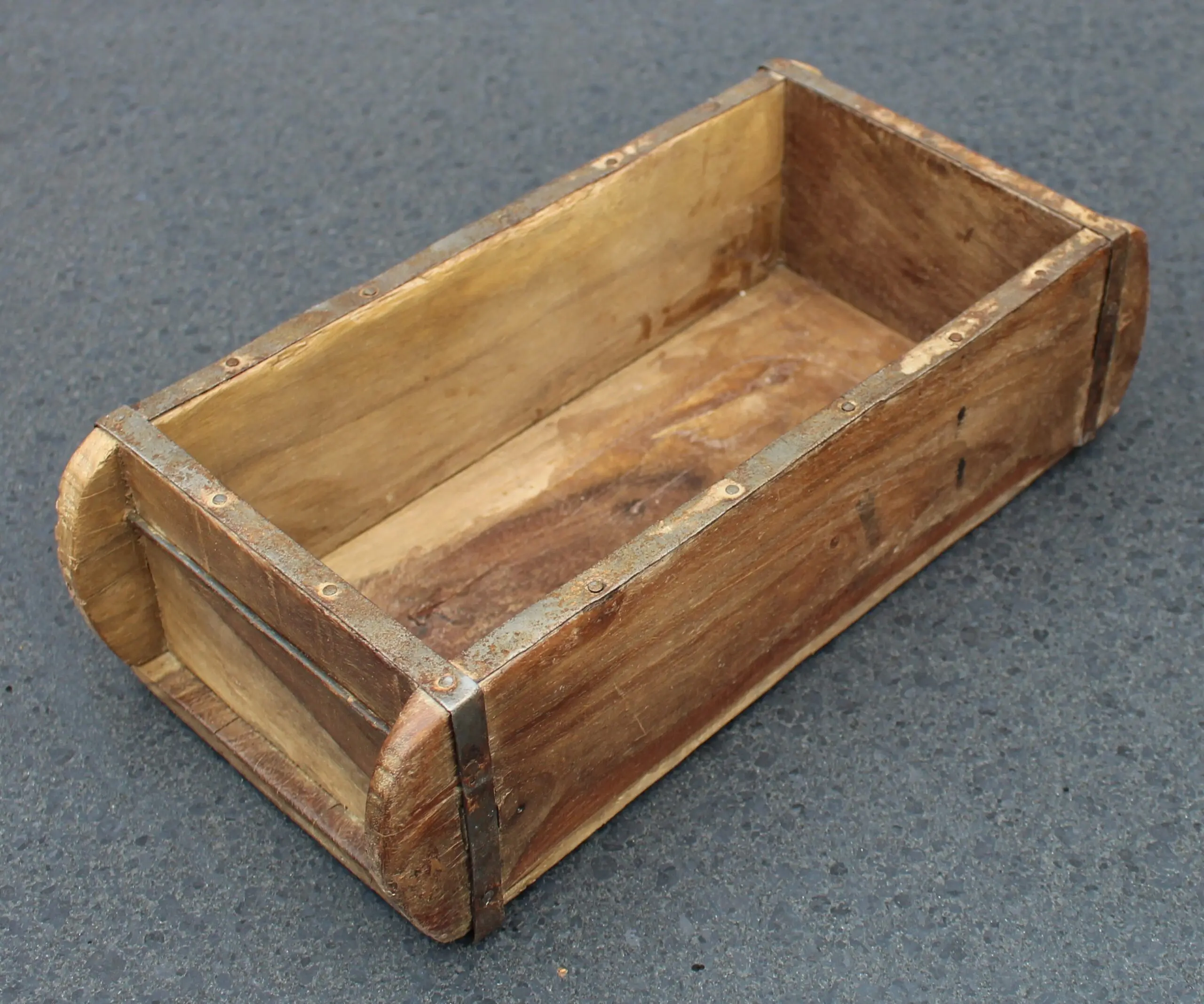 Een houten bak, die gebruikt is voor het maken van handgemaakte bakstenen.