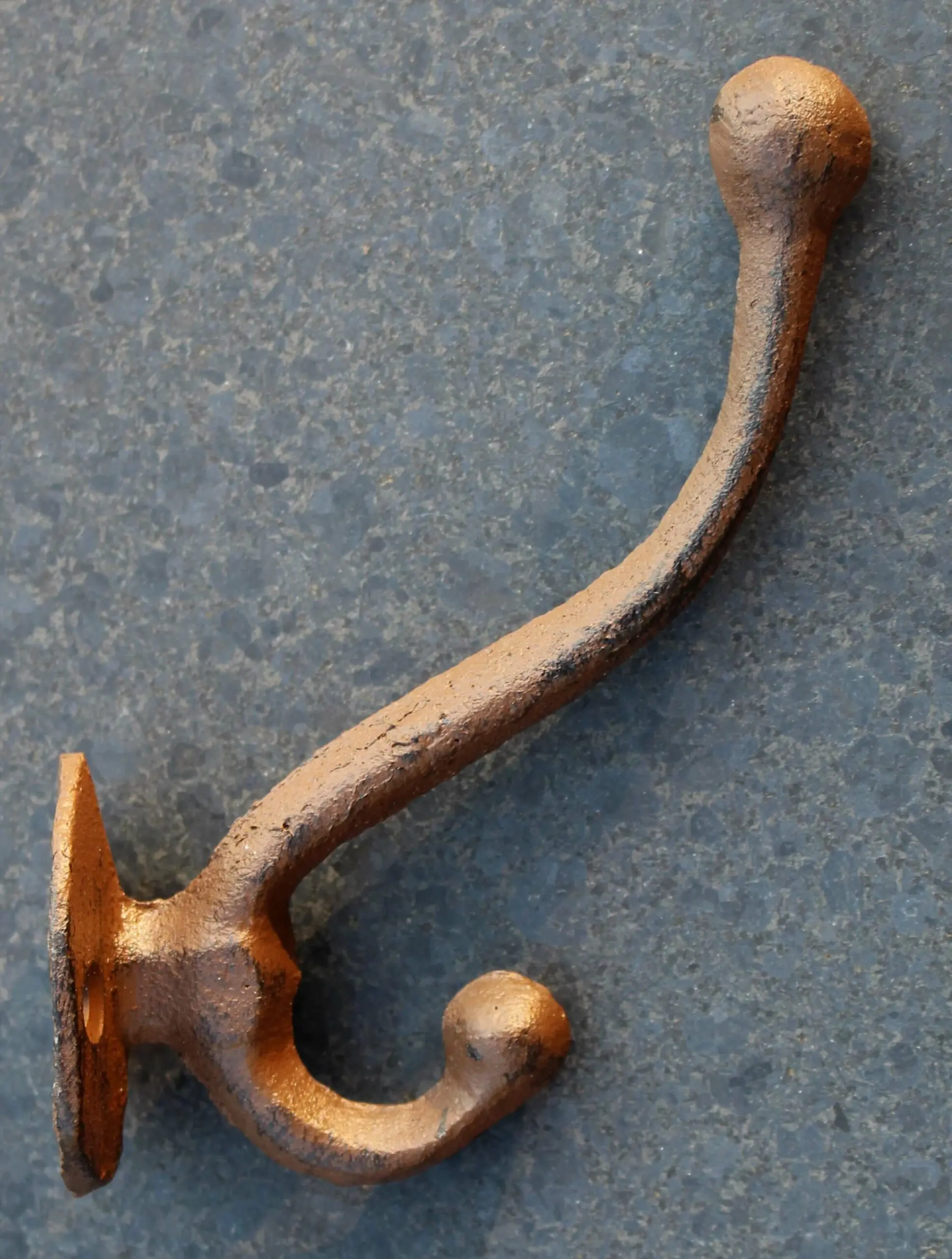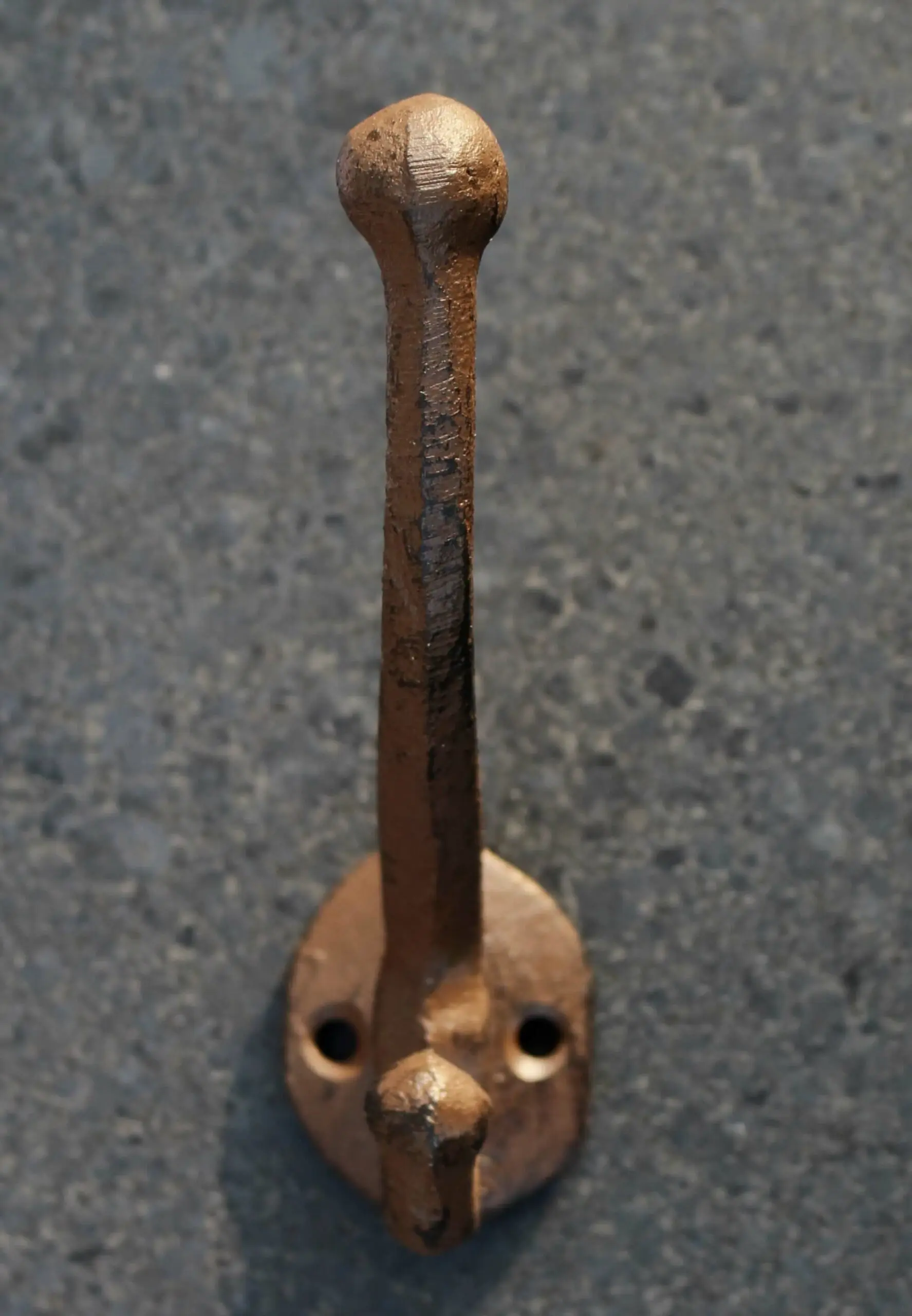 Mooie donkerbruine gietijzeren haak, met dubbele haak.