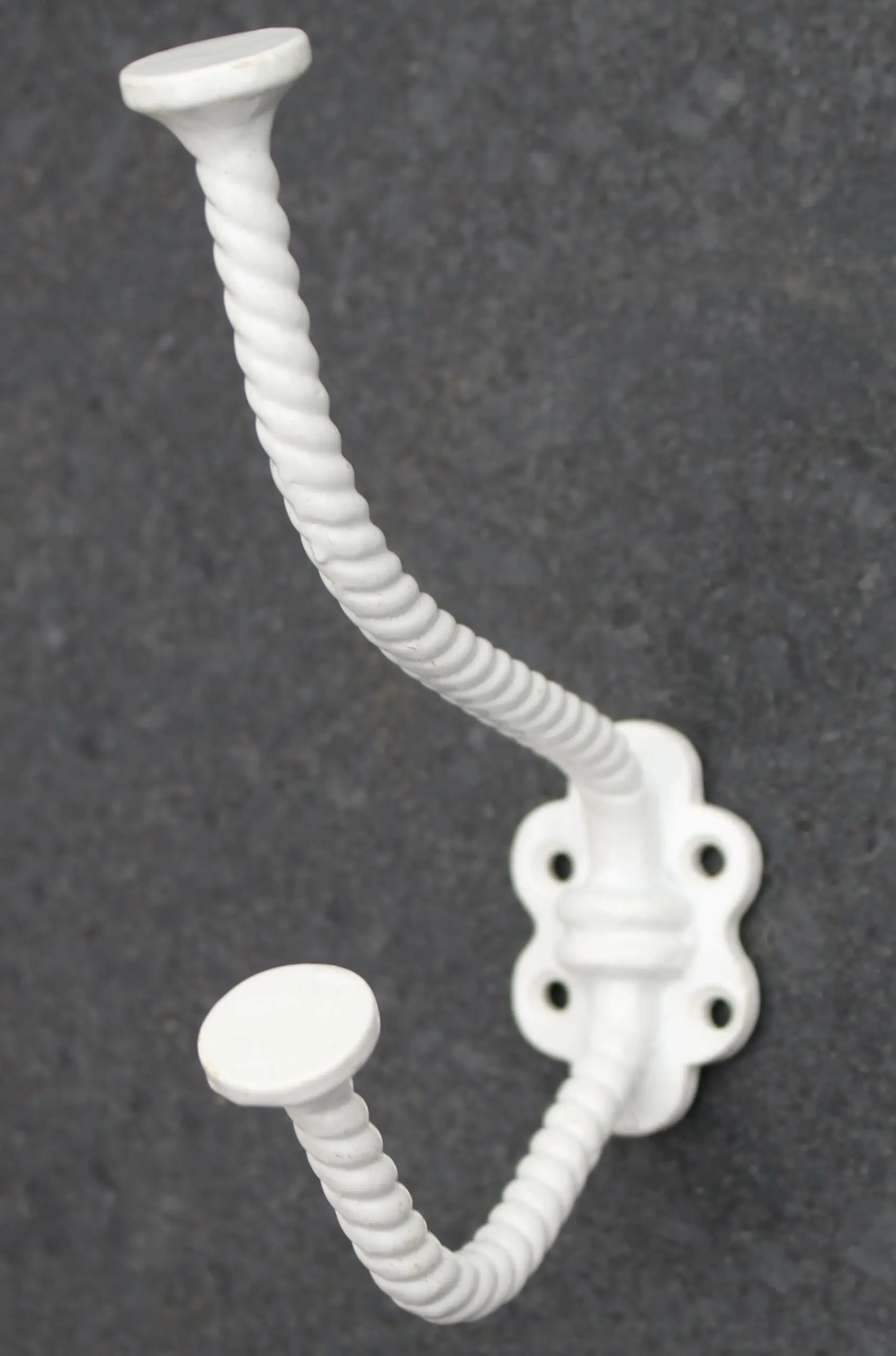 Witte sierlijk slanke gietijzeren dubbele kapstokhaak met kleine wandplaat.