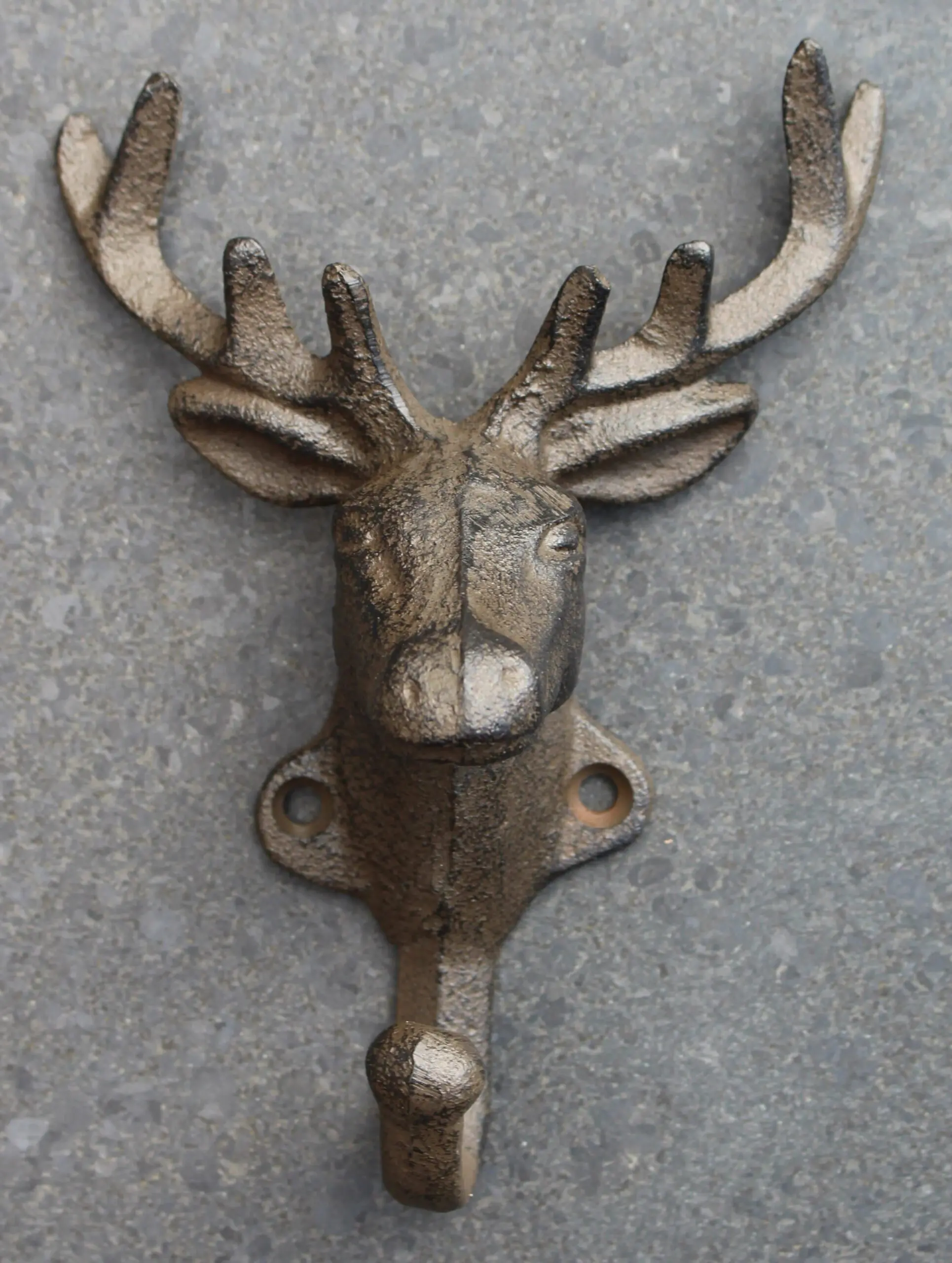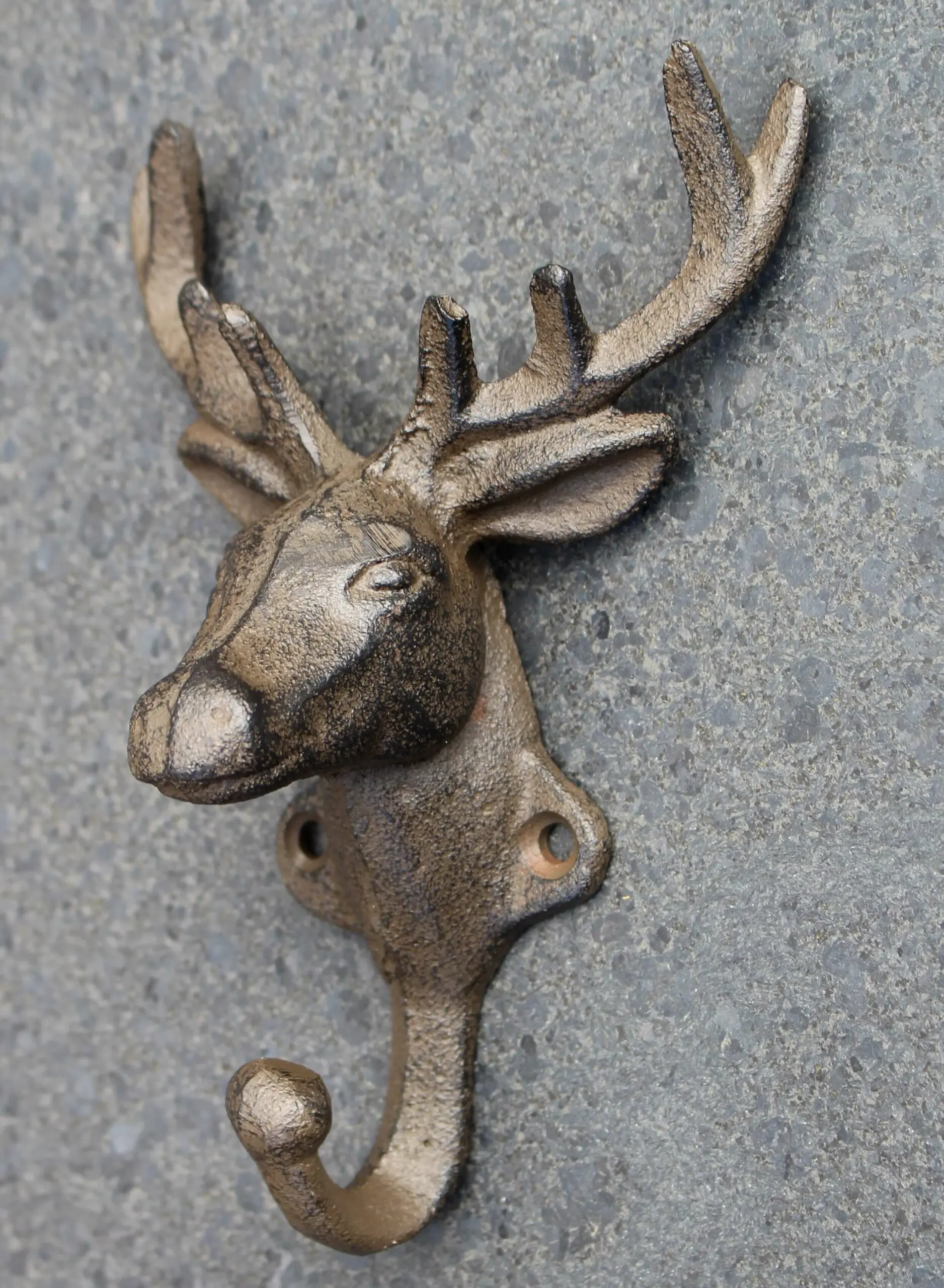 Gietijzeren kapstokhaak met kop van een hert met gewei.
