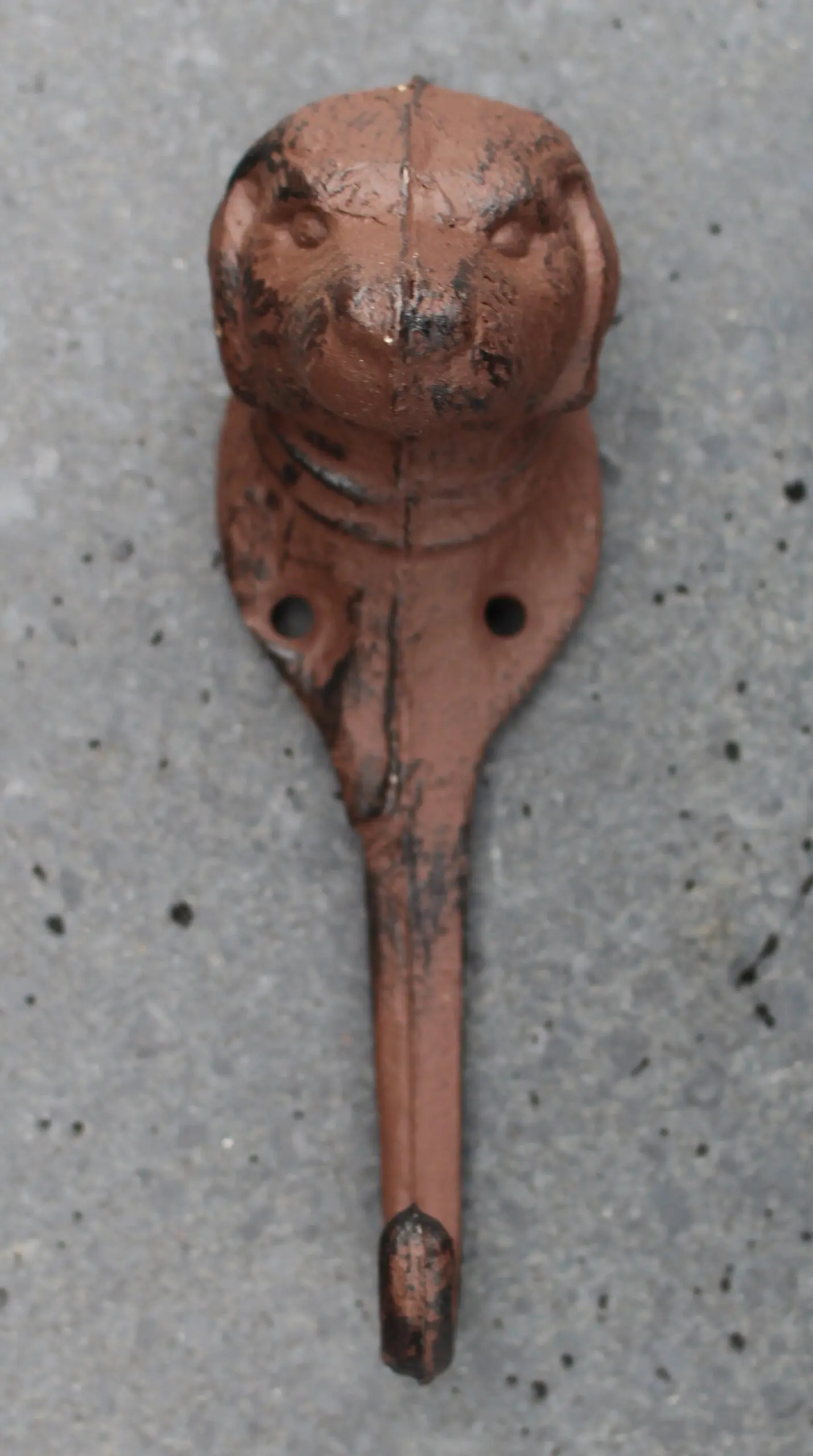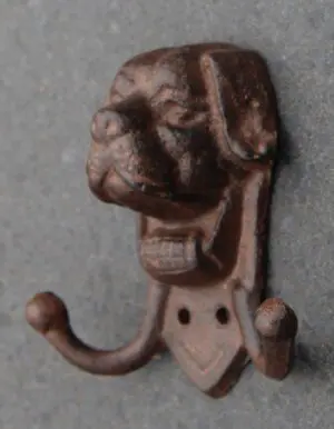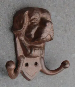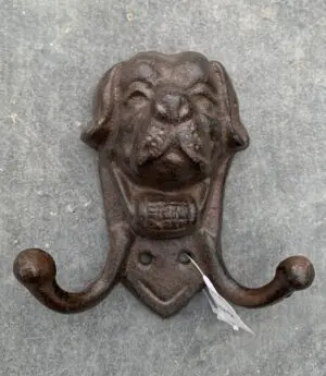 Een gietijzeren haak met aan de bovenzijde een kop van een hond.