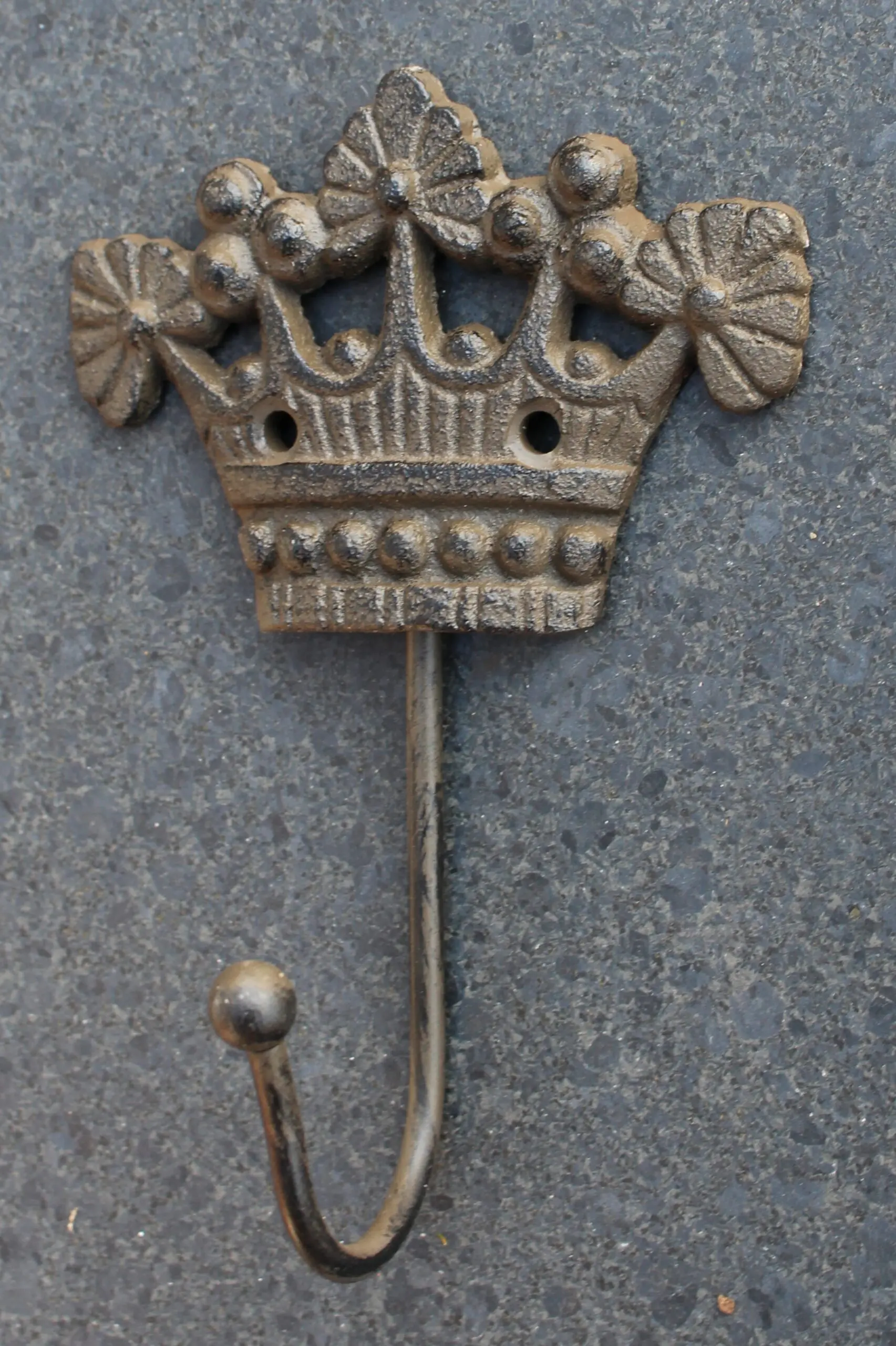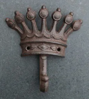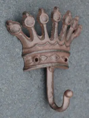 Mooie gietijzeren kapstokhaak met (halve) kroon als aanzicht.