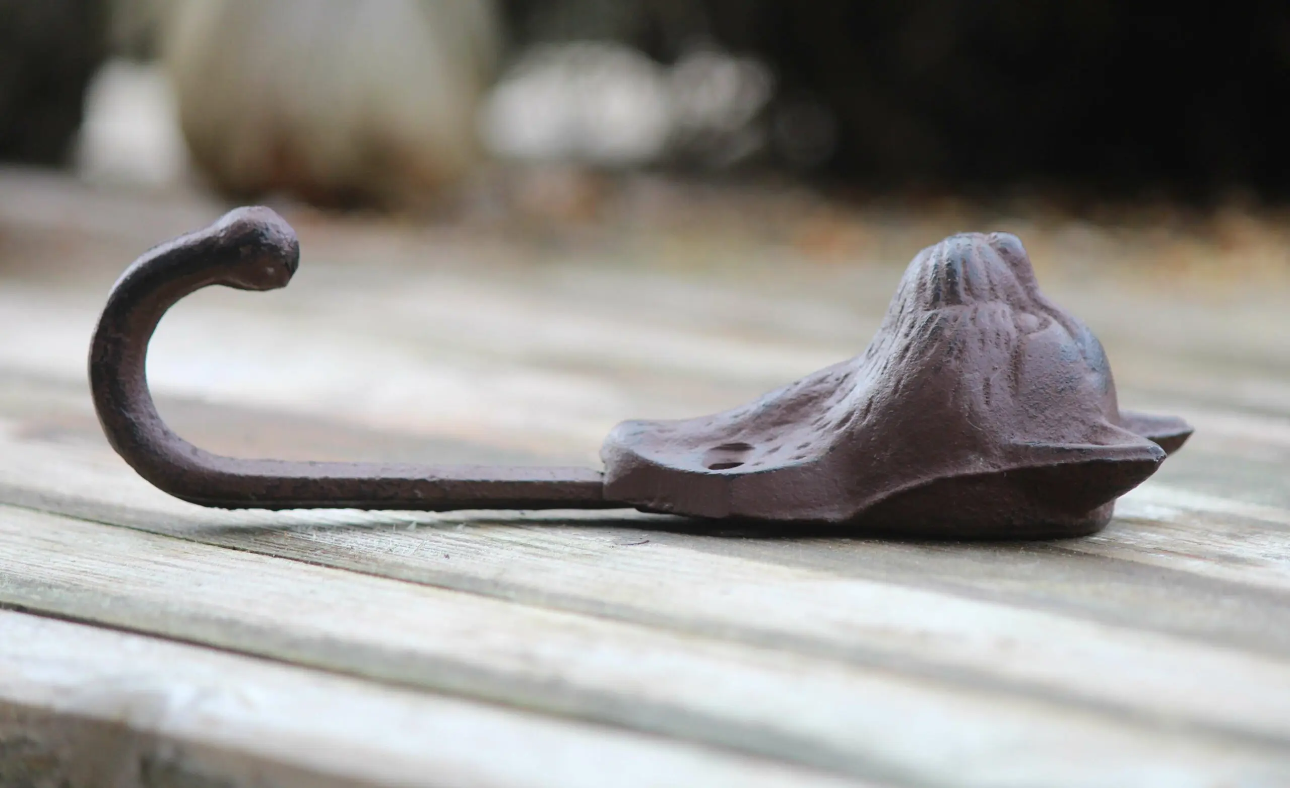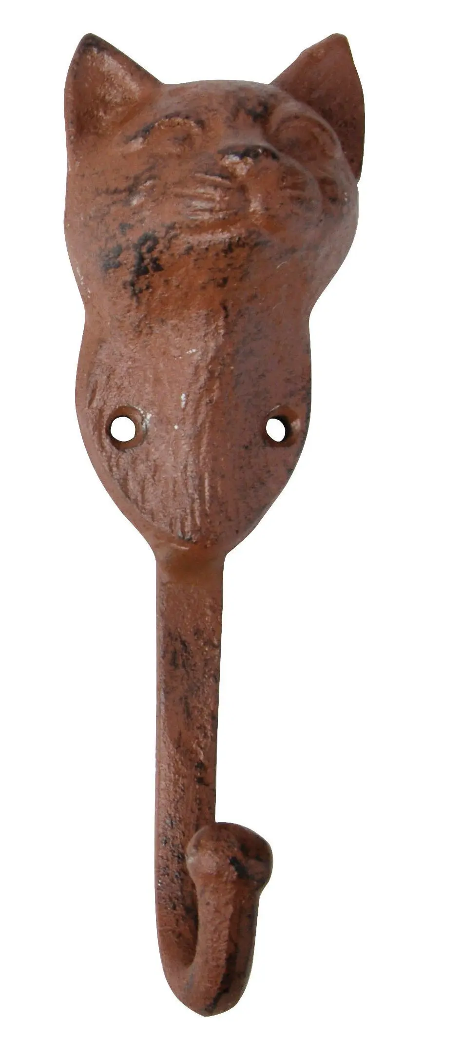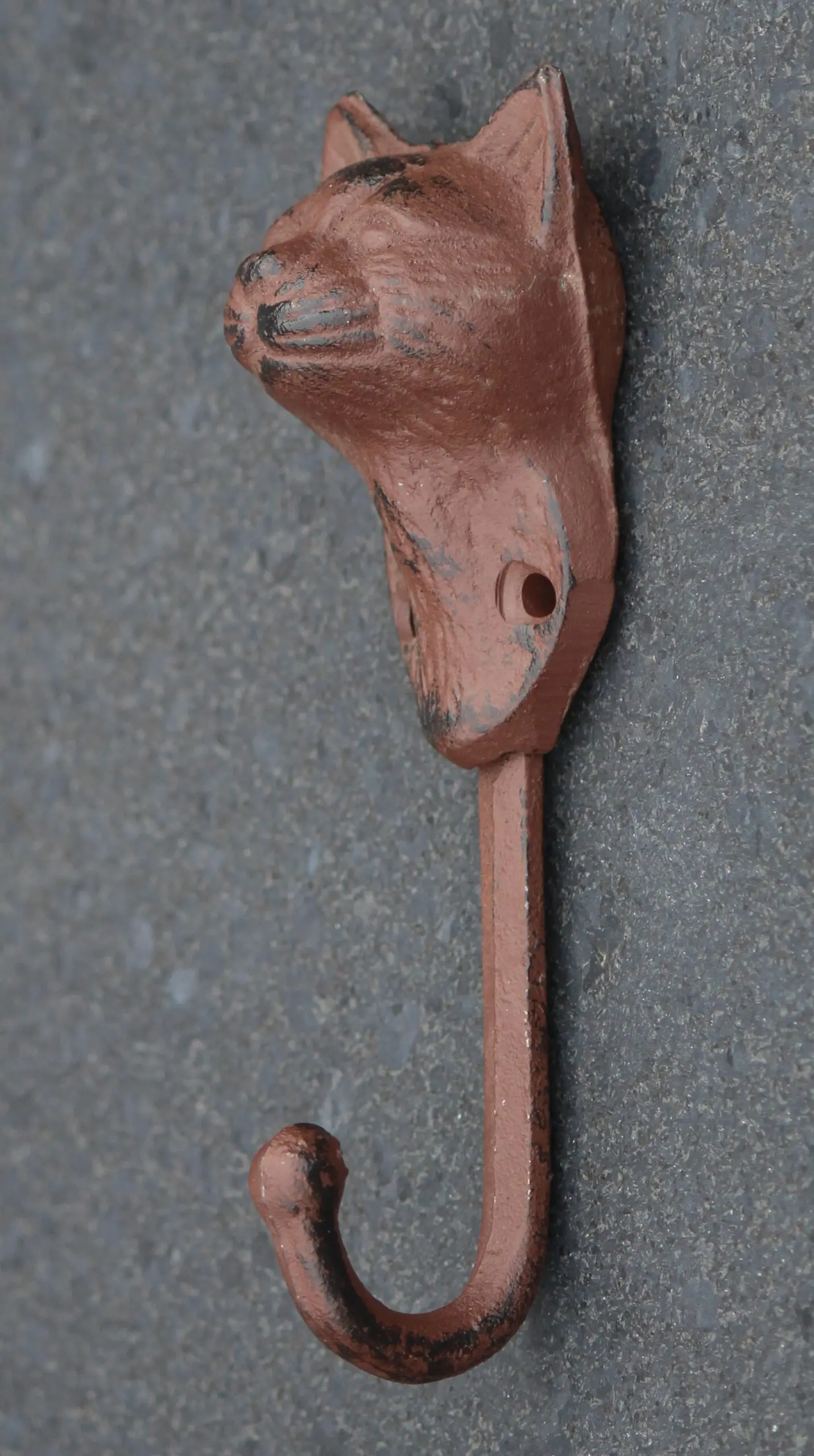 Een gietijzeren kapstokhaak met aan de bovenzijde een kop van een poes.