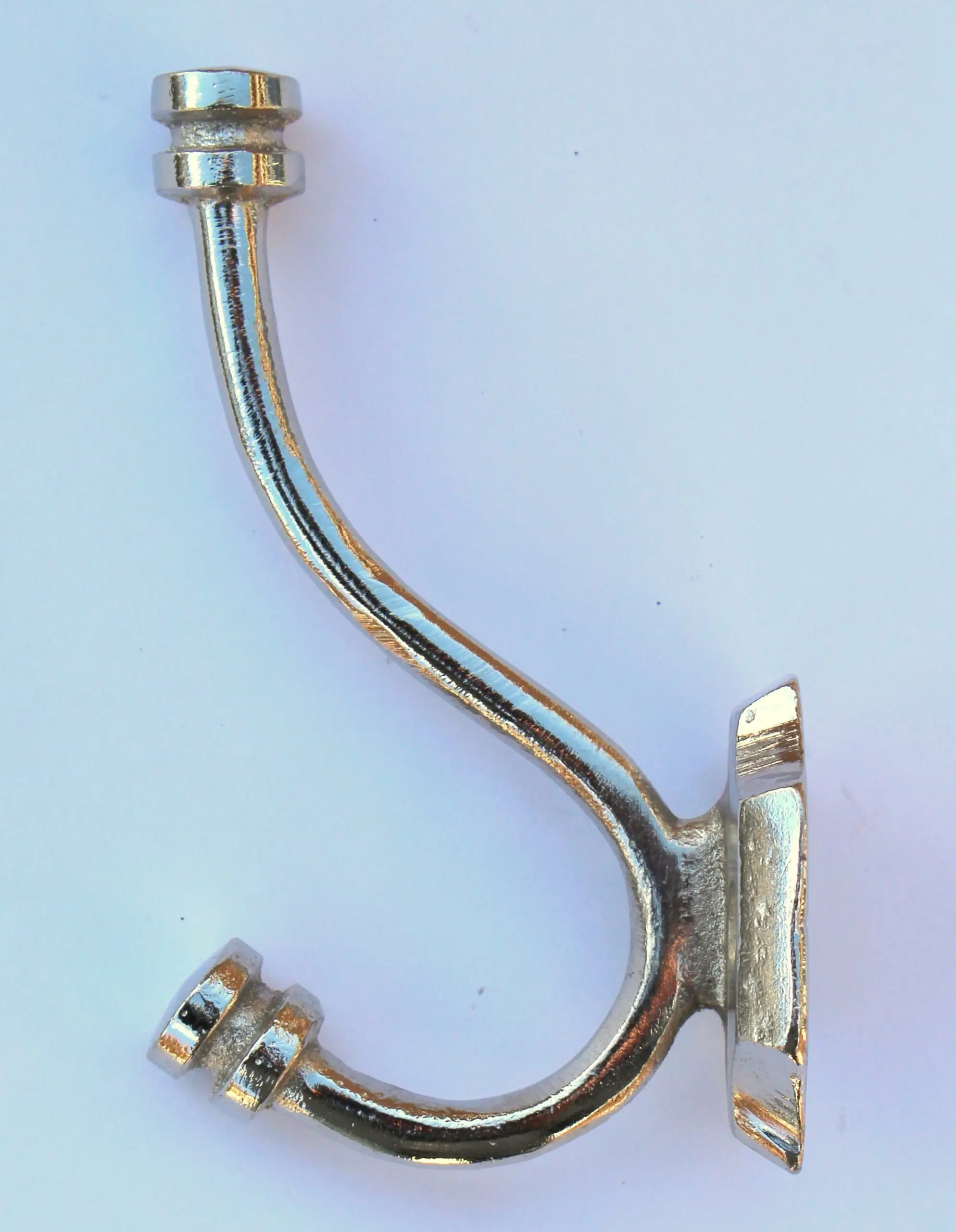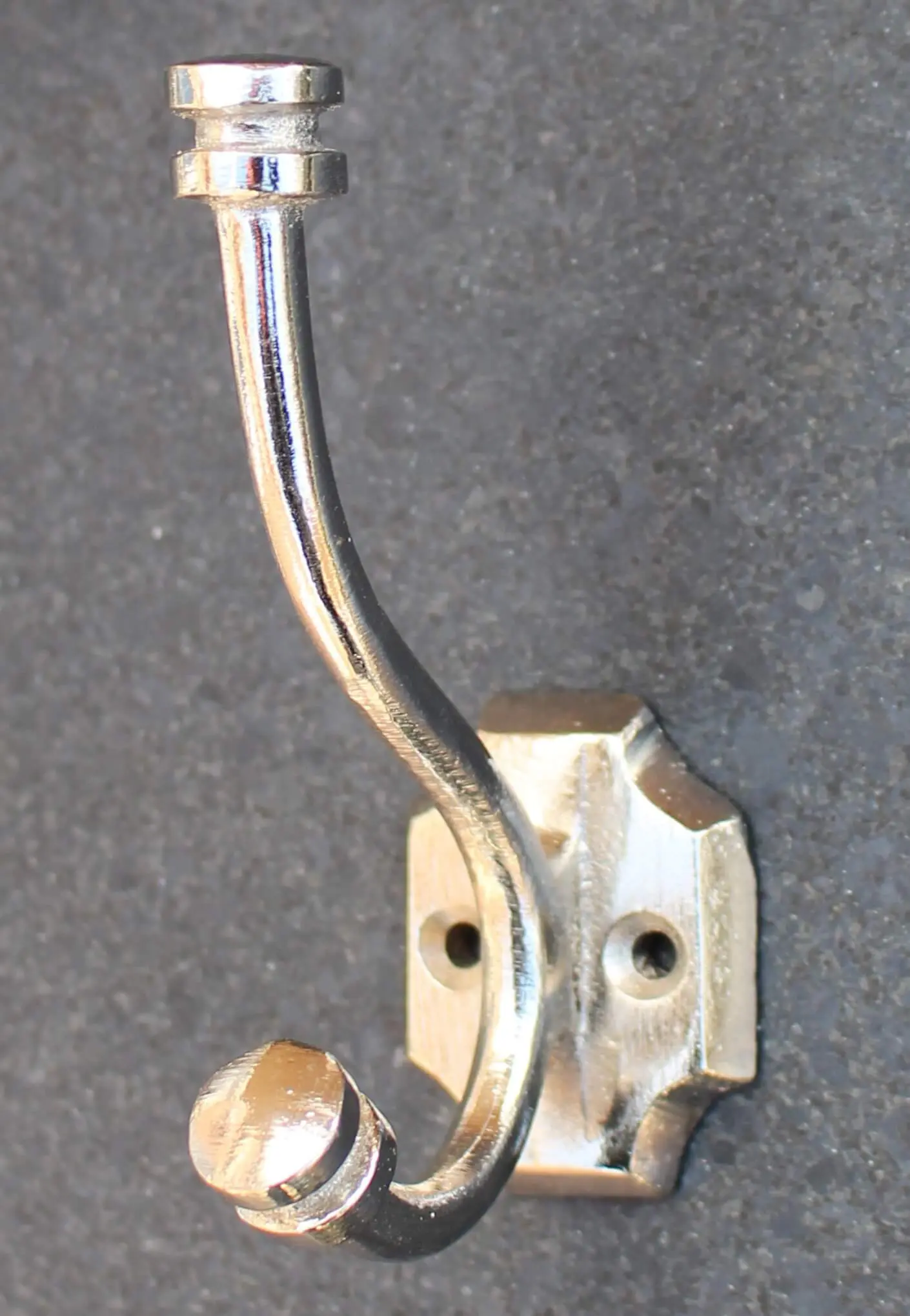 Zilverkleurige gietijzeren kapstokhaak met dubbele haak en kleine wandplaat.